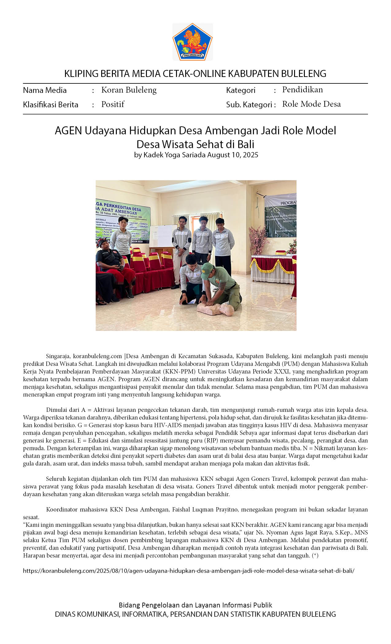 AGEN UDAYANA HIDUPKAN DESA AMBENGAN JADI ROLE MODEL DESA WISATA SEHAT DI BALI