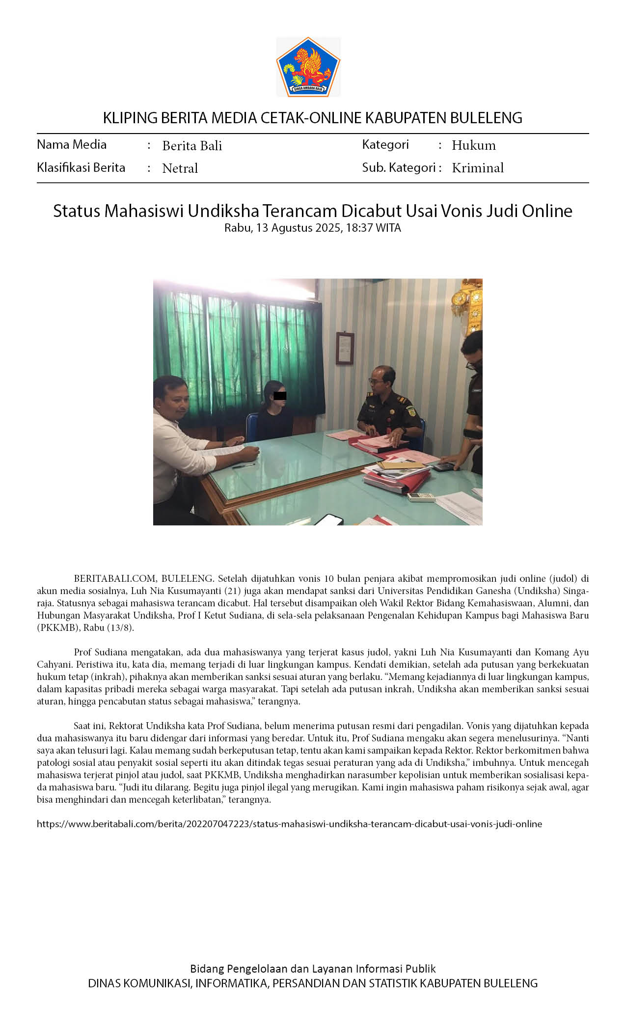 STATUS MAHASISWI UNDIKSHA TERANCAM DICABUT USAI VONIS JUDI ONLINE