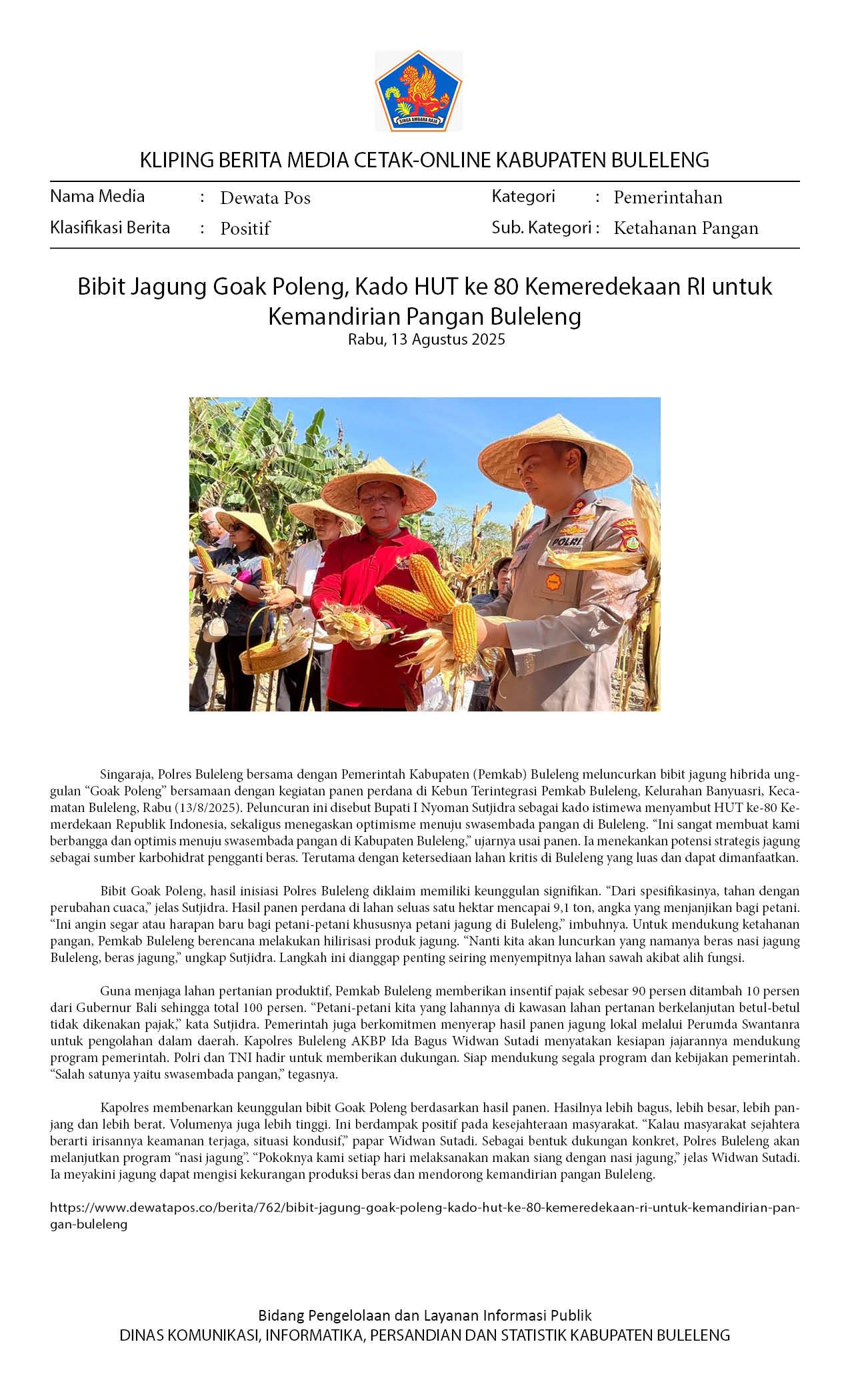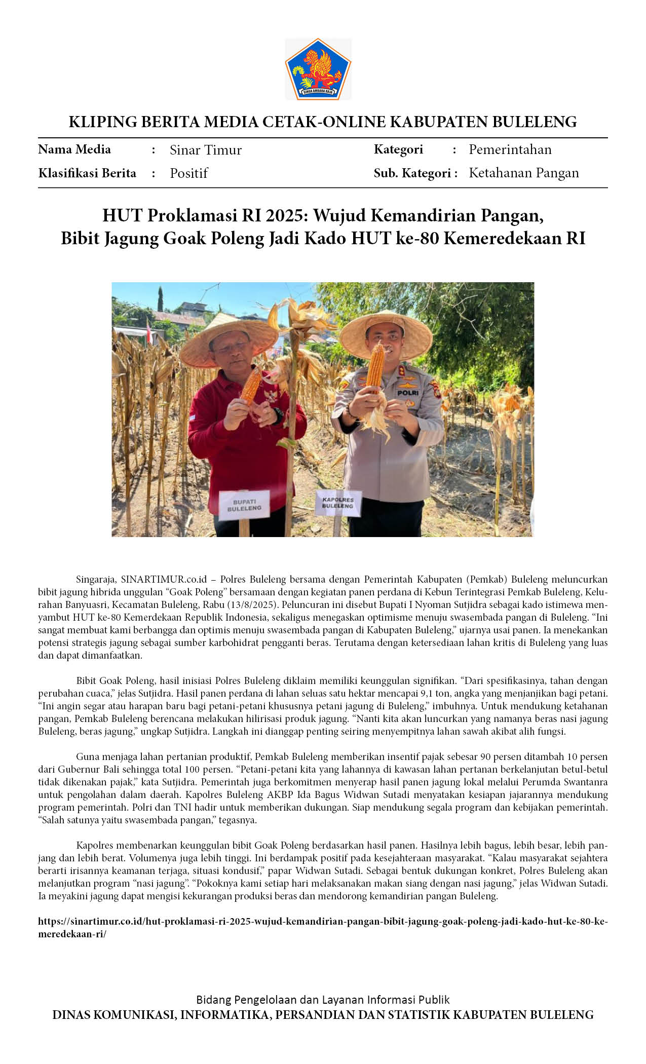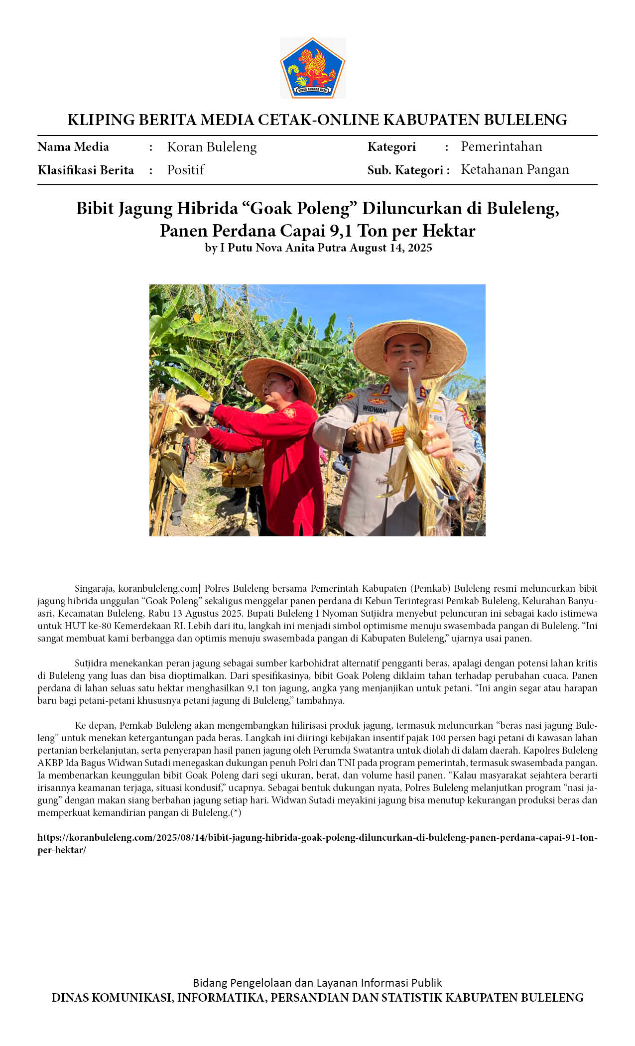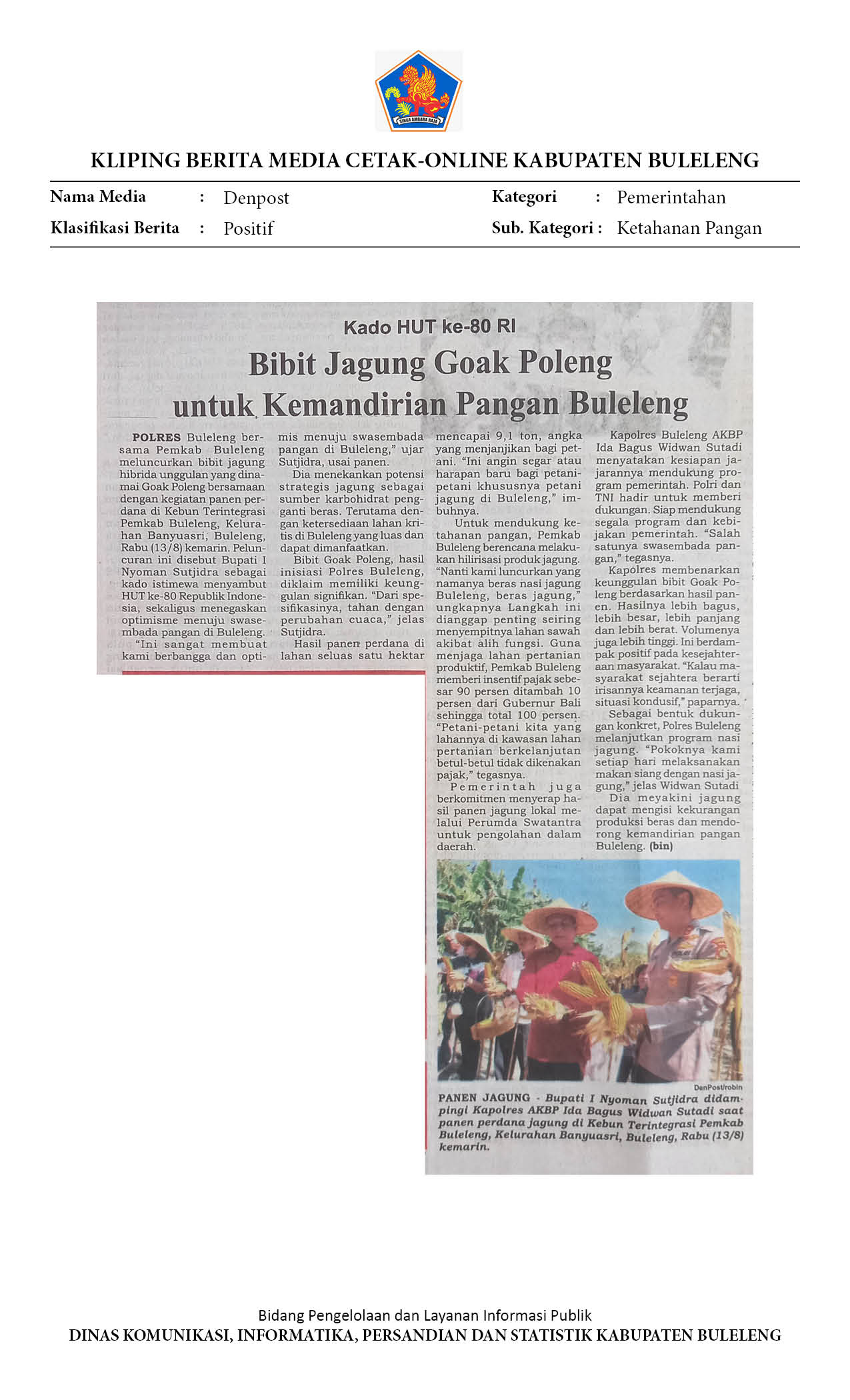 BIBIT JAGUNG GOAK POLENG, KADO HUT KE 80 KEMEREDEKAAN RI UNTUK KEMANDIRIAN PANGAN BULELENG