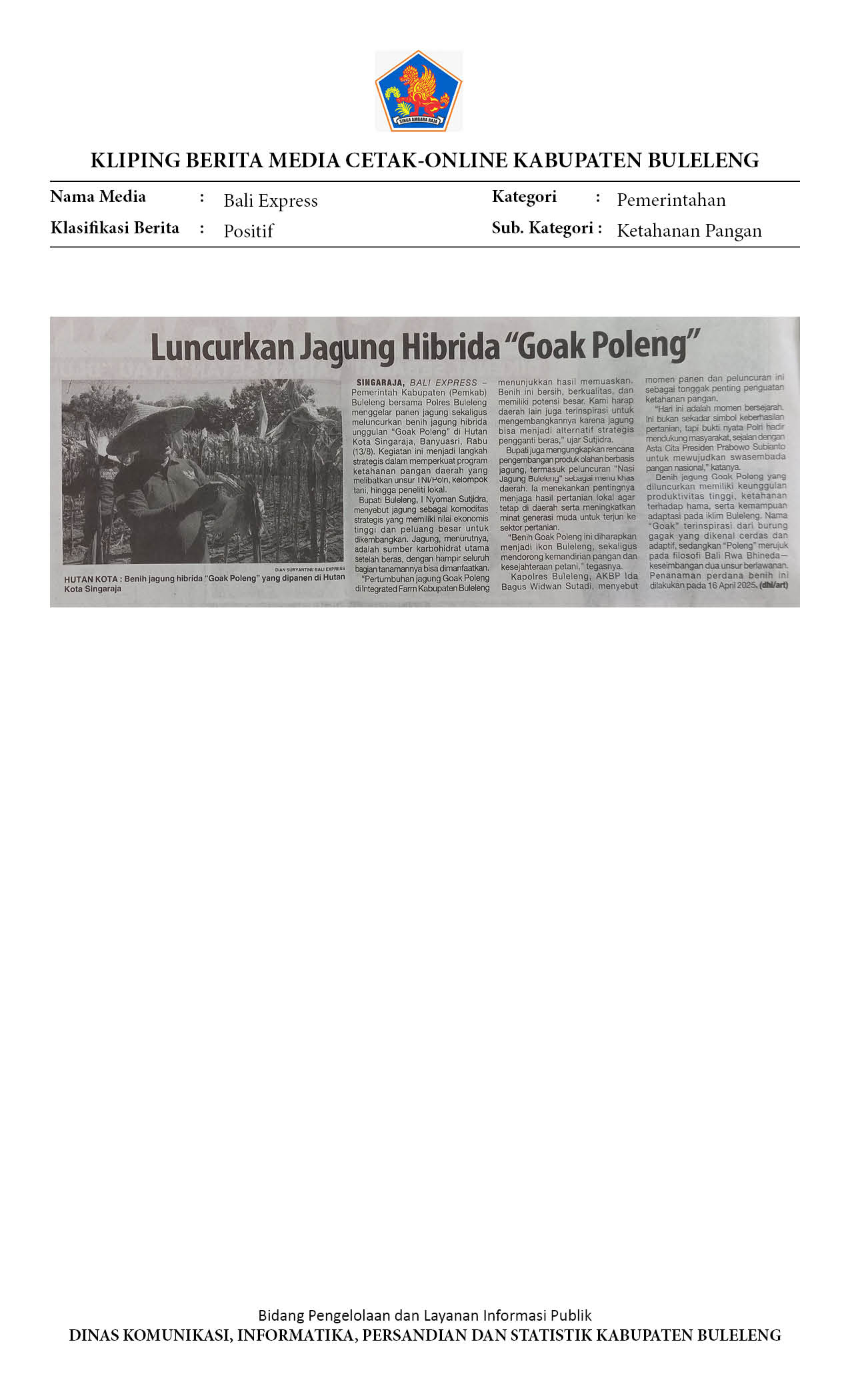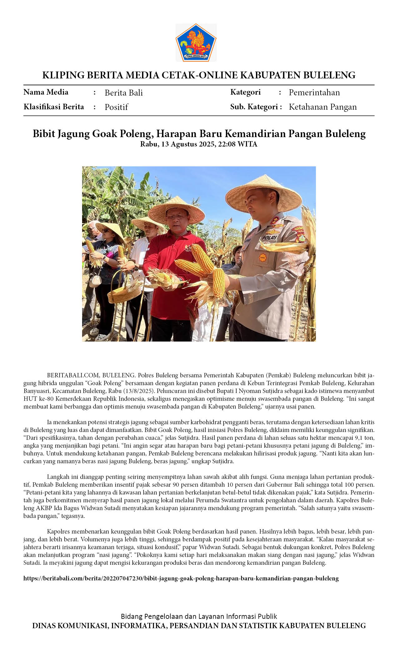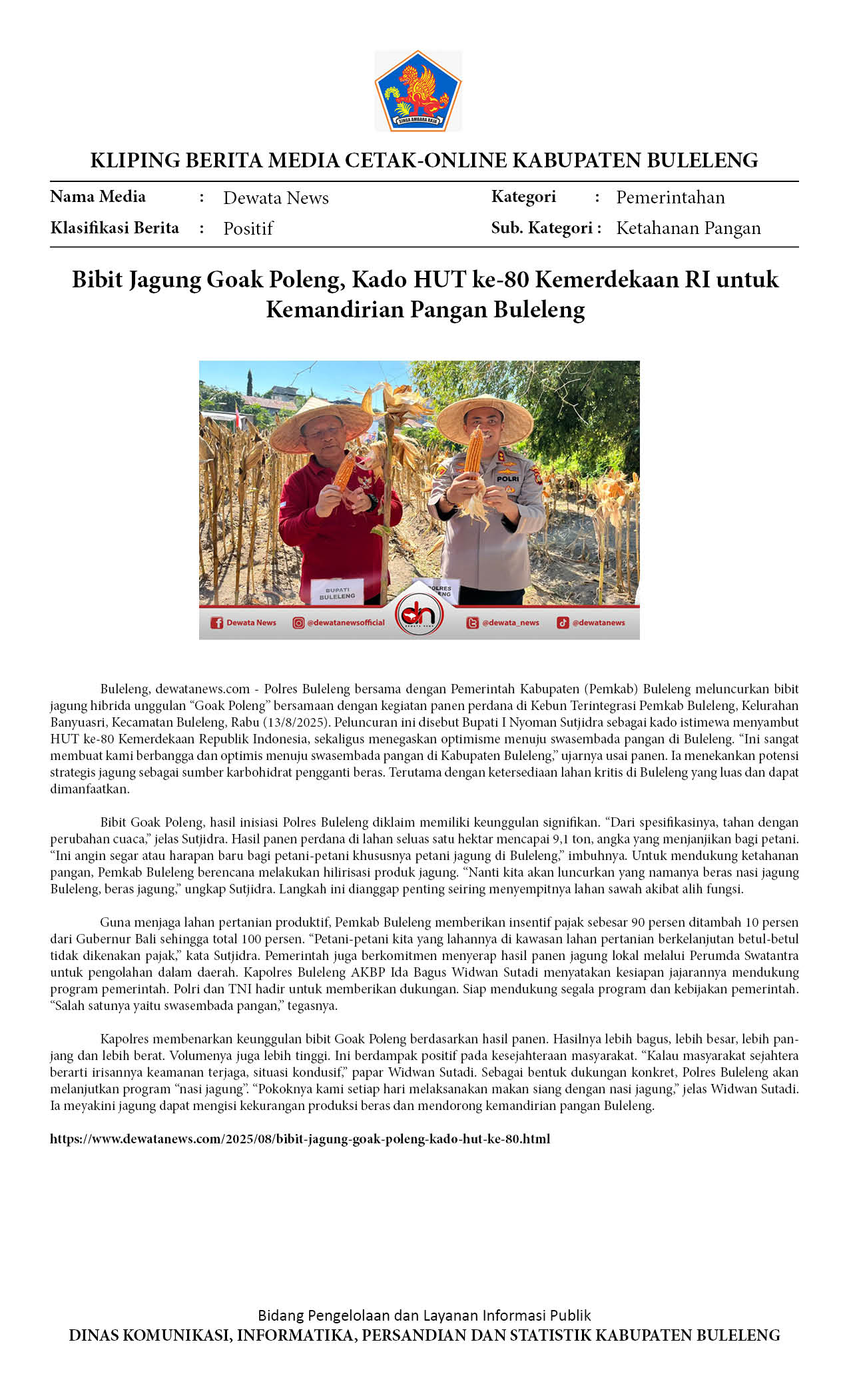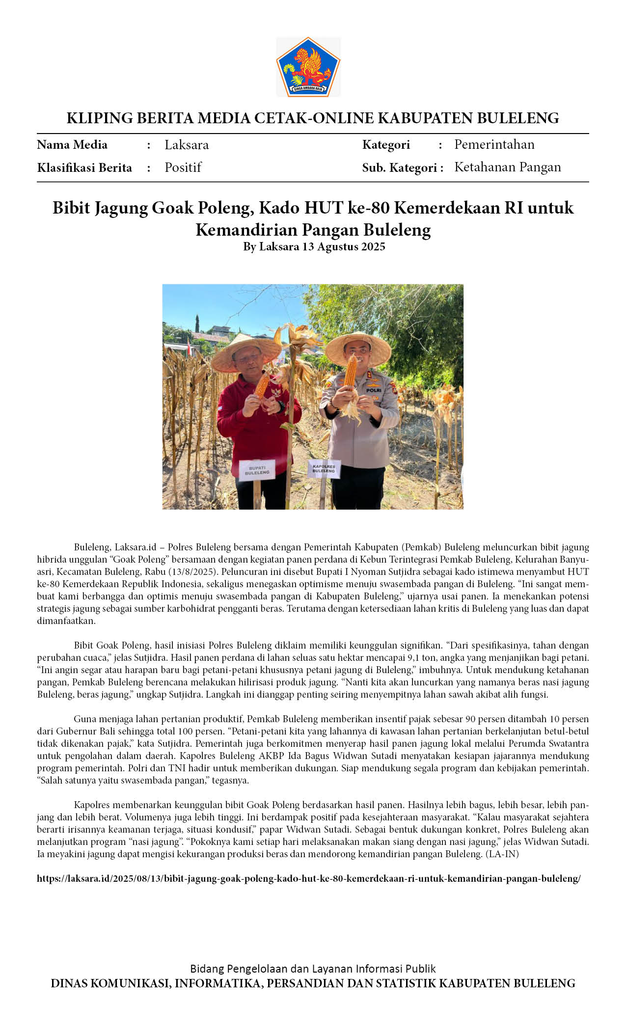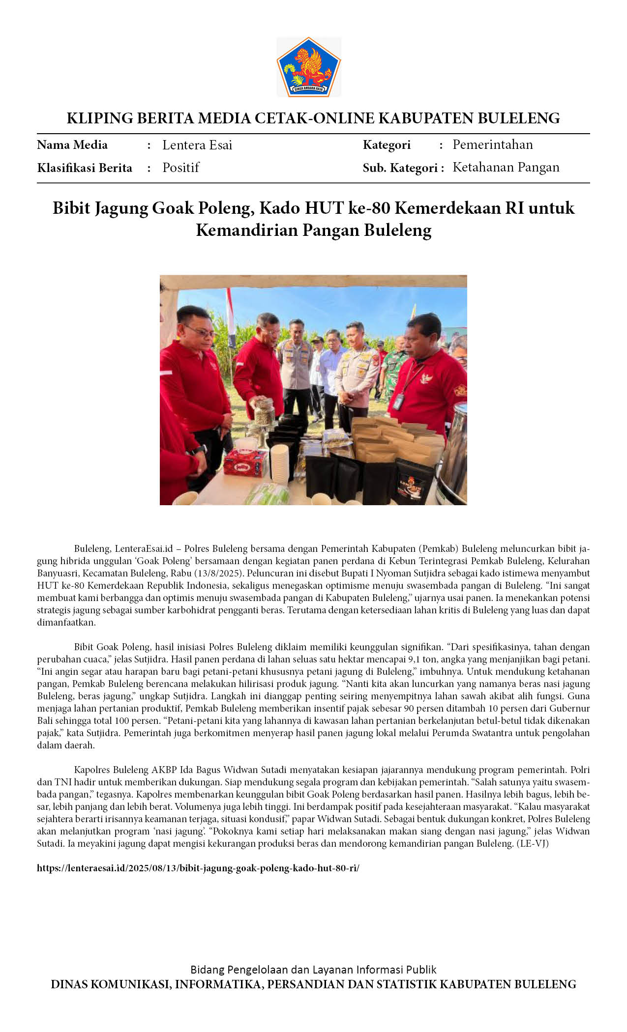 BIBIT JAGUNG GOAK POLENG, KADO HUT KE 80 KEMEREDEKAAN RI UNTUK KEMANDIRIAN PANGAN BULELENG