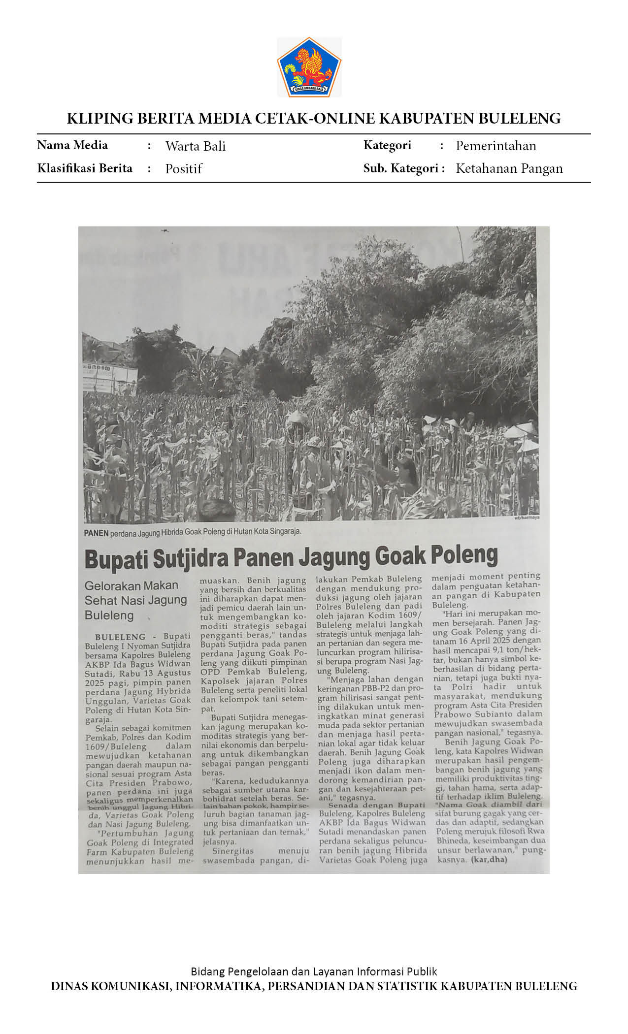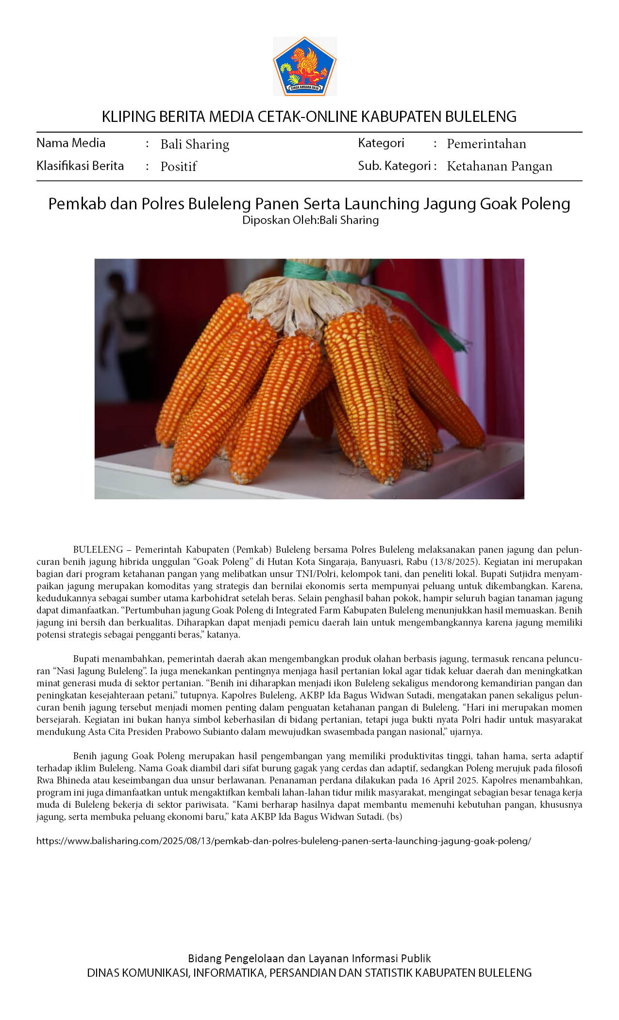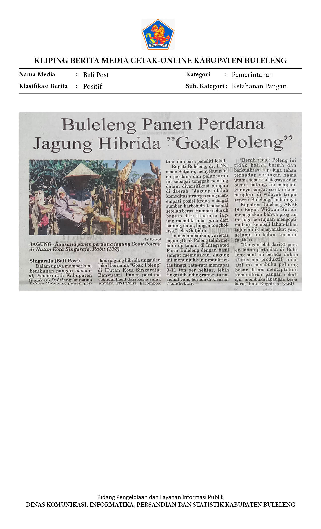 PEMKAB BULELENG DAN POLRES BULELENG PANEN SERTA LAUNCHING JAGUNG GOAK POLENG