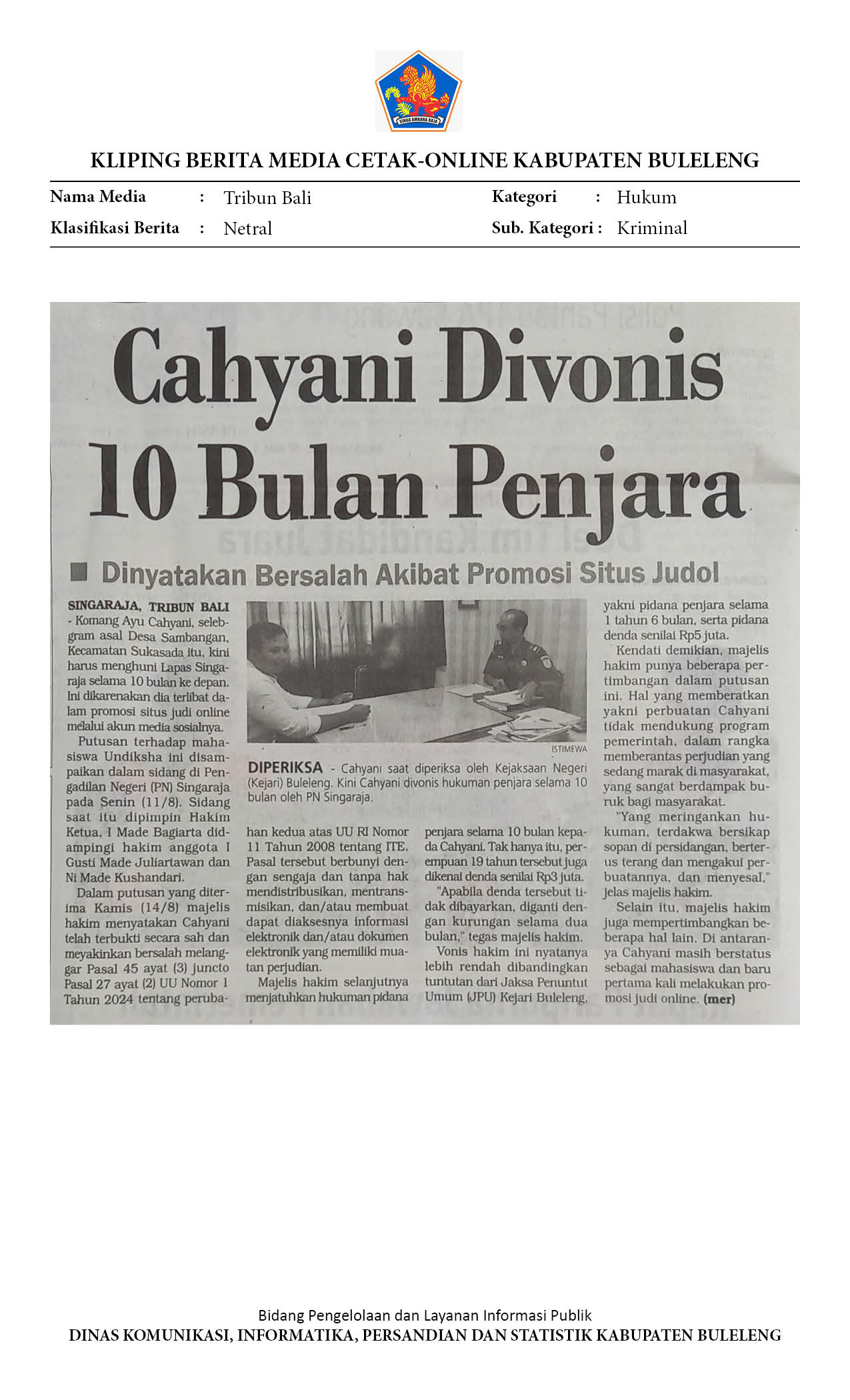 CAHYANI DIVONIS 10 BULAN PENJARA