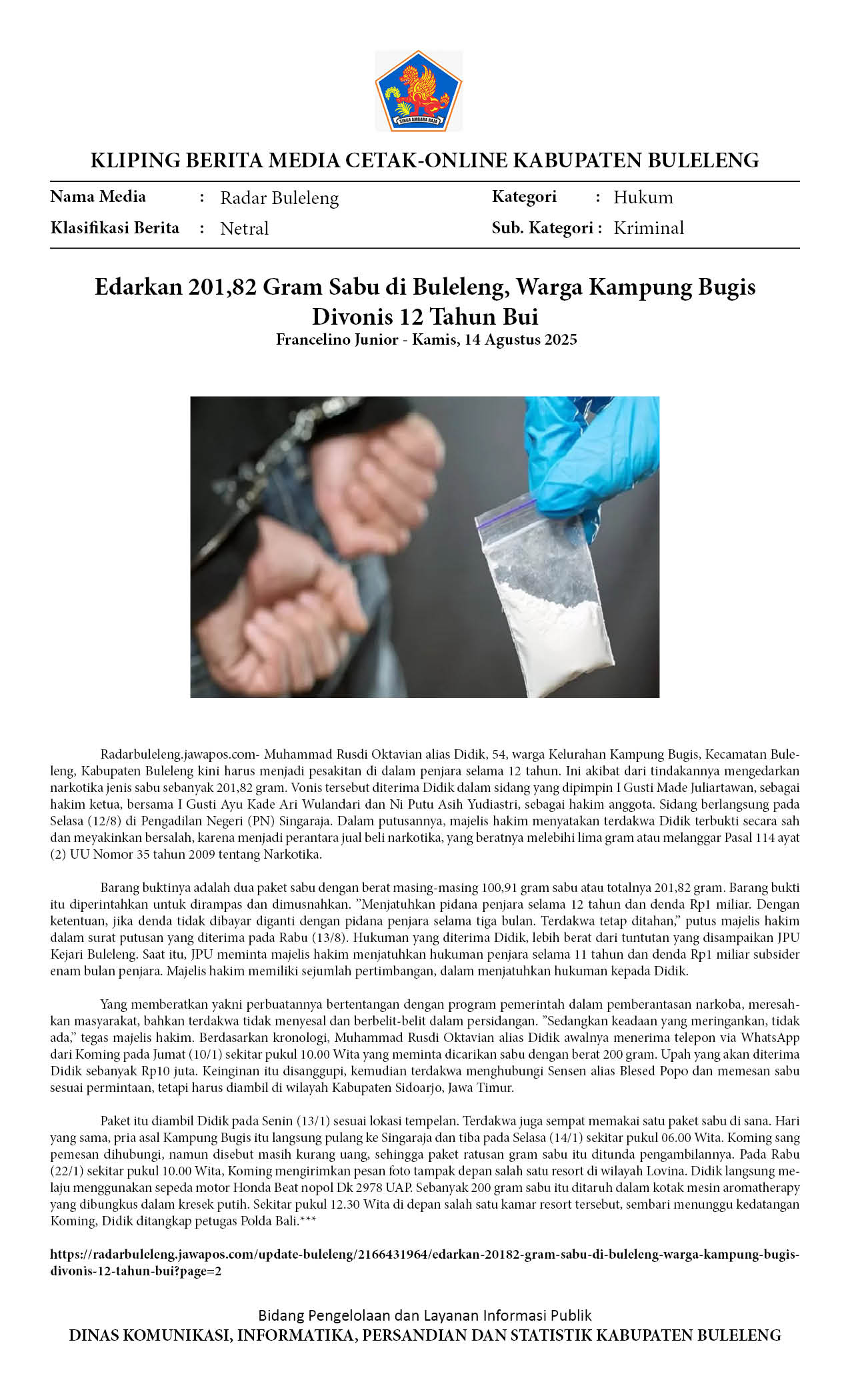 EDARKAN 201,82 GRAM SABU DI BULELENG, WARGA KAMPUNG BUGIS DIVONIS 12 TAHUN BUI