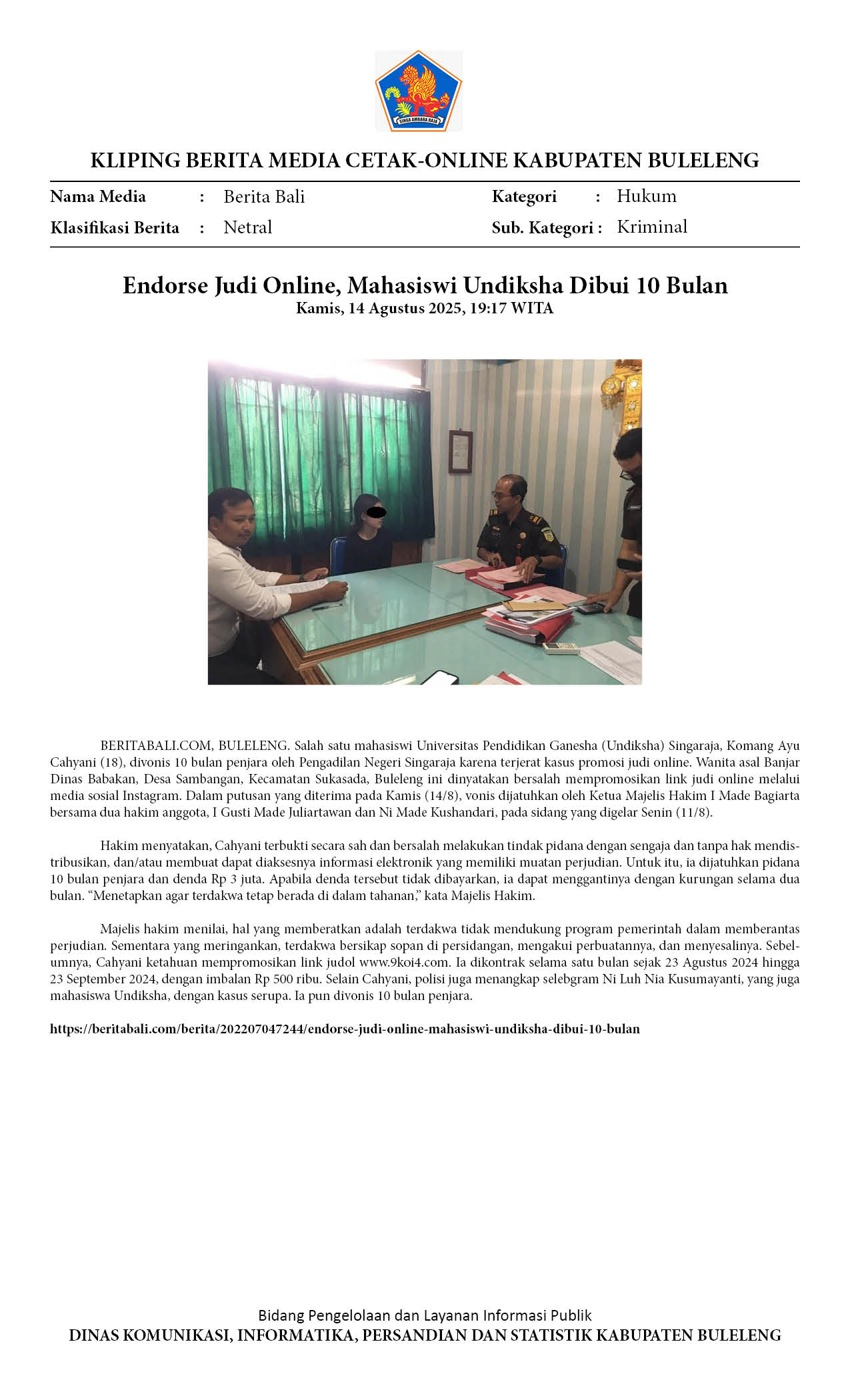 ENDORSE JUDI ONLINE, MAHASISWI UNDIKSHA DIBUI 10 BULAN