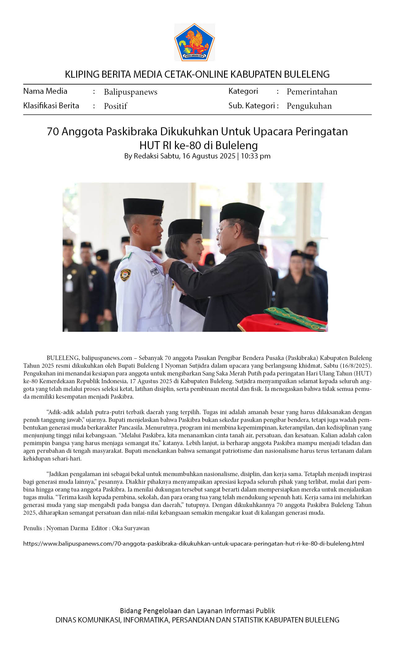 70 ANGGOTA PASKIBRAKA DIKUKUHKAN UNTUK UPACARA PERINGATAN HUT RI KE-80 DI BULELENG