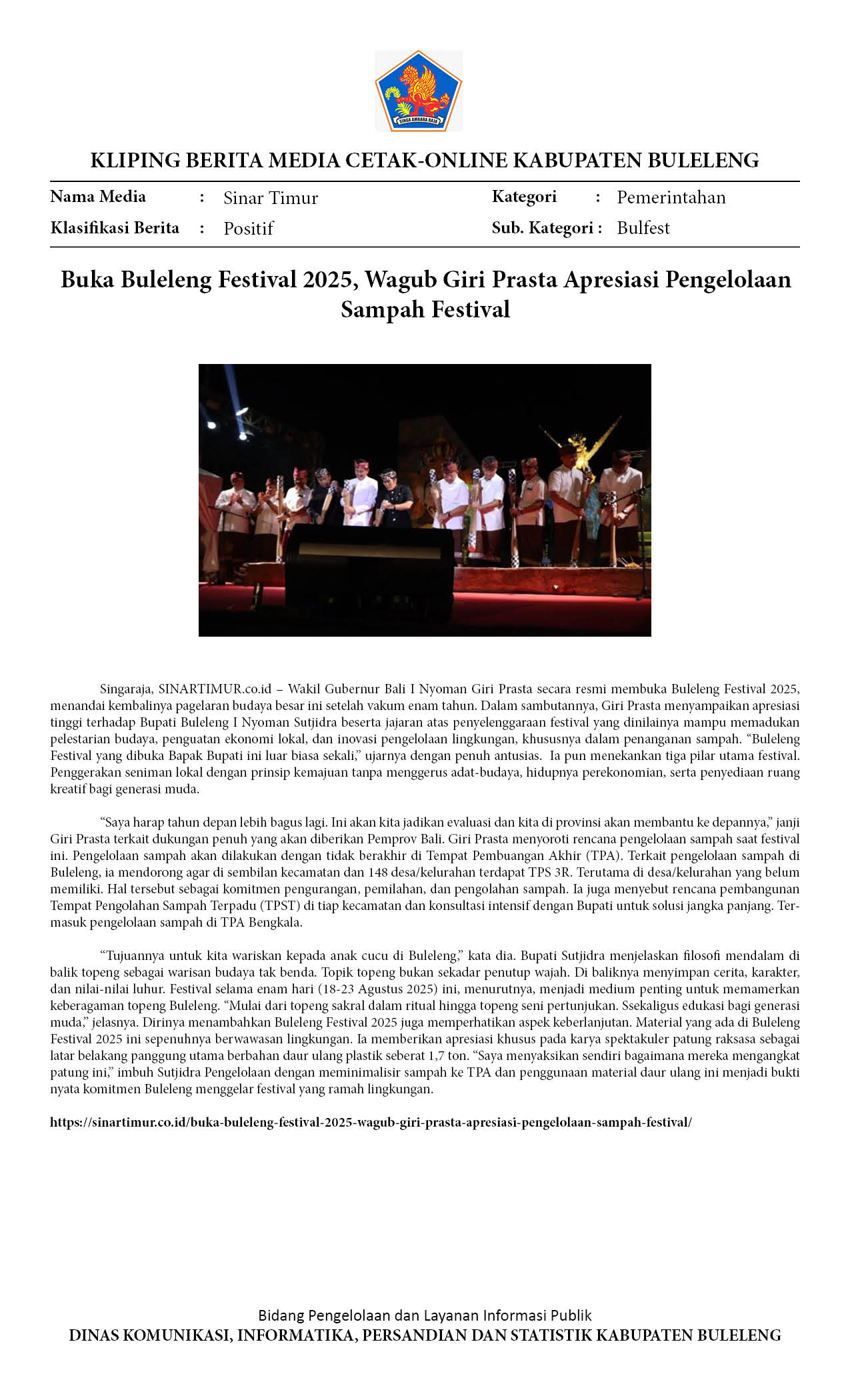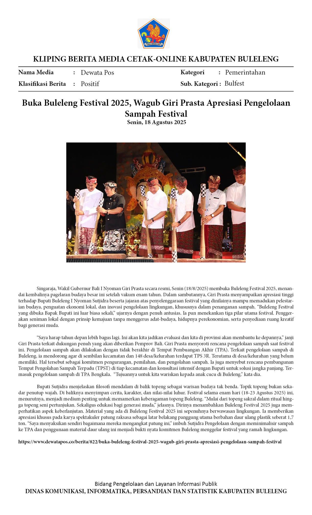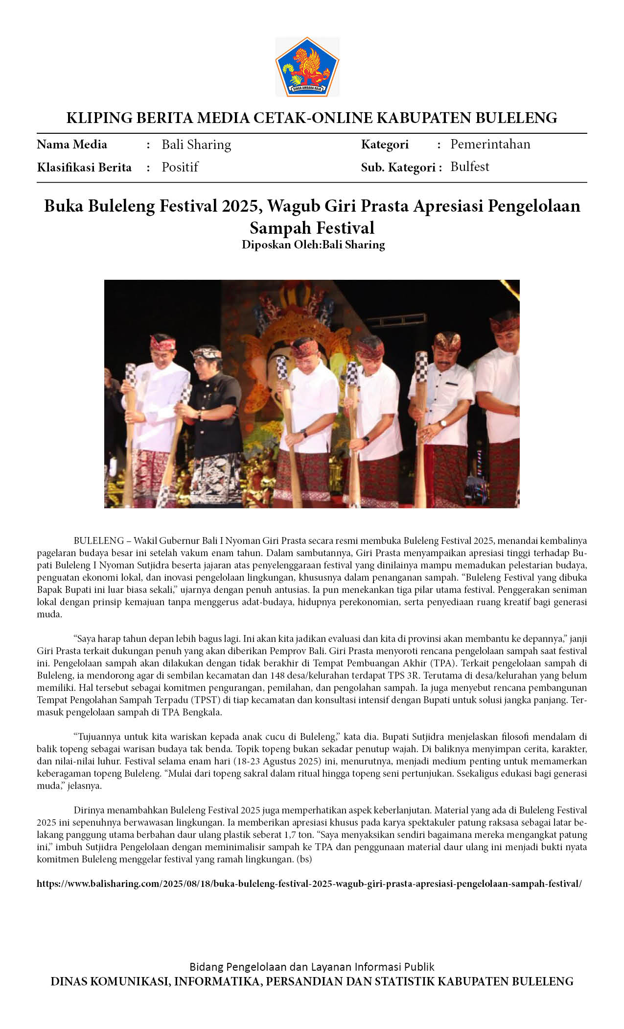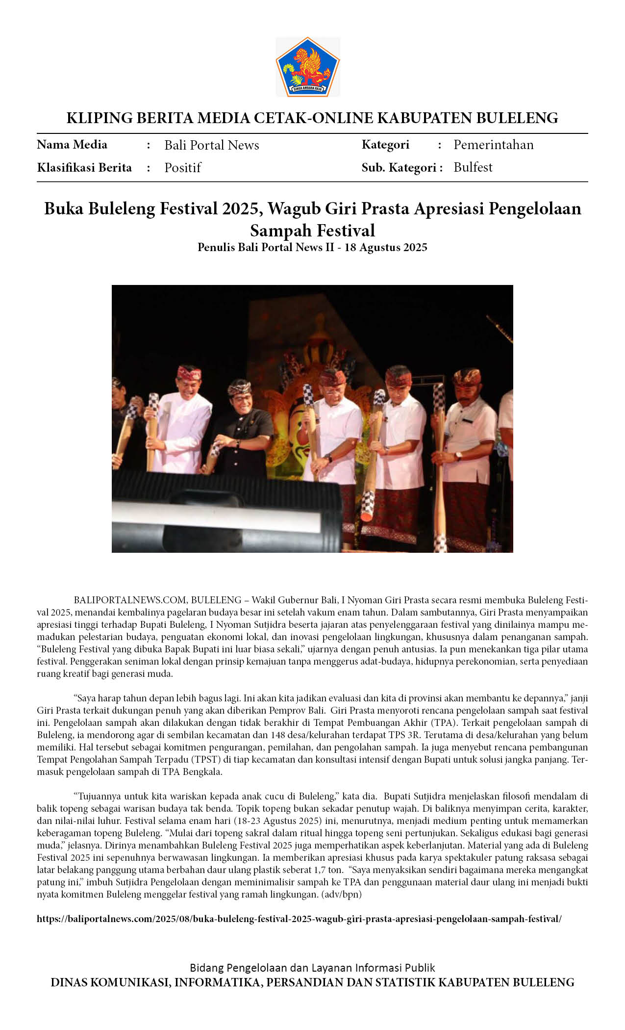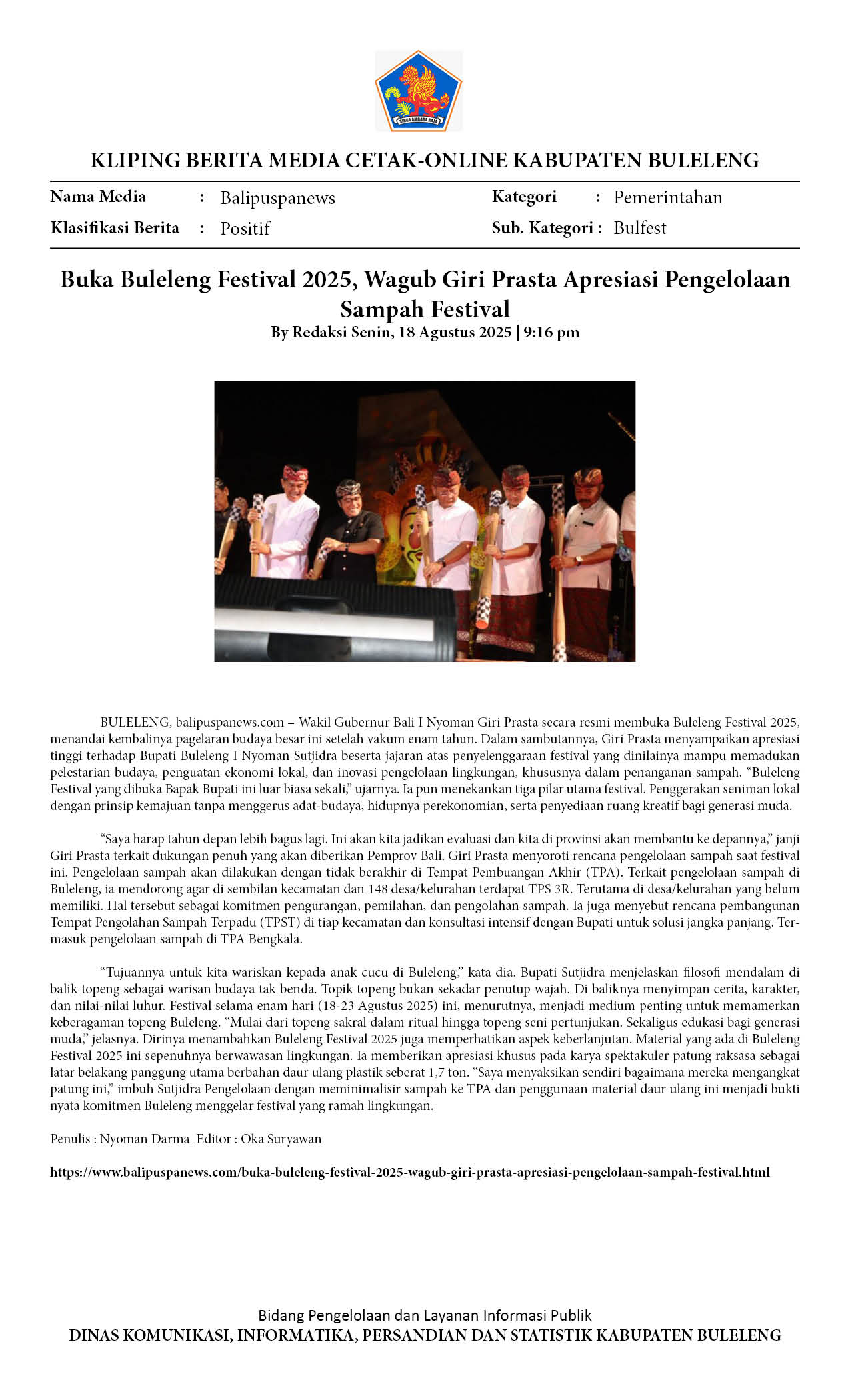BUKA BULELENG FESTIVAL 2025, WAGUB GIRI PRASTA APRESIASI PENGELOLAAN SAMPAH FESTIVAL