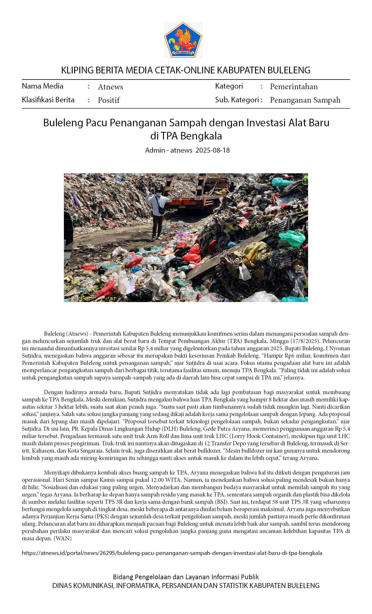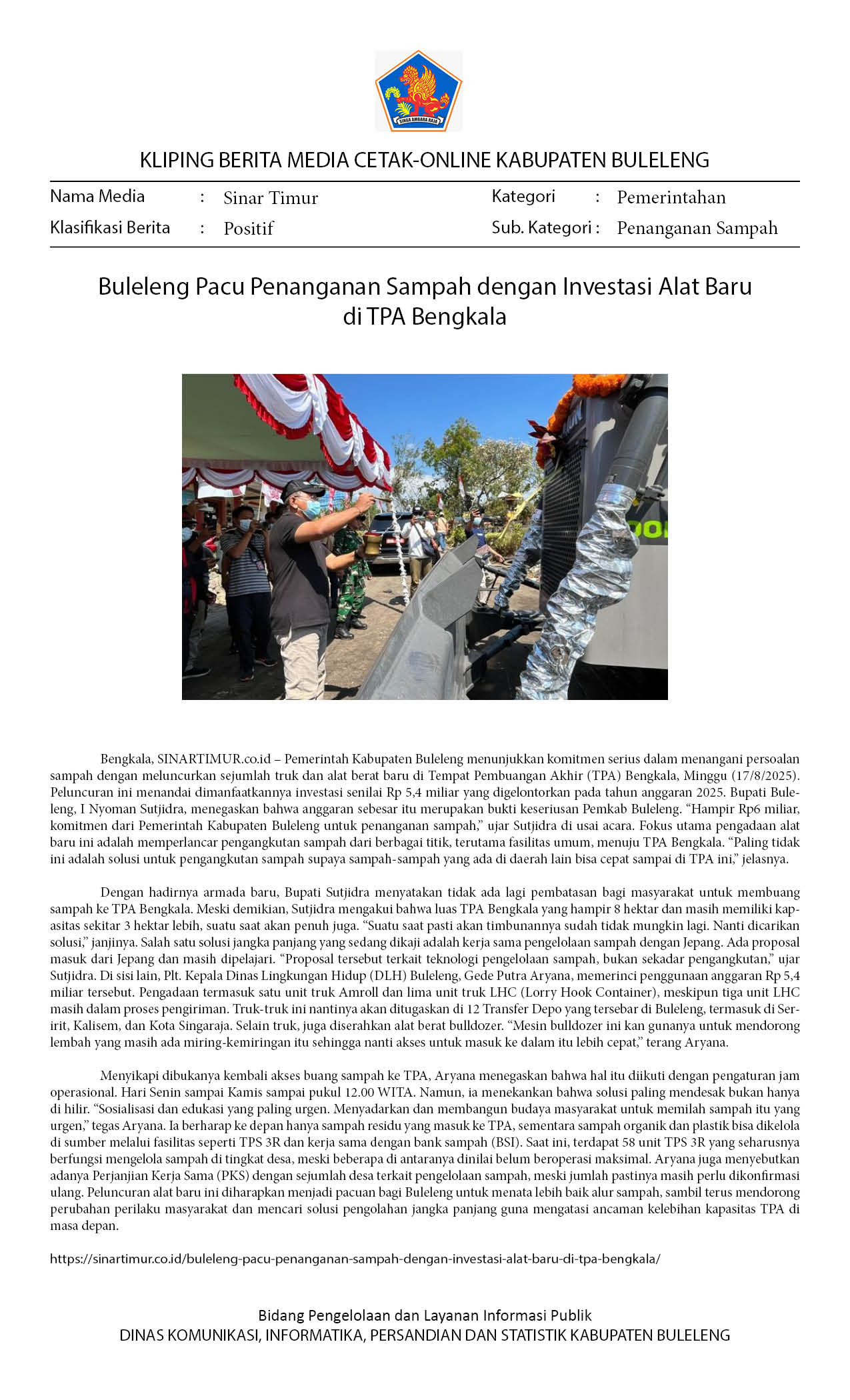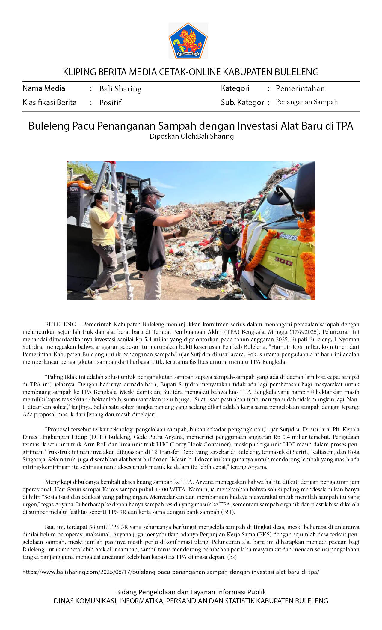 PEMKAB BULELENG PERCEPAT PENANGANAN SAMPAH LEWAT INVESTASI ALAT BARU DI TPA BENGKALA