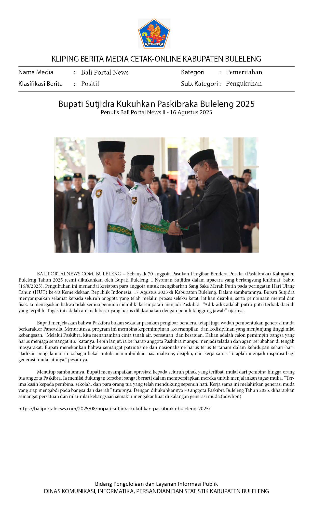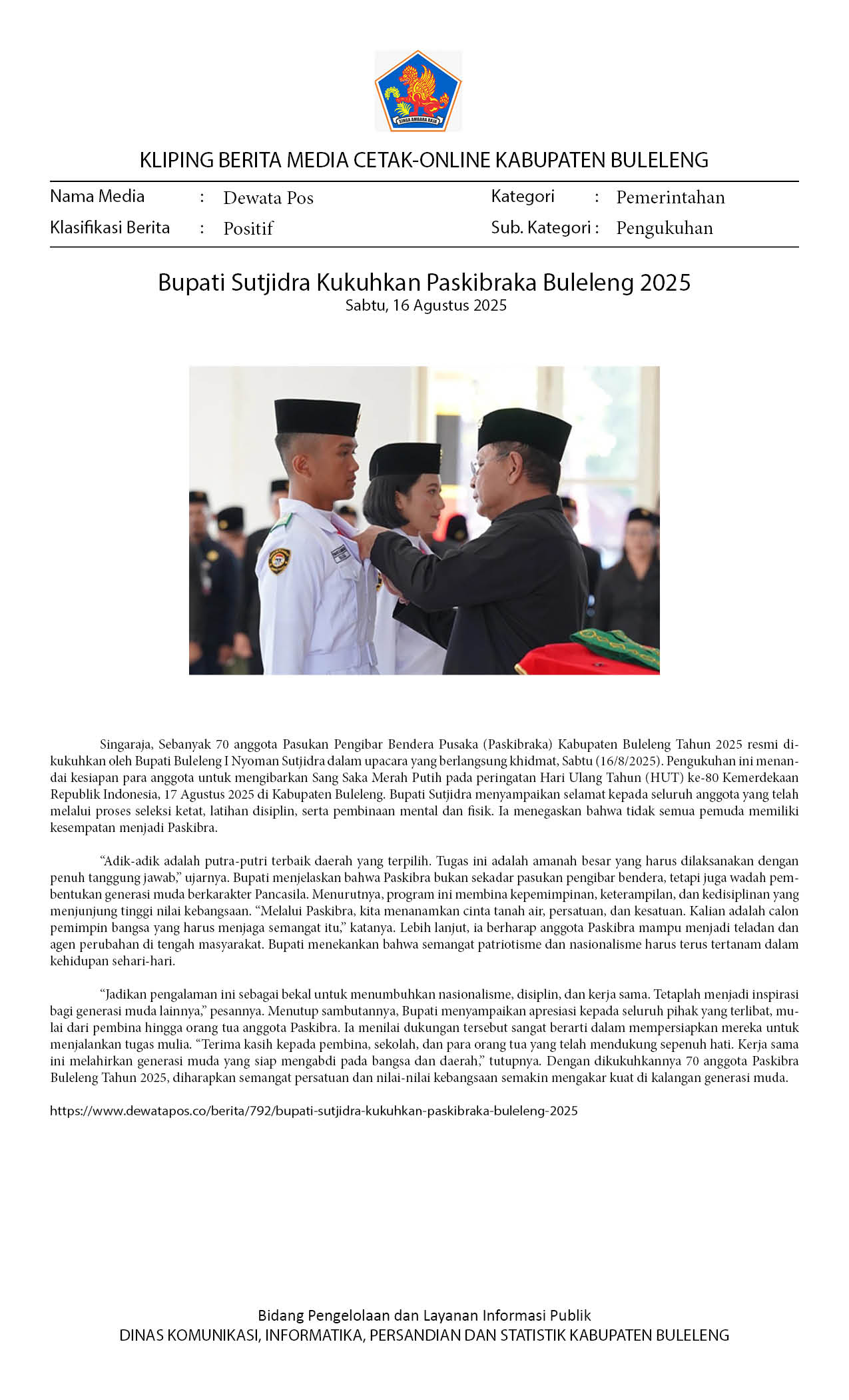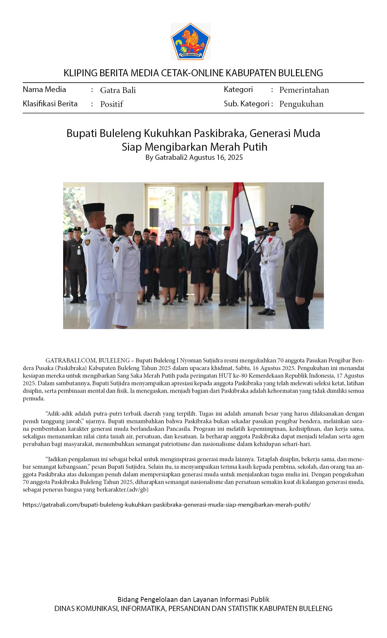 BUPATI BULELENG KUKUHKAN PASKIBRAKA, GENERASI MUDA SIAP MENGIBARKAN MERAH PUTIH