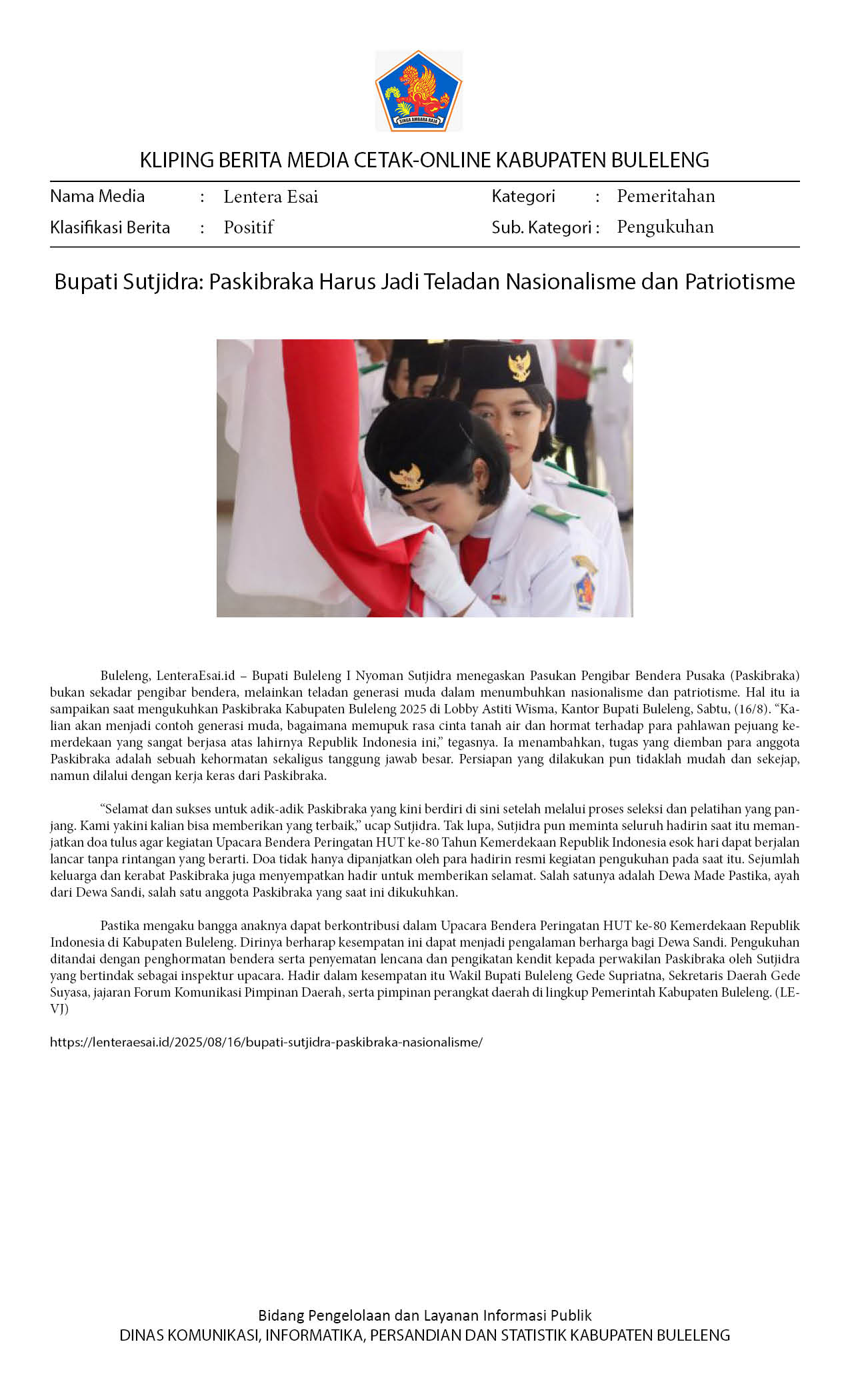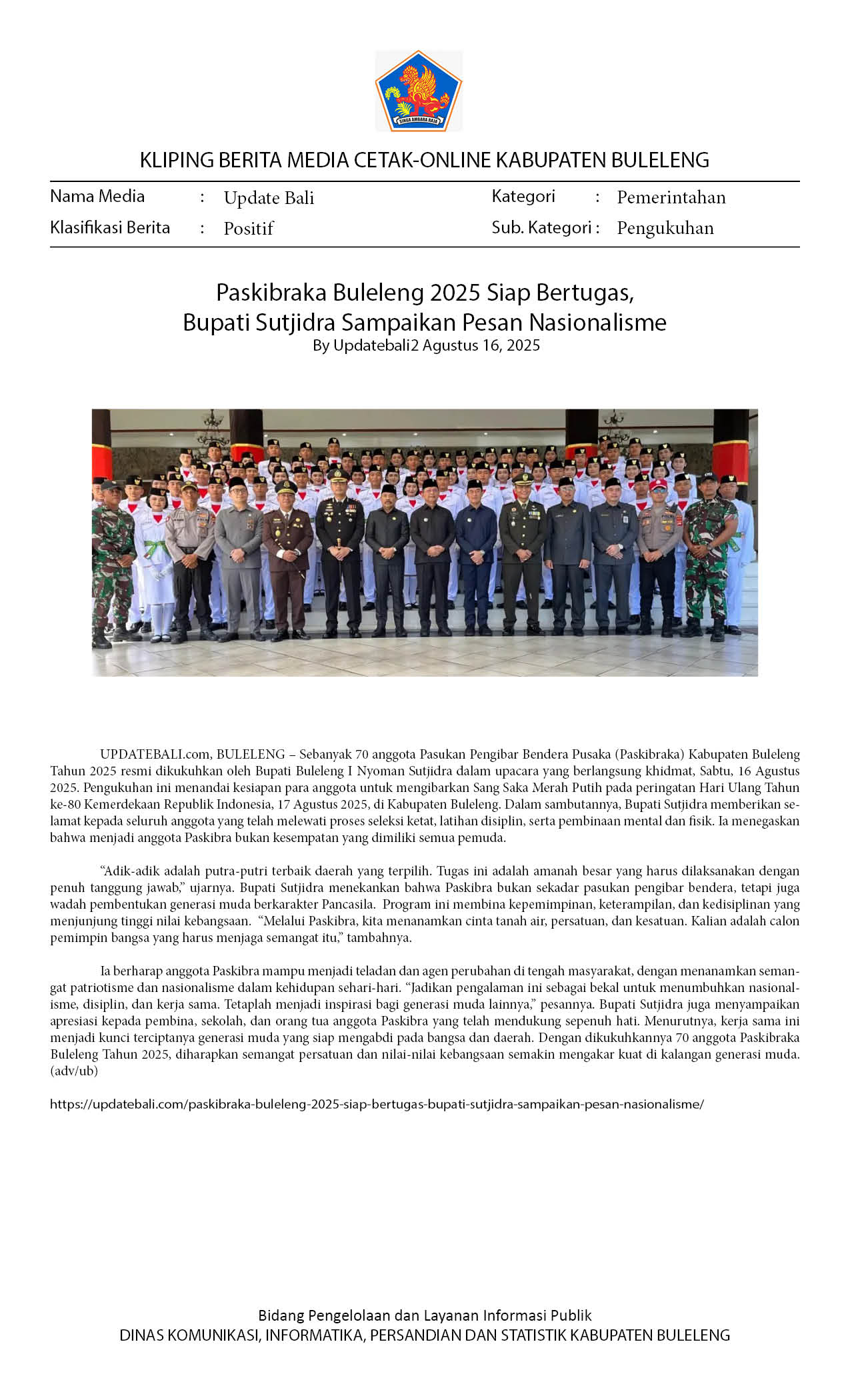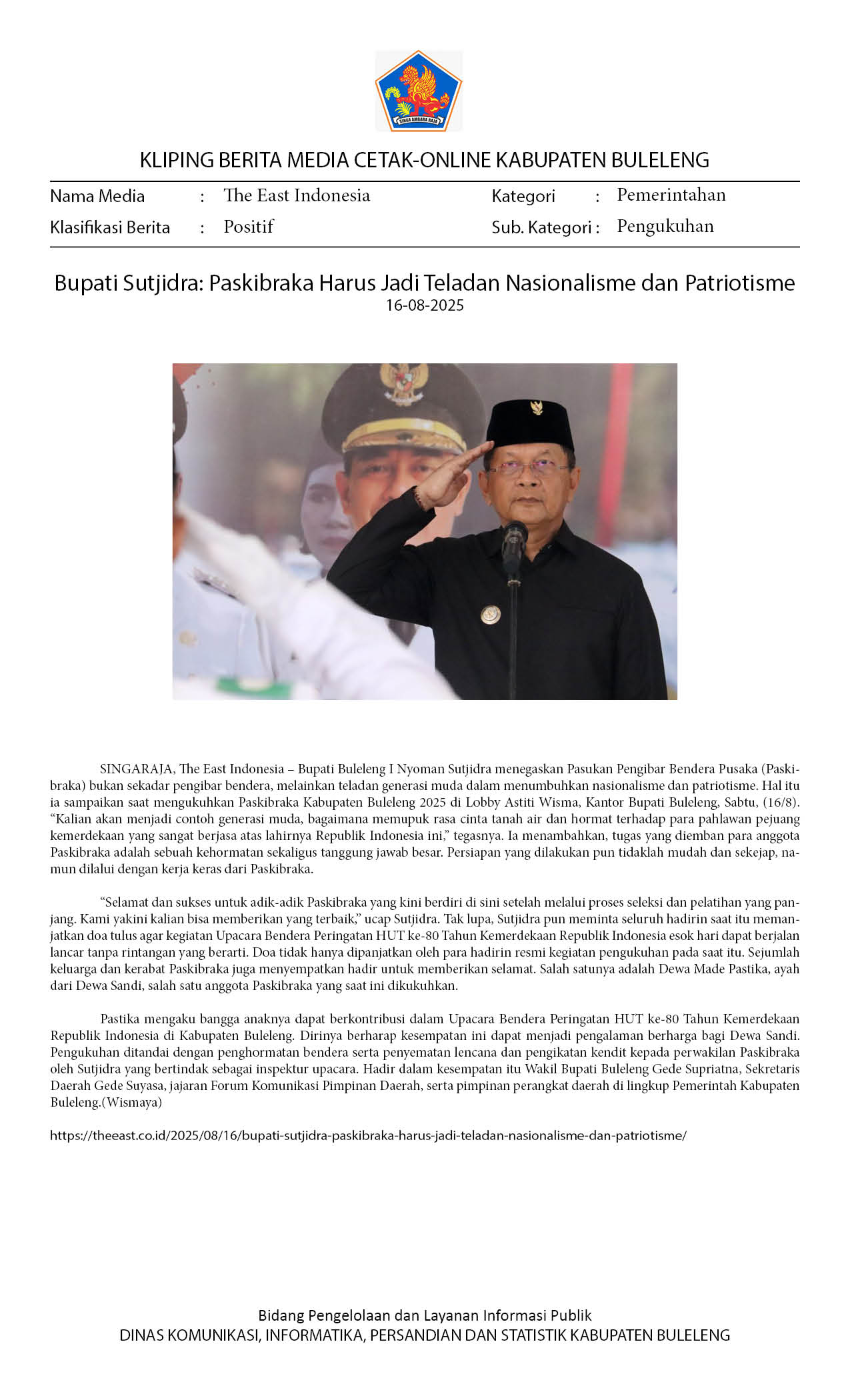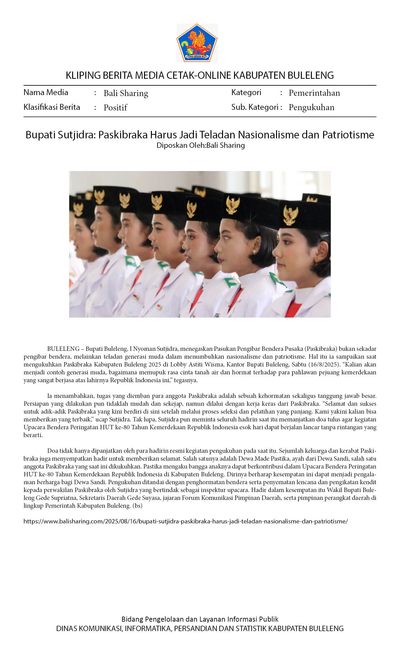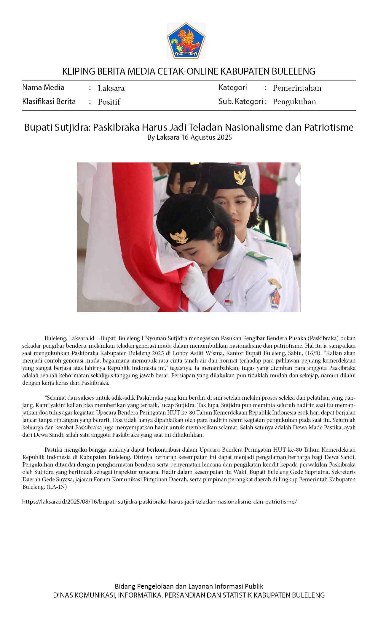 BUPATI SUTJIDRA: PASKIBRAKA HARUS JADI TELADAN NASIONALISME DAN PATRIOTISME
