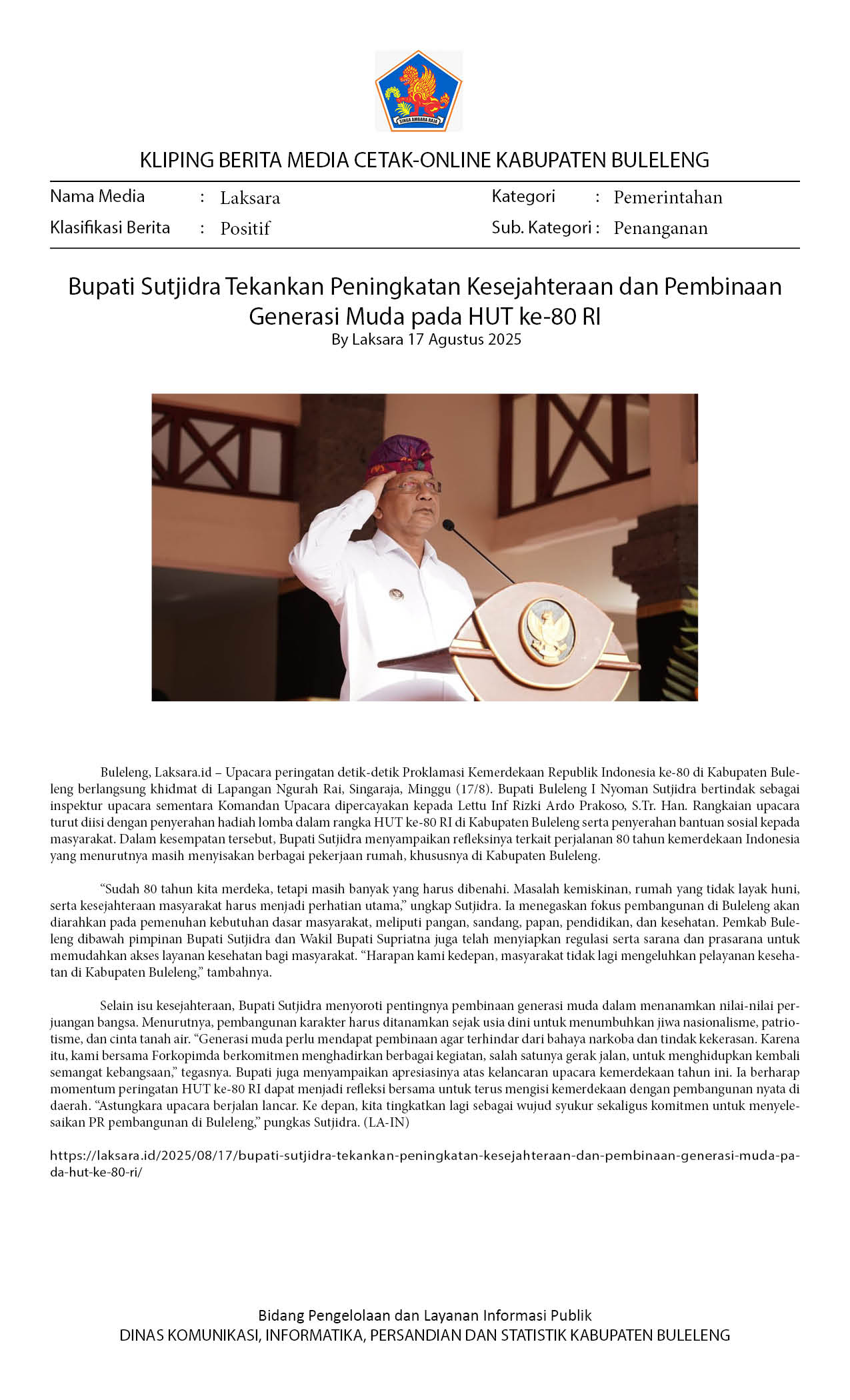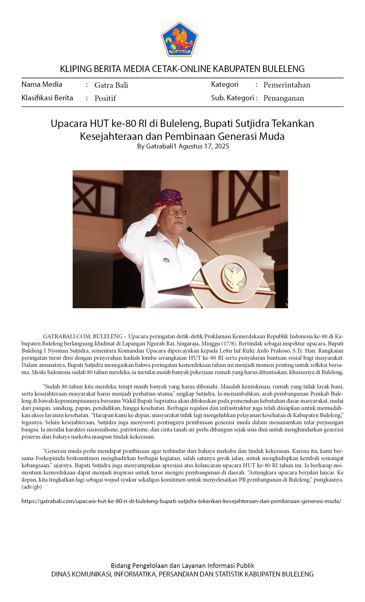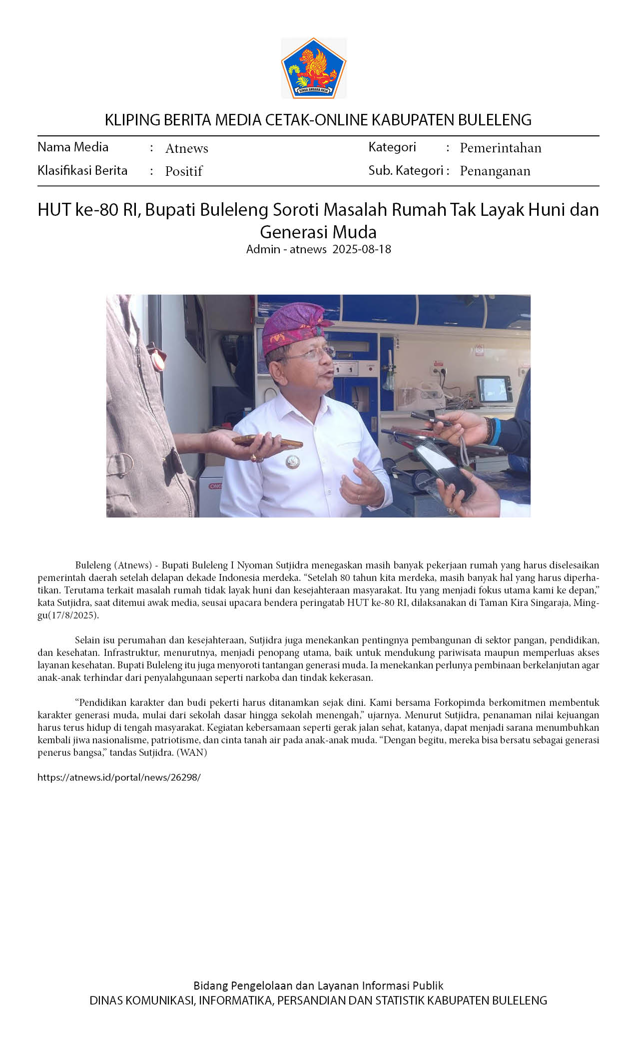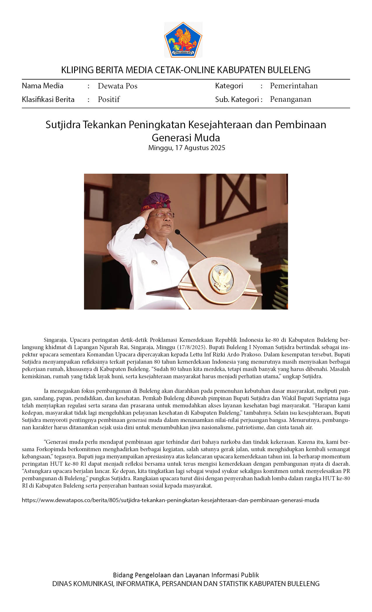 HUT KE-80 RI, BUPATI BULELENG SOROTI MASALAH RTLH DAN GENERASI MUDA