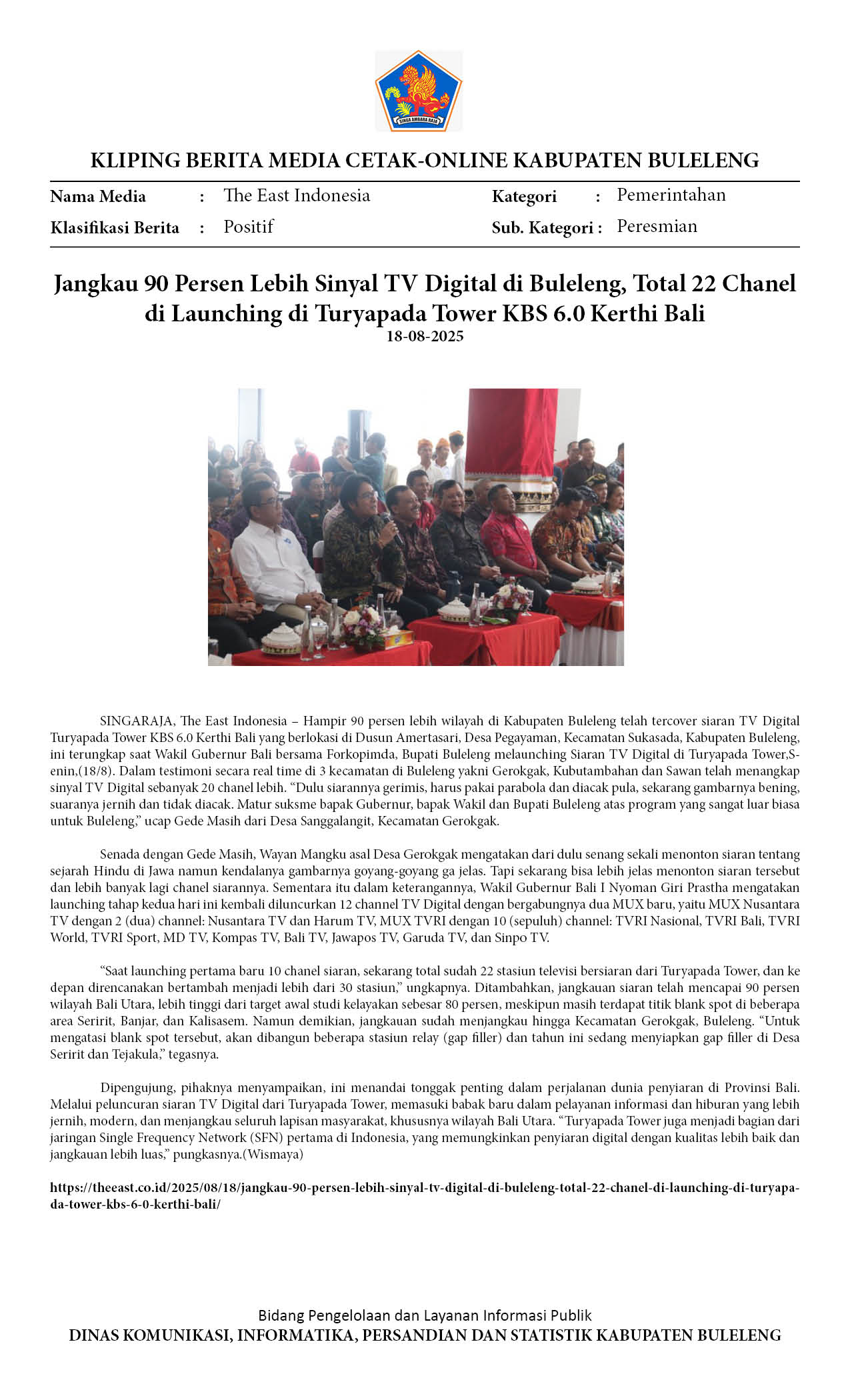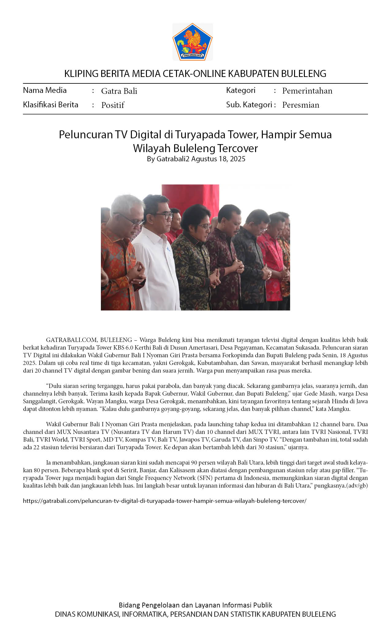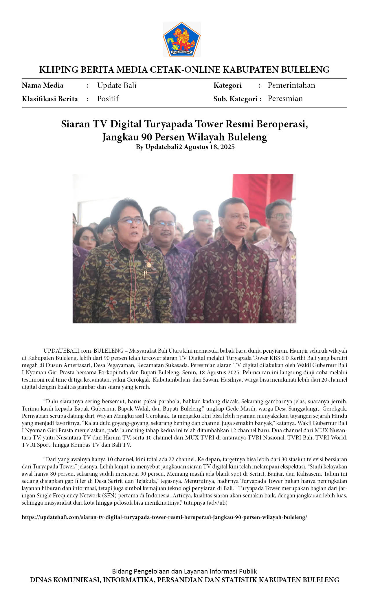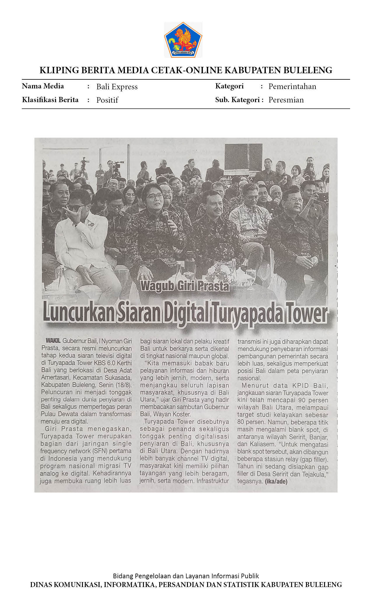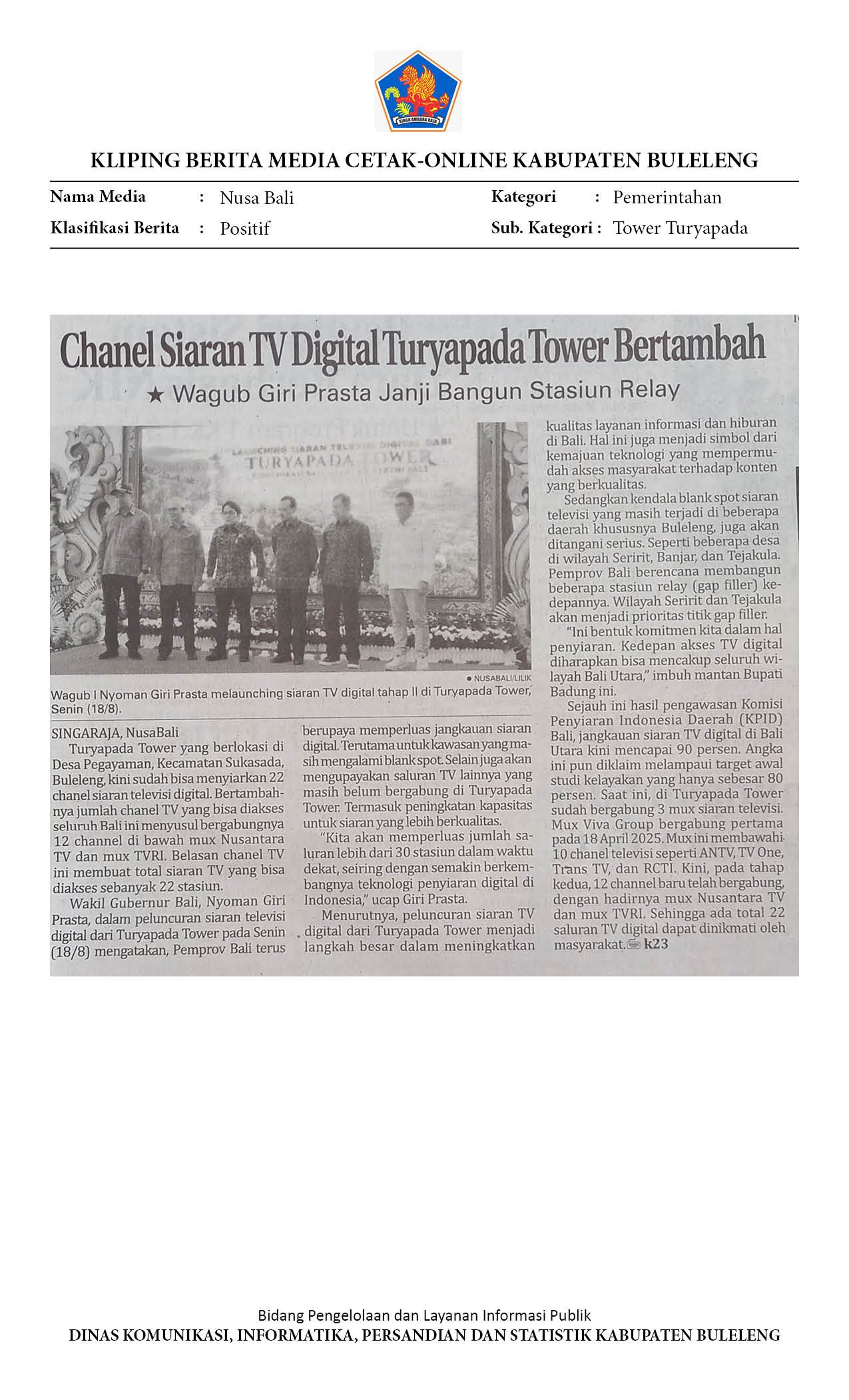 JANGKAU 90 PERSEN LEBIH SINYAL TV DIGITAL DI BULELENG, TOTAL 22 CHANEL DI LAUNCHING DI TURYAPADA TOWER KBS 6.0 KERTHI BALI
