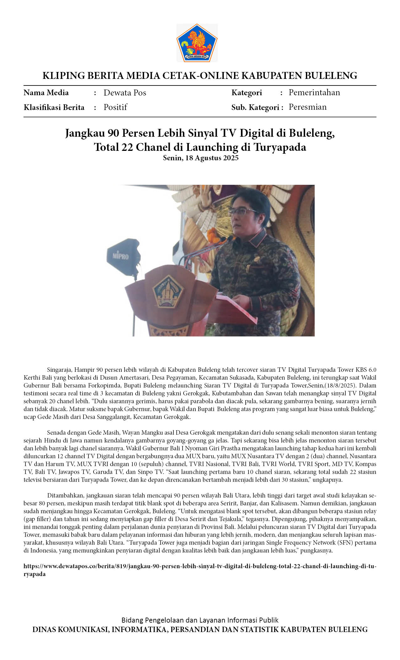 JANGKAU 90 PERSEN LEBIH SINYAL TV DIGITAL DI BULELENG, TOTAL 22 CHANEL DI LAUNCHING DI TURYAPADA
