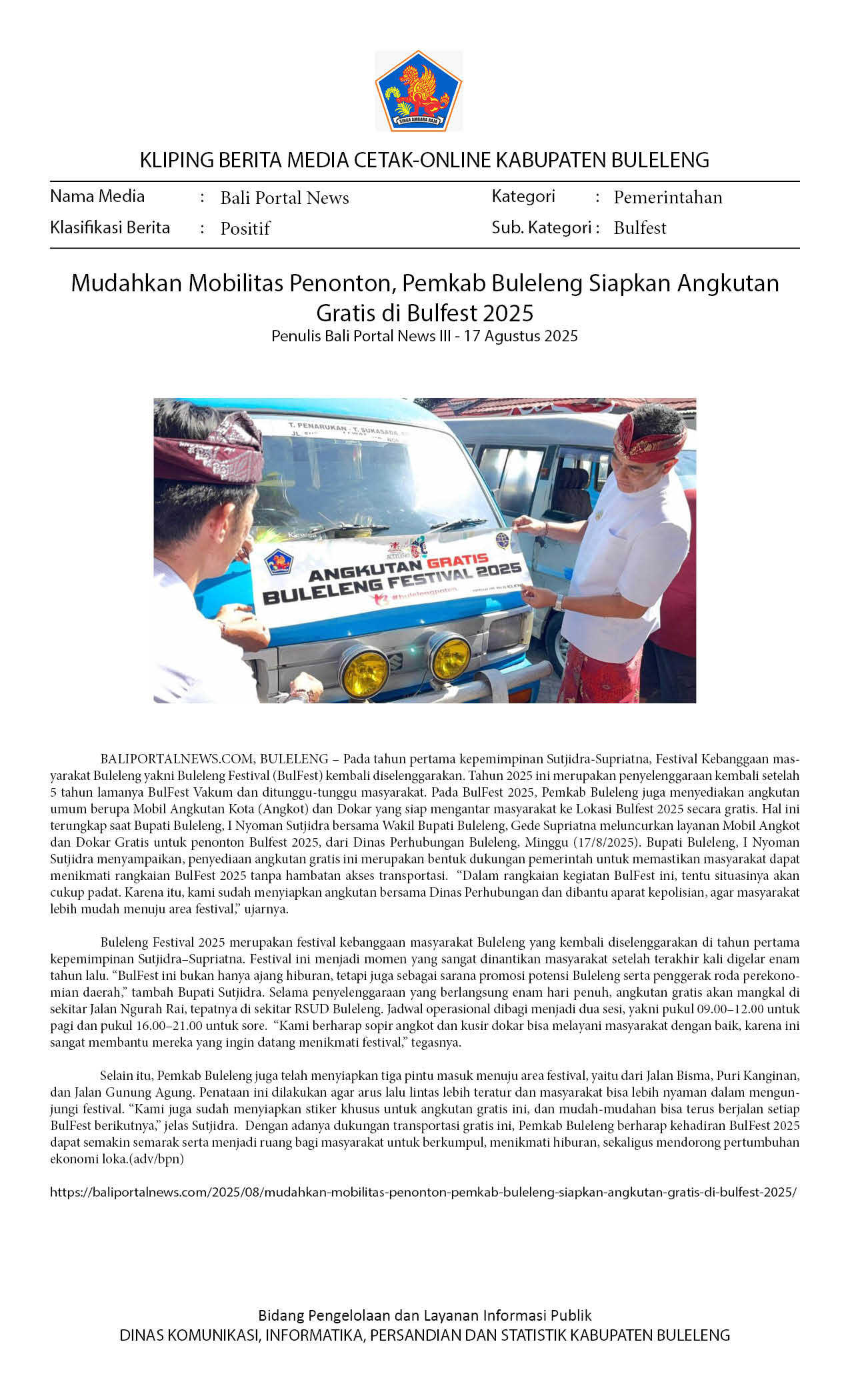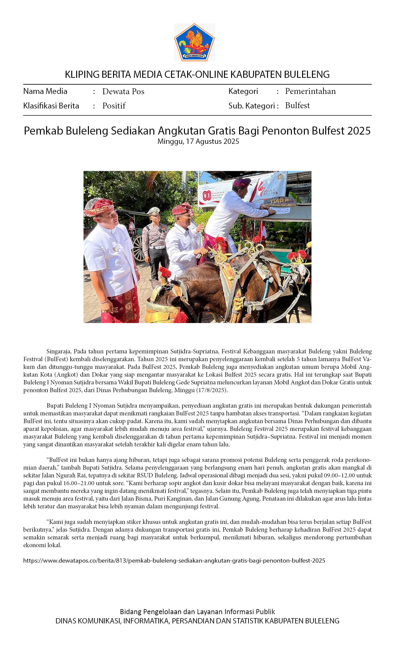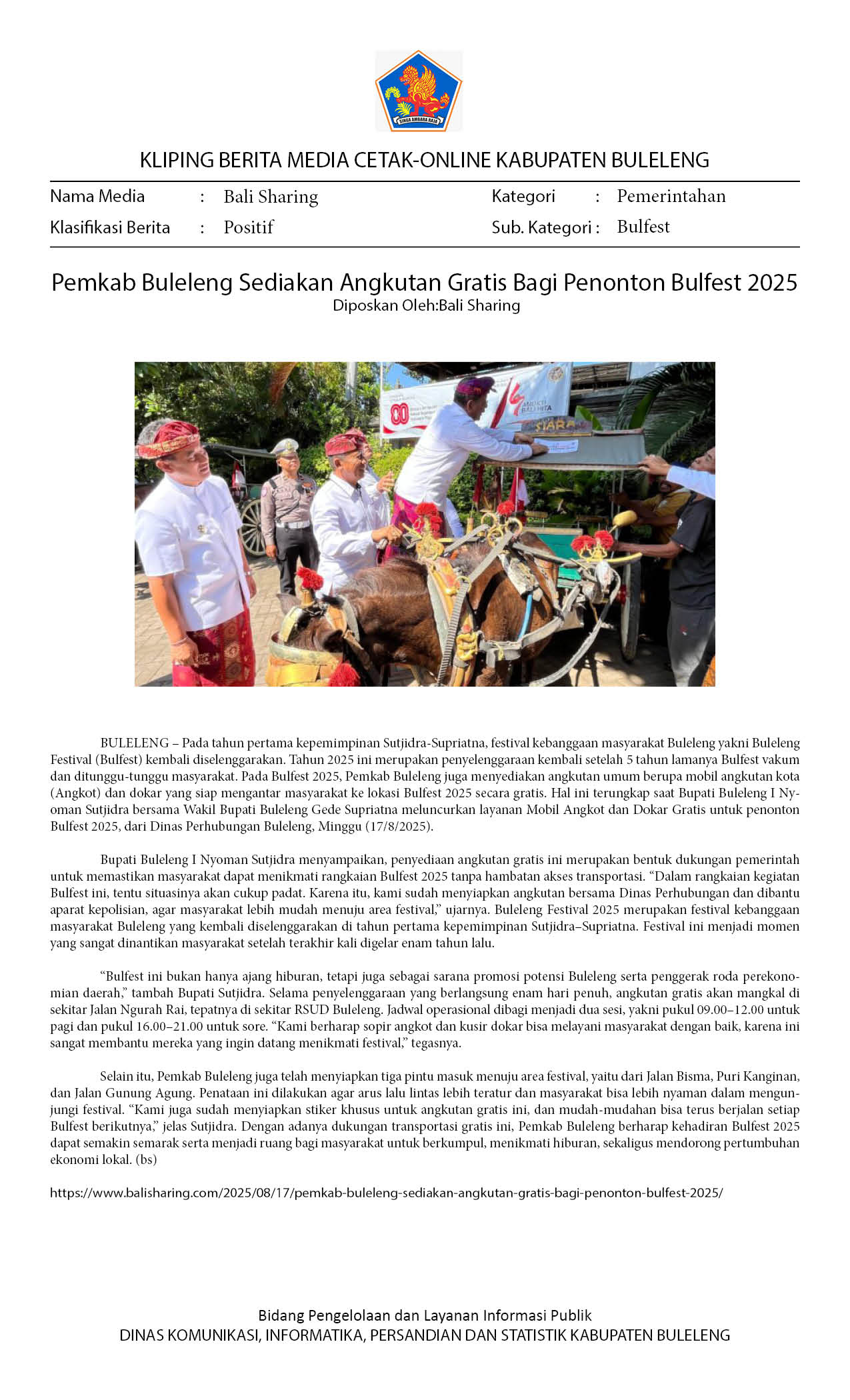 PEMKAB BULELENG SEDIAKAN ANGKUTAN GRATIS BAGI PENONTON BULFEST 2025