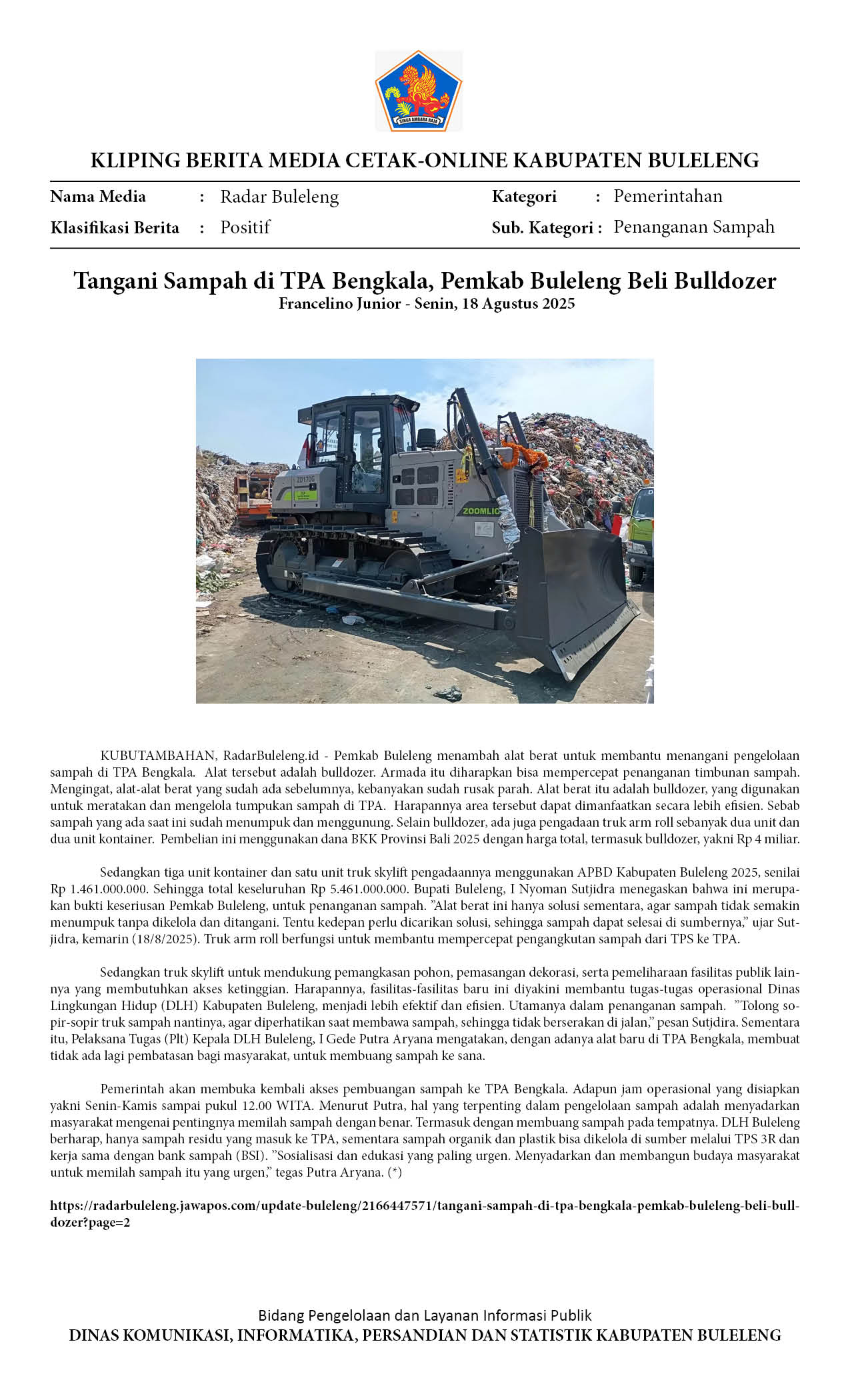TANGANI SAMPAH DI TPA BENGKALA, PEMKAB BULELENG BELI BULLDOZER