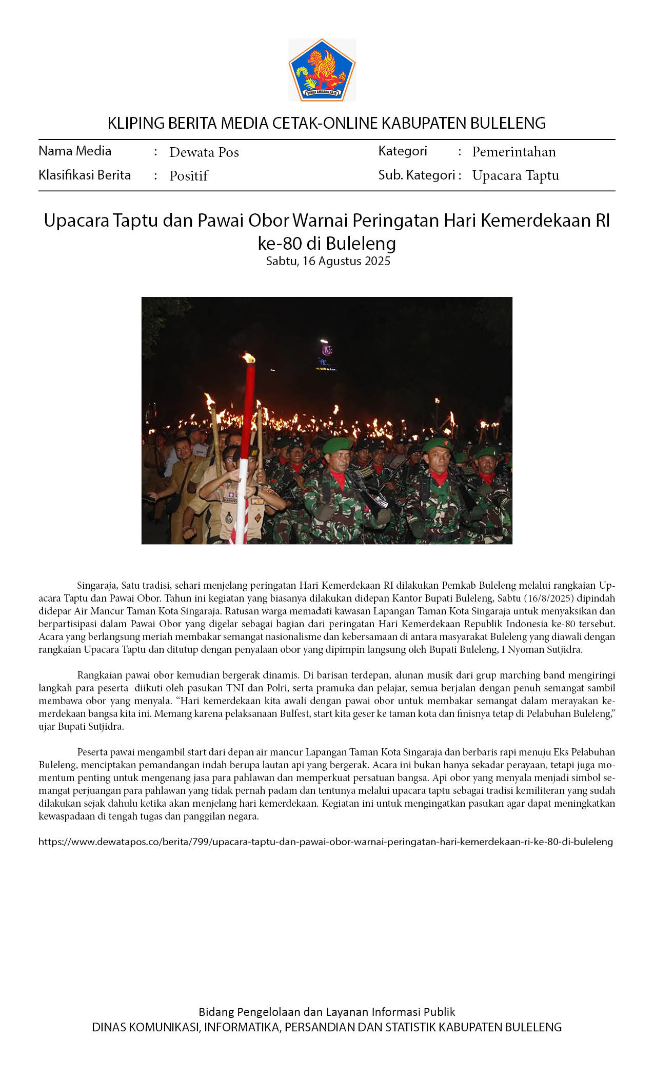 UPACARA TAPTU DAN PAWAI OBOR WARNAI PERINGATAN HARI KEMERDEKAAN RI KE-80 DI BULELENG