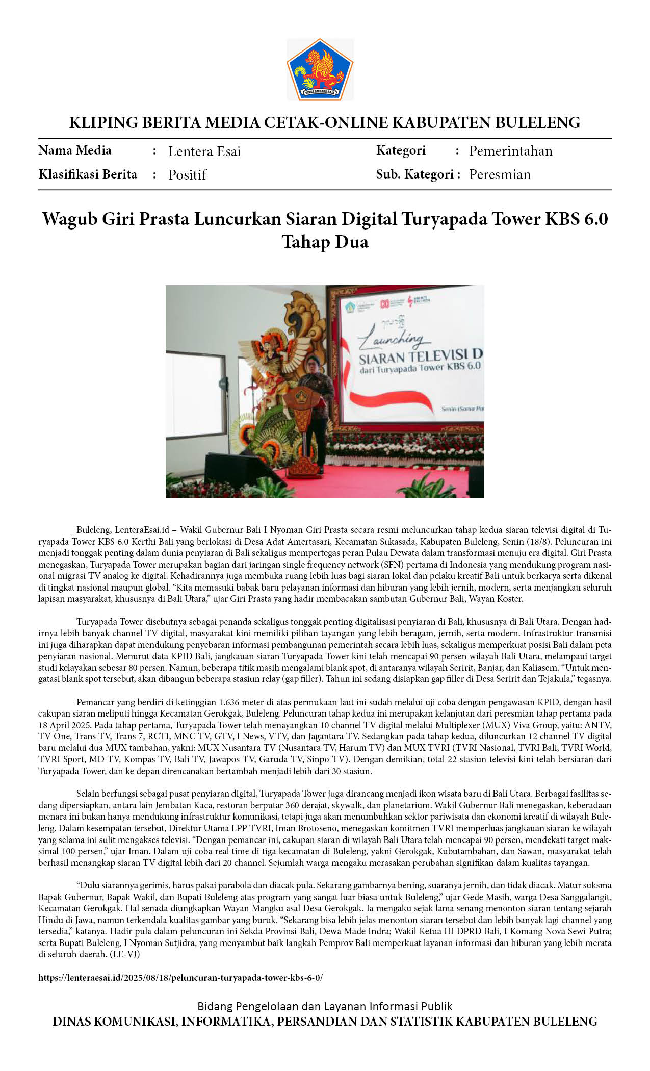 WAGUB GIRI PRASTA LUNCURKAN SIARAN DIGITAL TURYAPADA TOWER KBS 6.0 TAHAP DUA