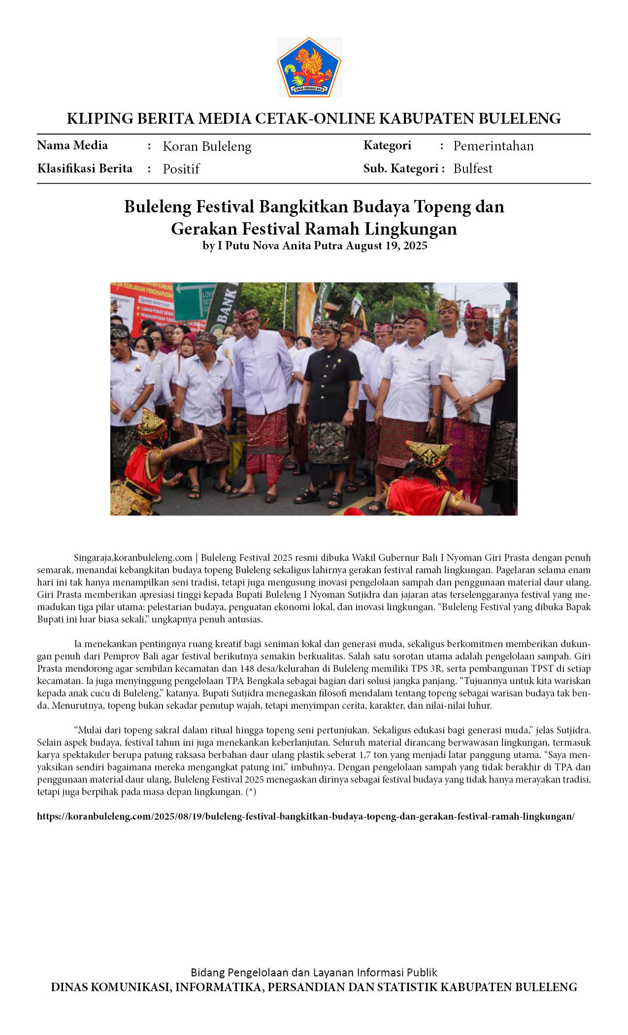 BULELENG FESTIVAL BANGKITKAN BUDAYA TOPENG DAN GERAKAN FESTIVAL RAMAH LINGKUNGAN