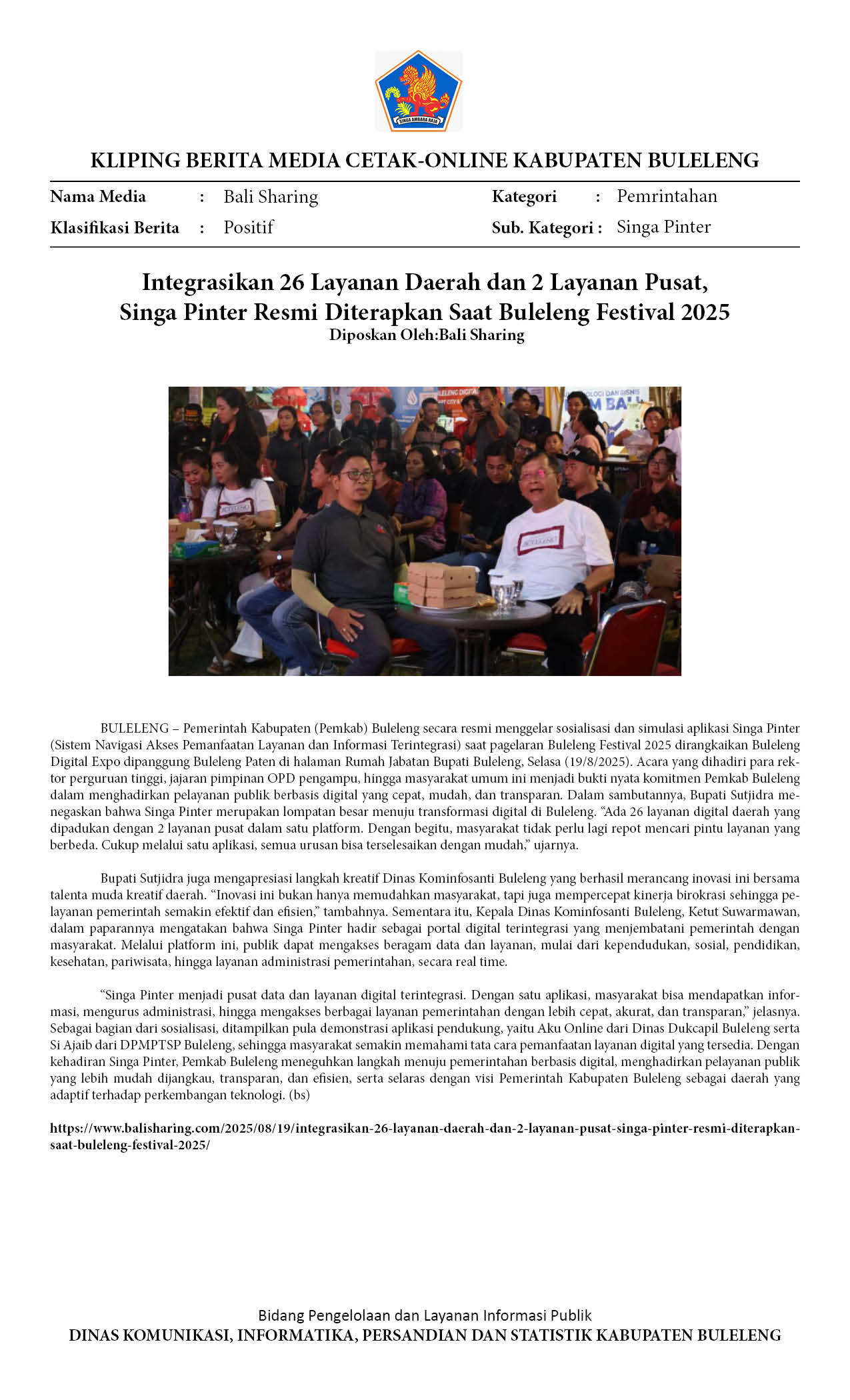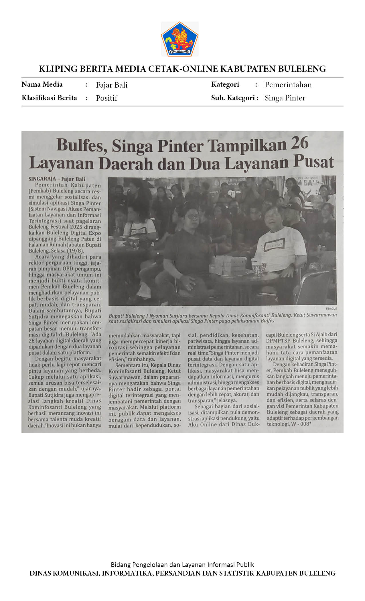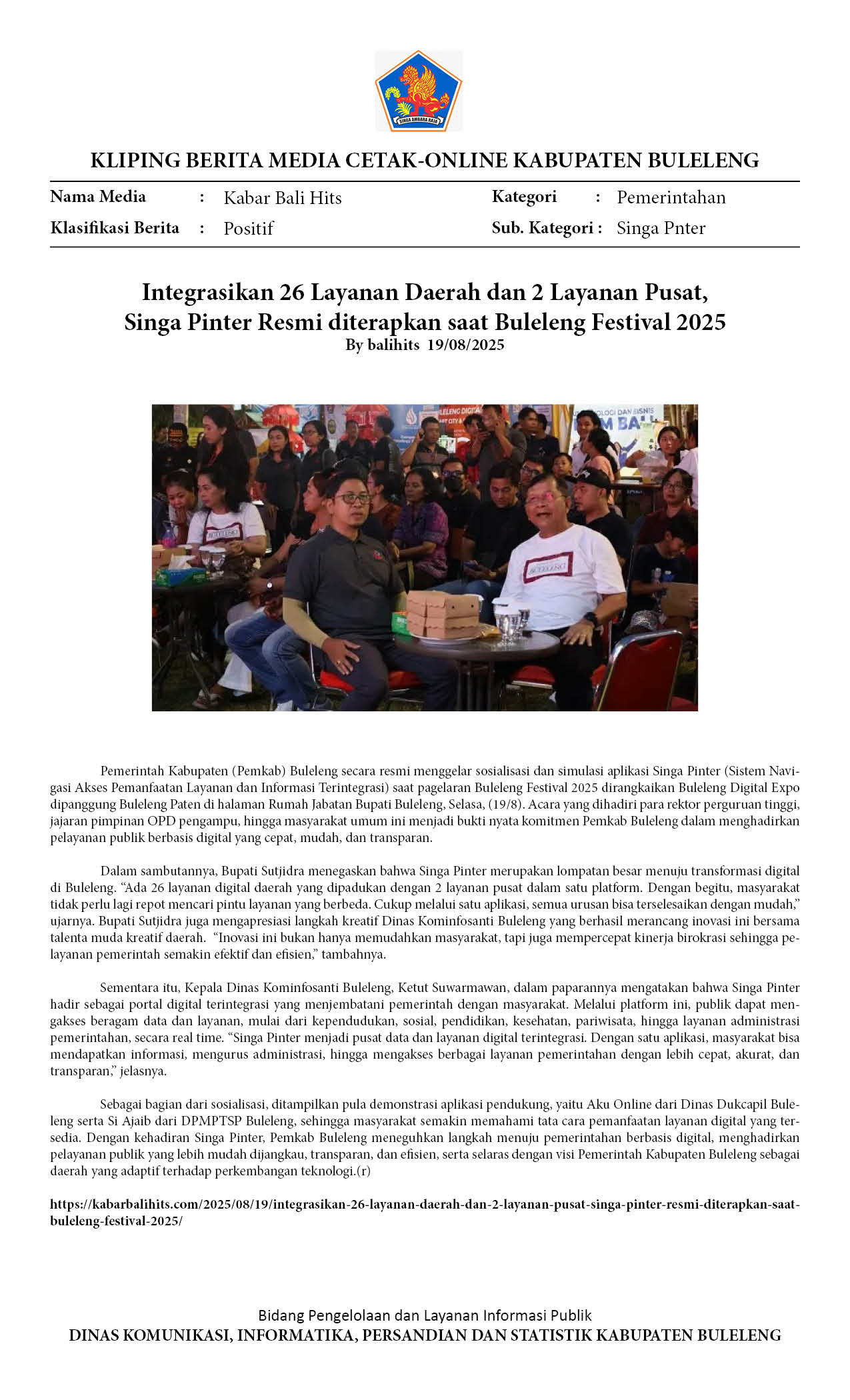 INTEGRASIKAN 26 LAYANAN DAERAH DAN 2 LAYANAN PUSAT, SINGA PINTER RESMI DITERAPKAN SAAT BULELENG FESTIVAL 2025