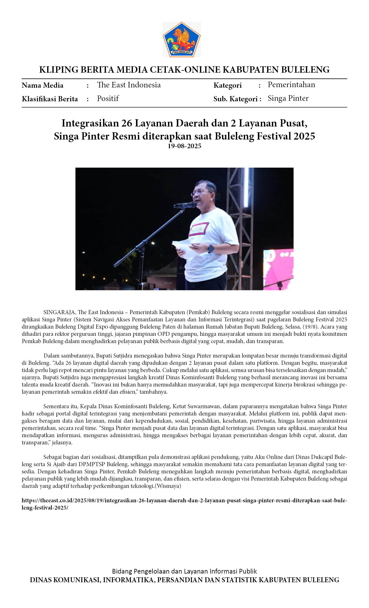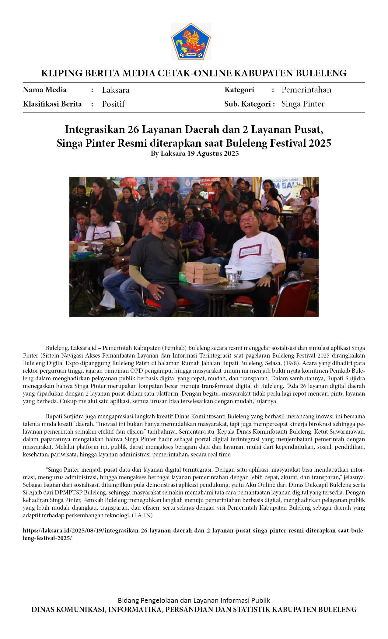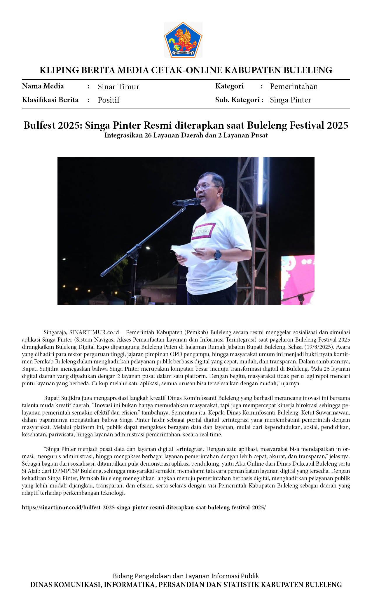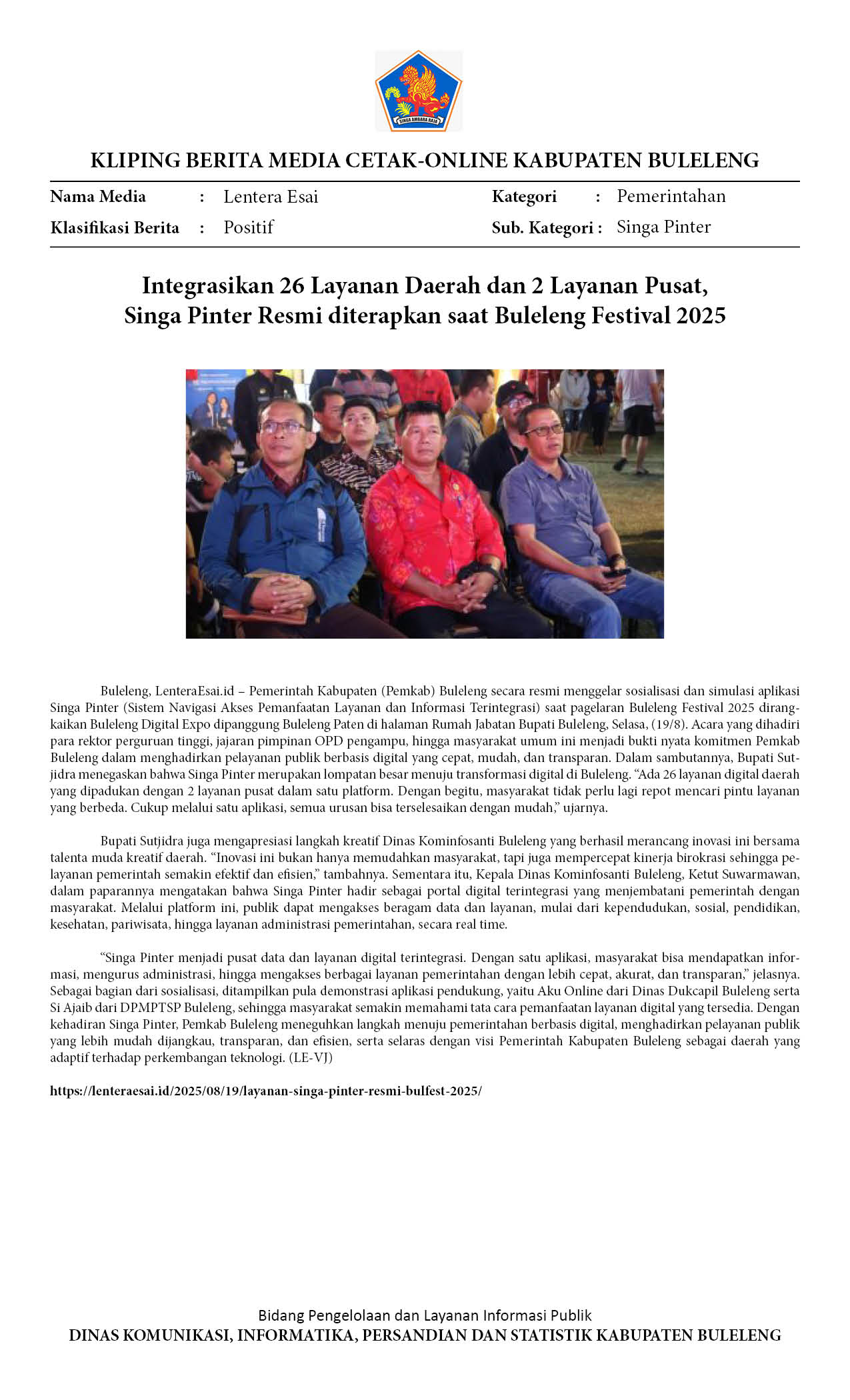 INTEGRASIKAN 26 LAYANAN DAERAH DAN 2 LAYANAN PUSAT, SINGA PINTER RESMI DITERAPKAN SAAT BULELENG FESTIVAL 2025