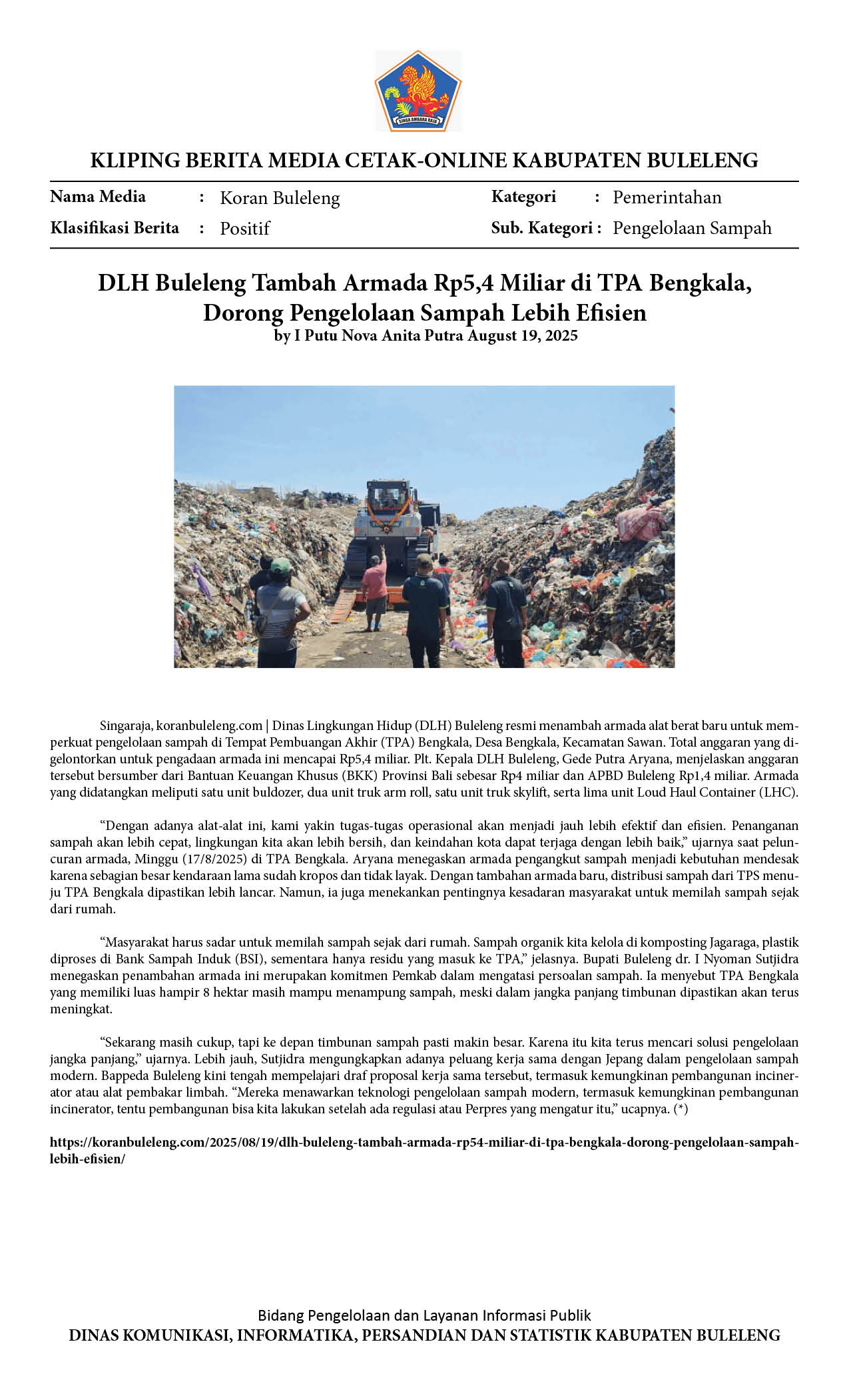 DLH BULELENG TAMBAH ARMADA RP5,4 MILIAR DI TPA BENGKALA, DORONG PENGELOLAAN SAMPAH LEBIH EFISIEN