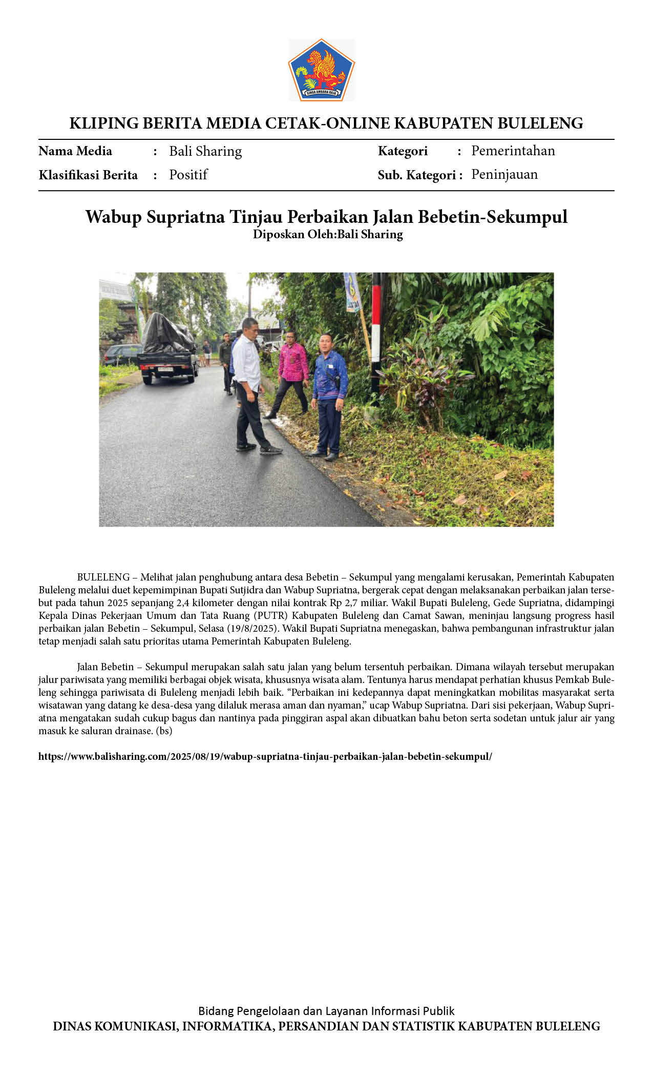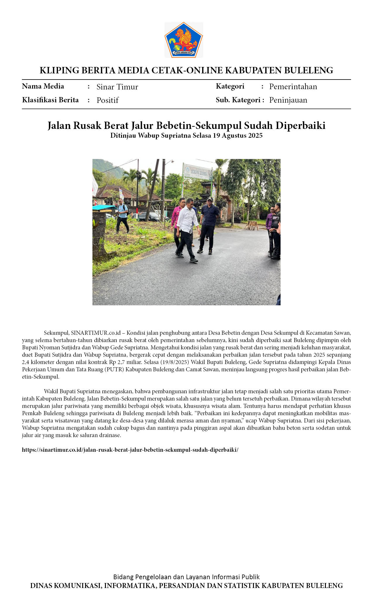 TINJAU PERBAIKAN JALAN BEBETIN – SEKUMPUL, WABUP SUPRIATNA TEGASKAN PEMBANGUNAN INFRASTRUKTUR JALAN JADI PRIORITAS PEMKAB BULELENG