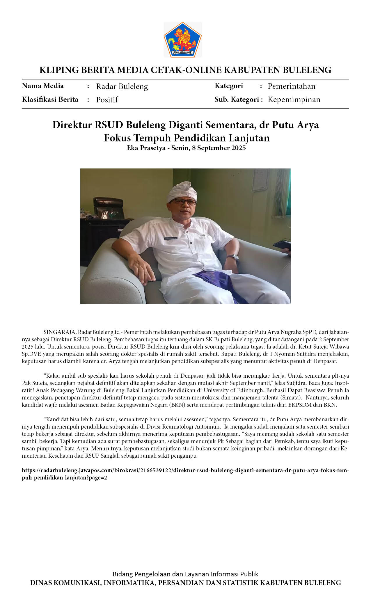 DIREKTUR RSUD BULELENG DIGANTI SEMENTARA, DR PUTU ARYA FOKUS TEMPUH PENDIDIKAN LANJUTAN