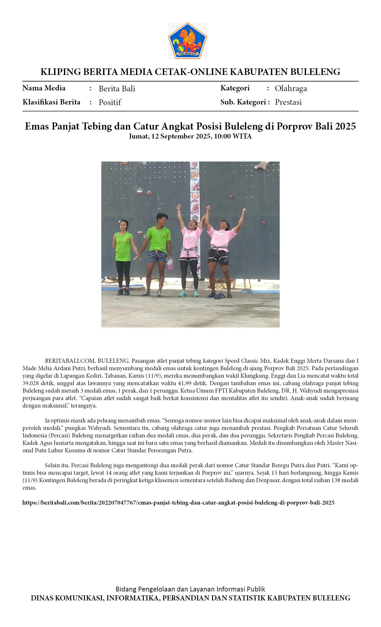 EMAS PANJAT TEBING DAN CATUR ANGKAT POSISI BULELENG DI PORPROV BALI 2025