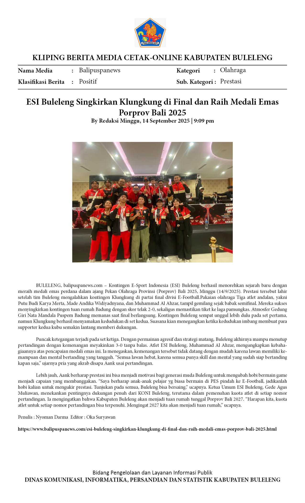 ESI BULELENG CATAT SEJARAH EMAS DI PORPROV BALI 2025
