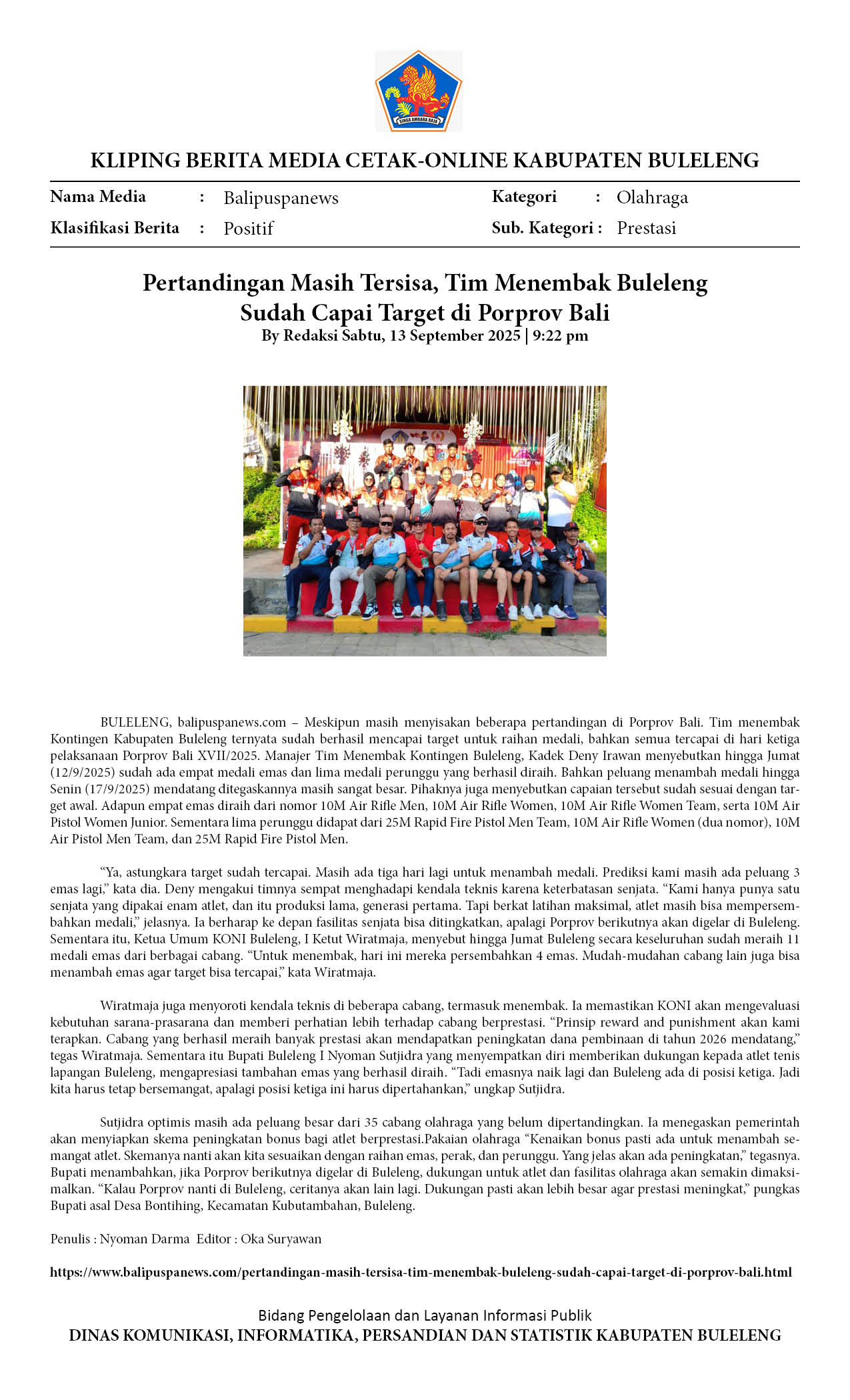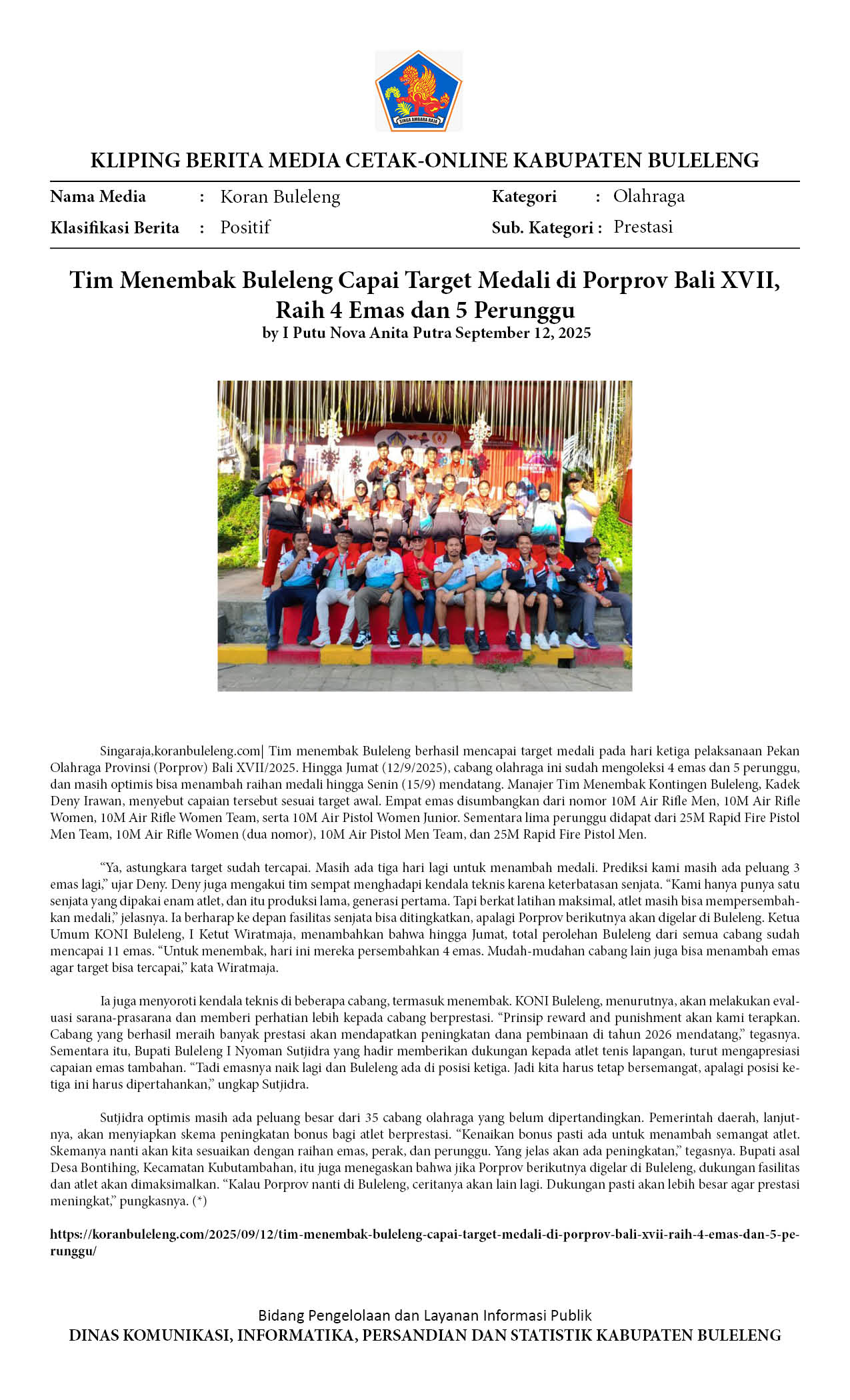 TIM MENEMBAK BULELENG CAPAI TARGET MEDALI DI PORPROV BALI XVII, RAIH 4 EMAS DAN 5 PERUNGGU