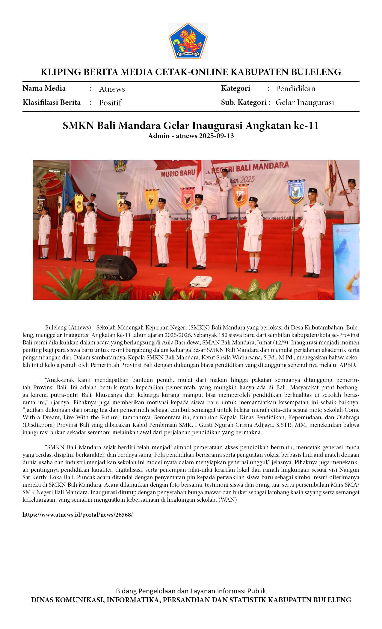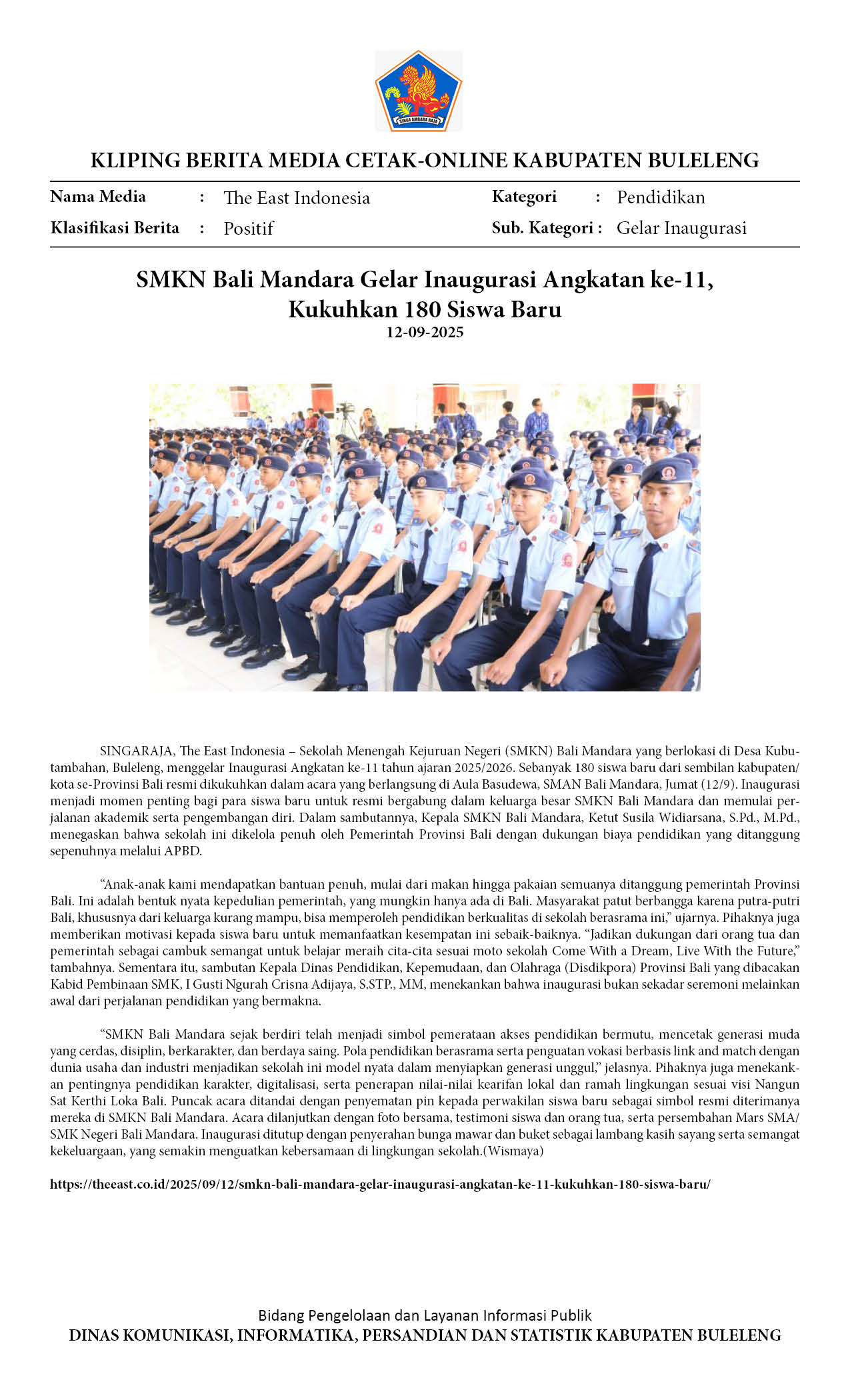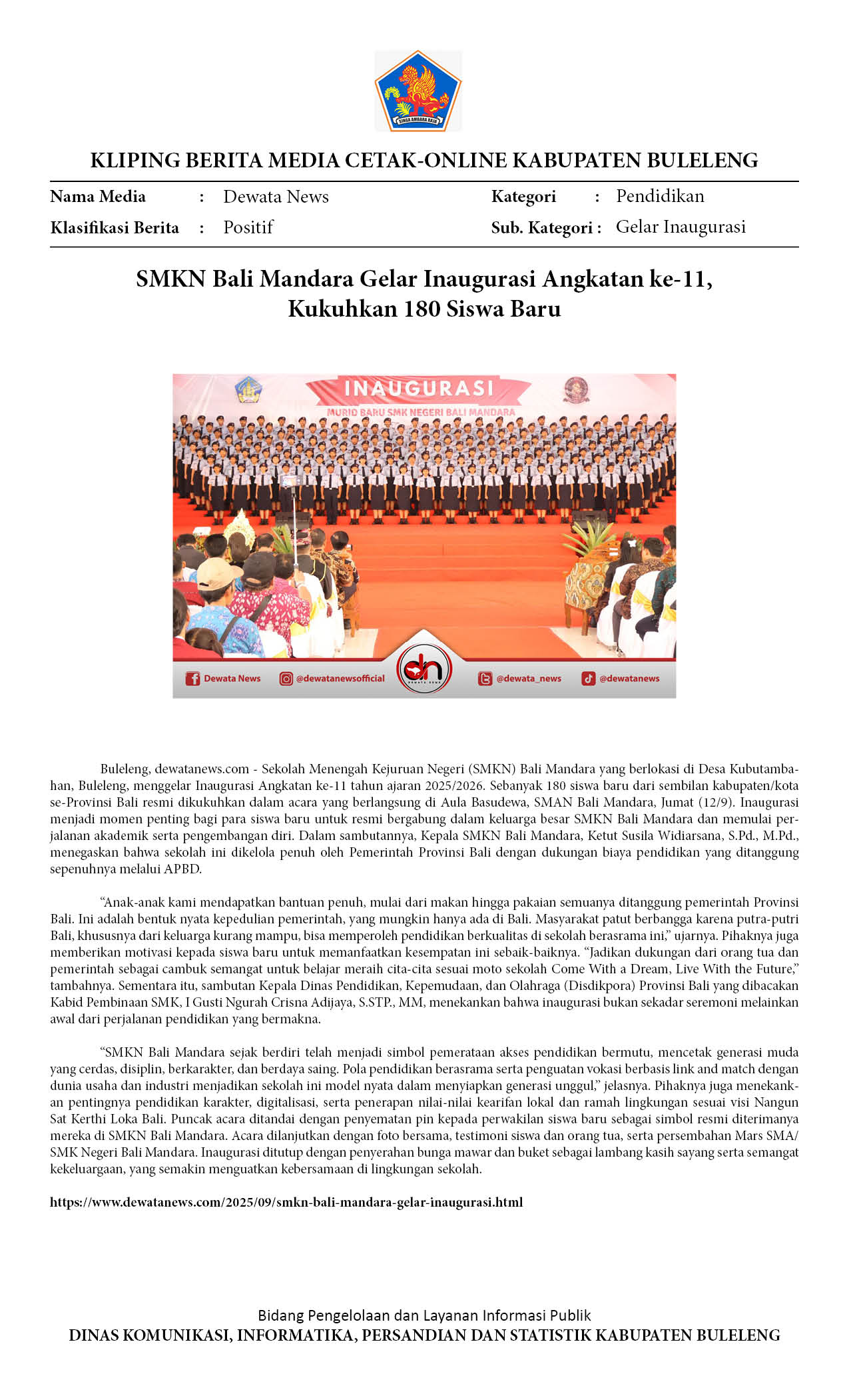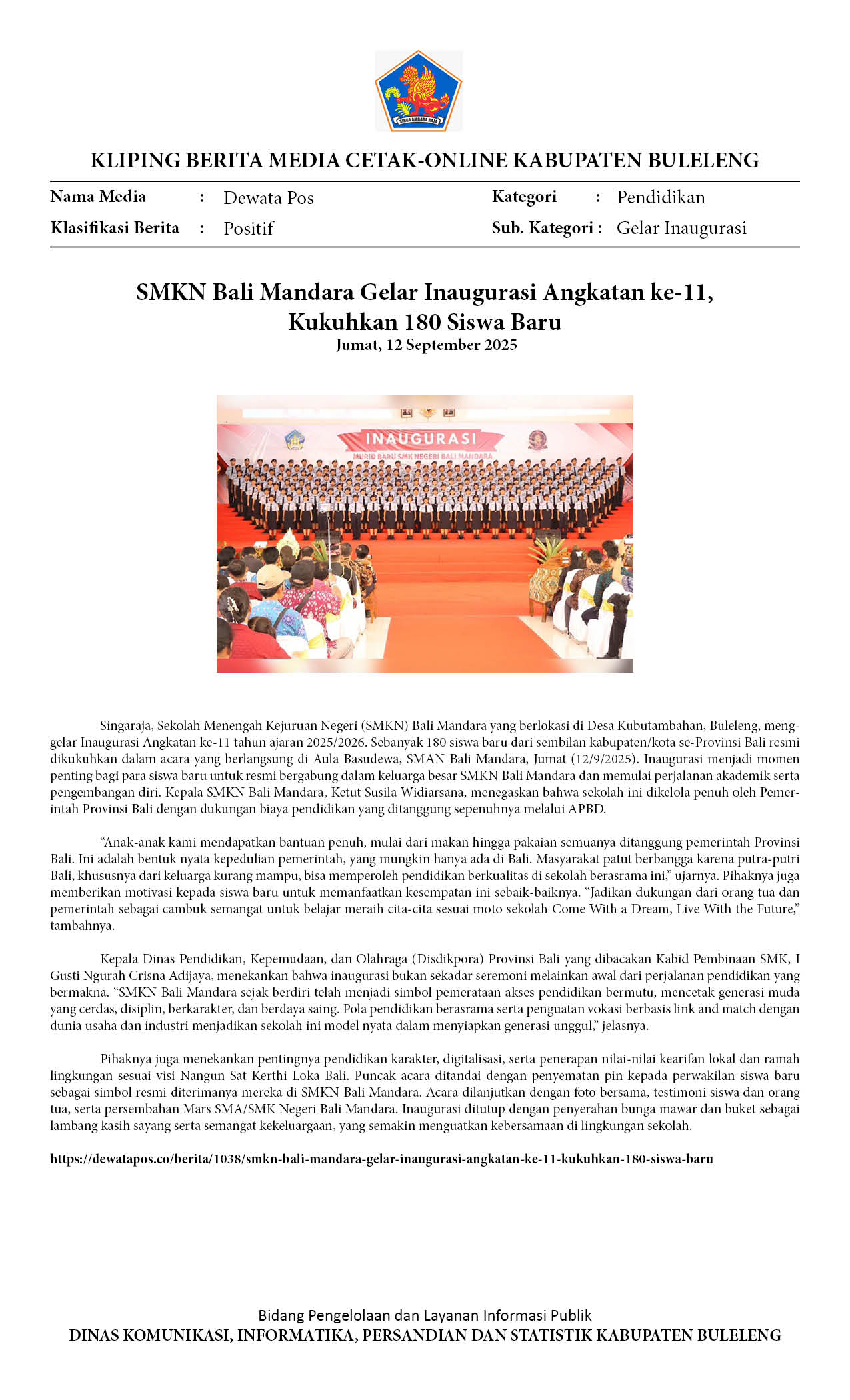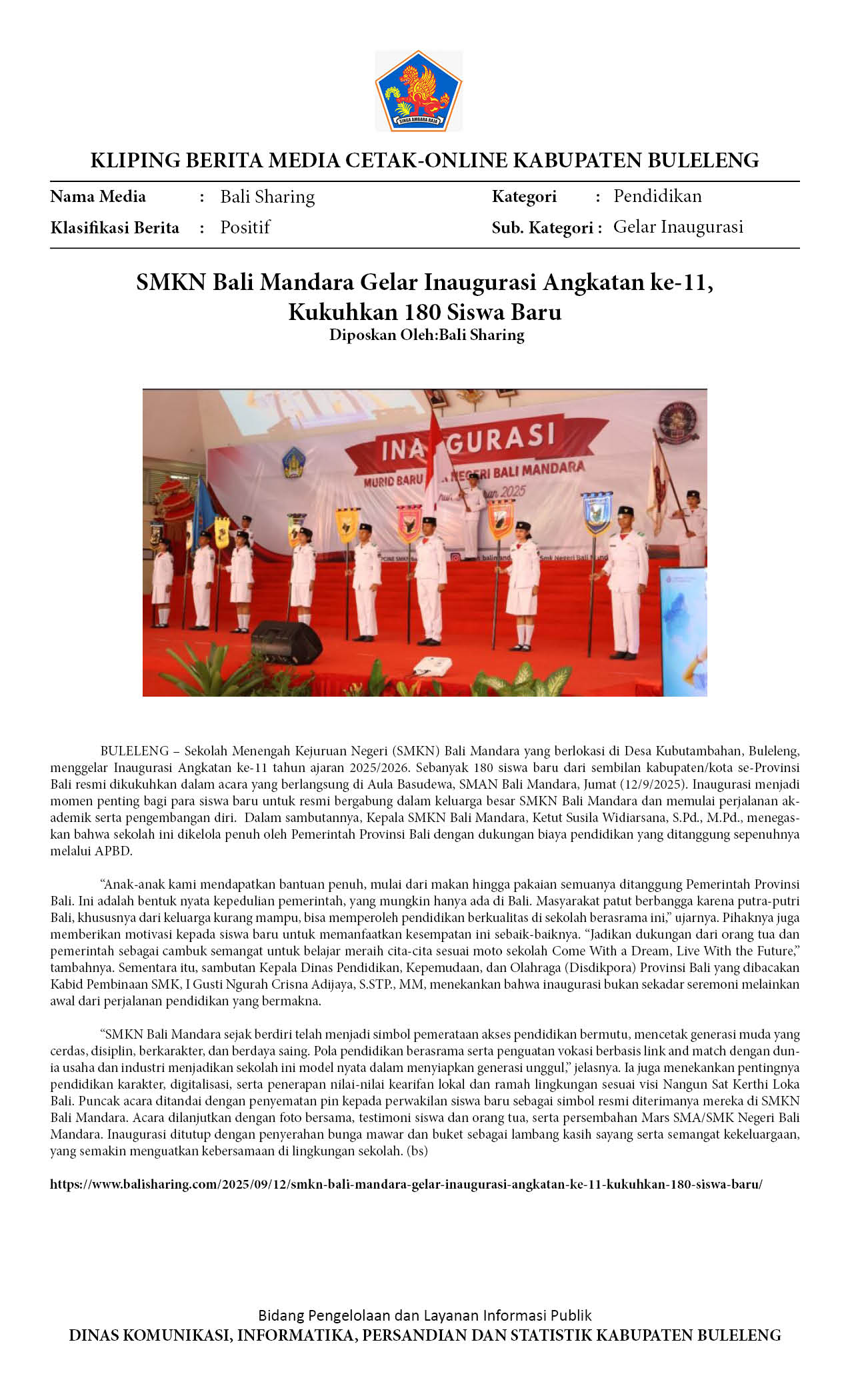 SMKN BALI MANDARA GELAR INAUGURASI ANGKATAN KE-11, KUKUHKAN 180 SISWA BARU