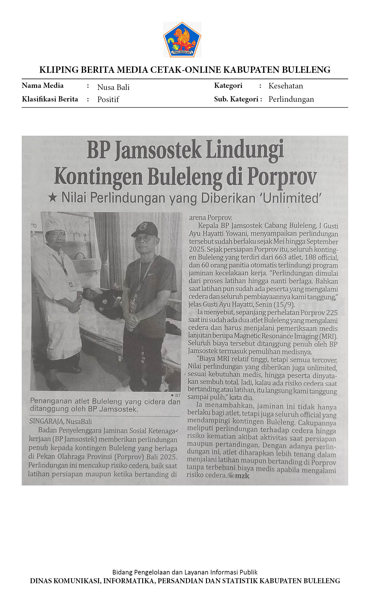BP JAMSOSTEK LINDUNGI KONTINGEN BULELENG DI PORPROV