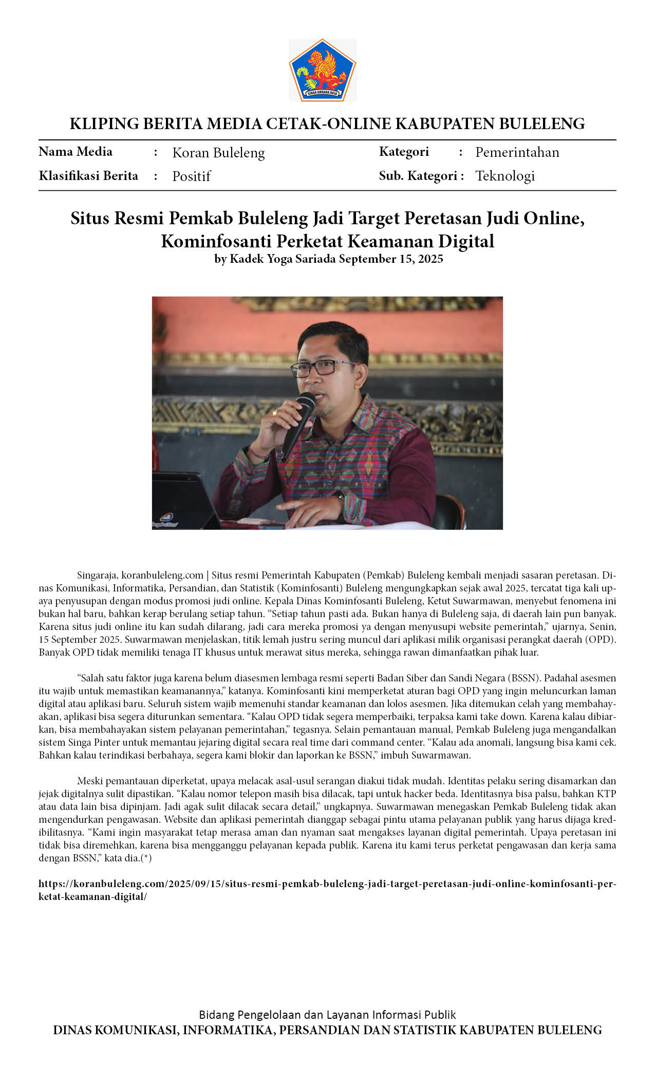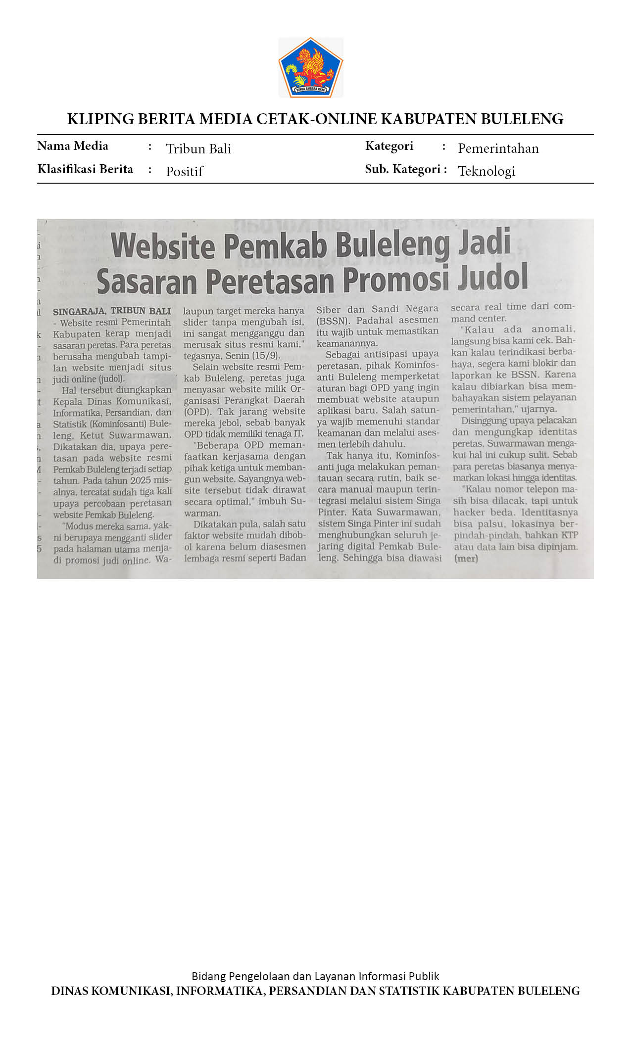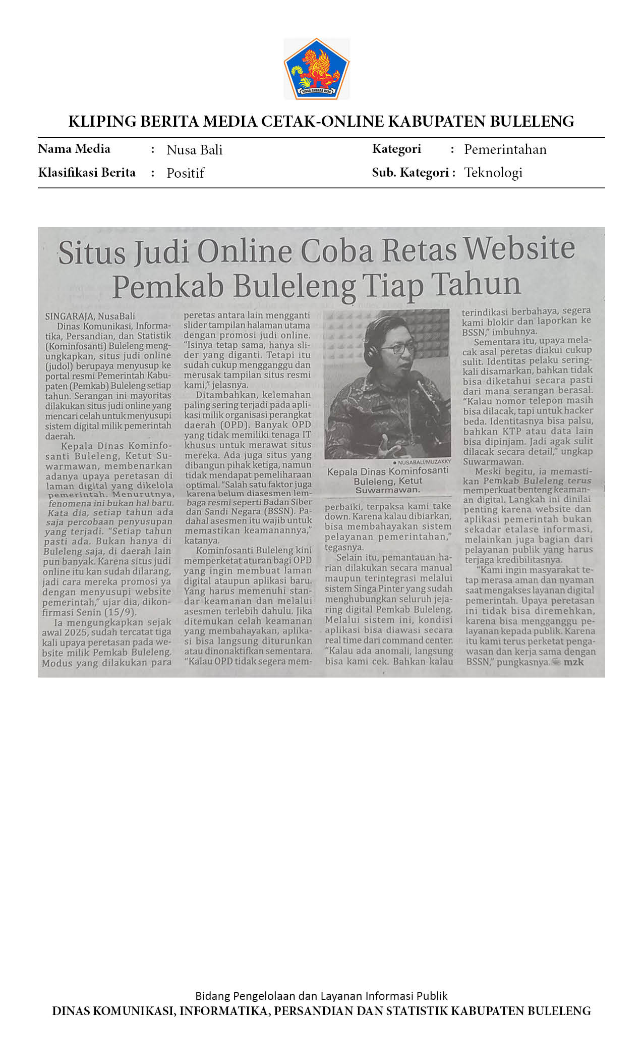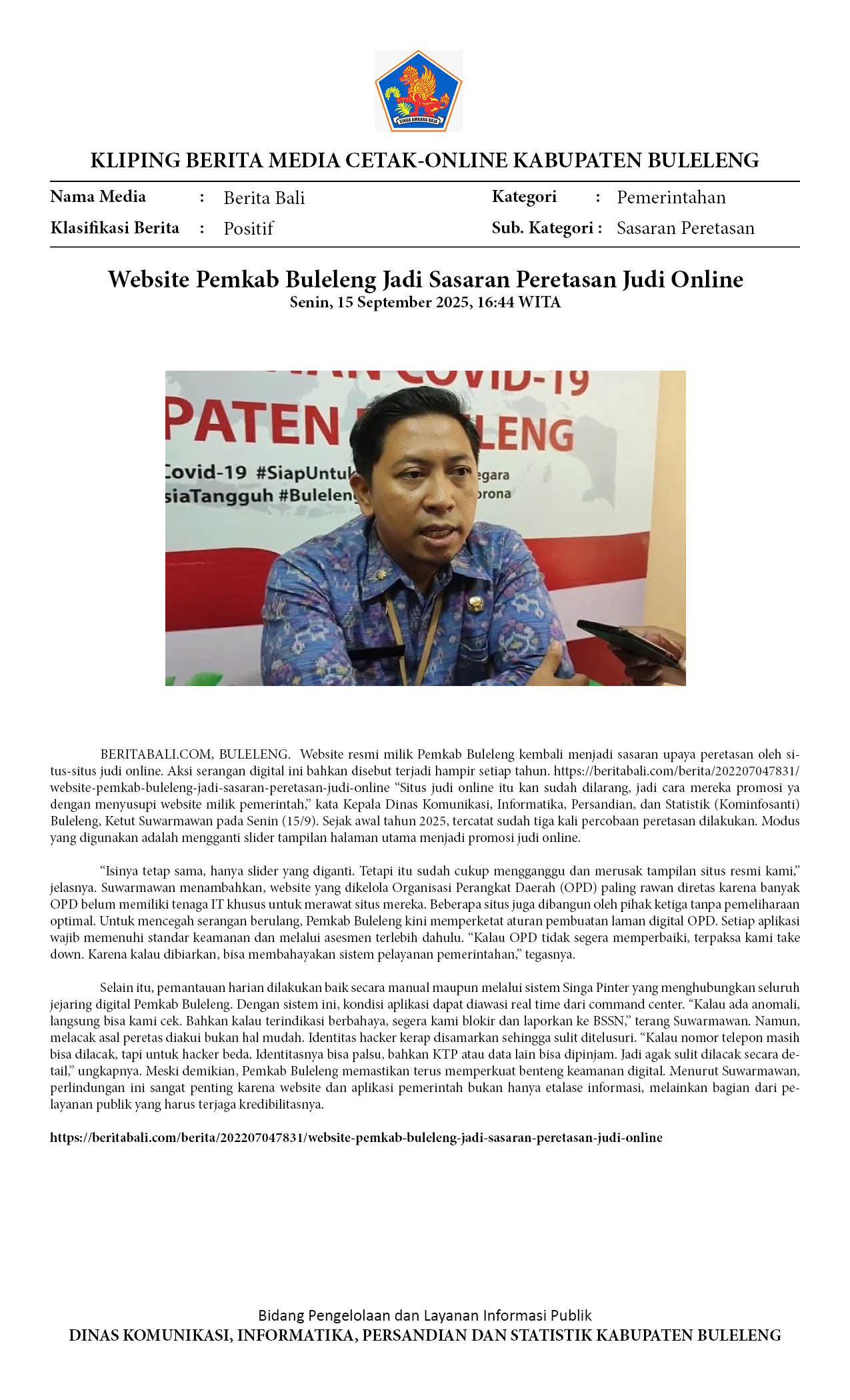 SITUS RESMI PEMKAB BULELENG JADI TARGET PERETASAN JUDI ONLINE, KOMINFOSANTI PERKETAT KEAMANAN DIGITAL