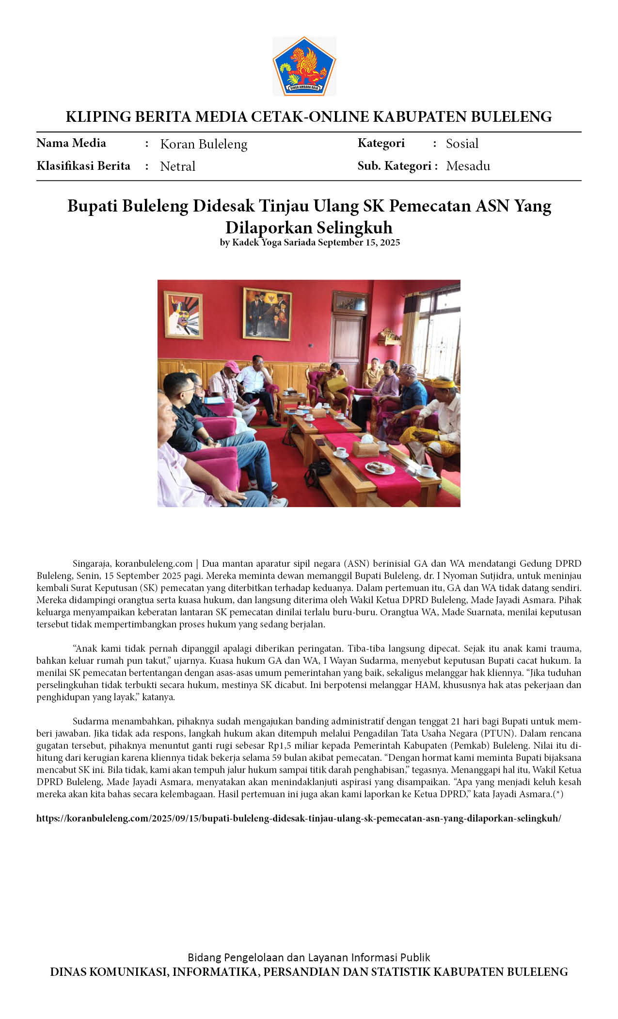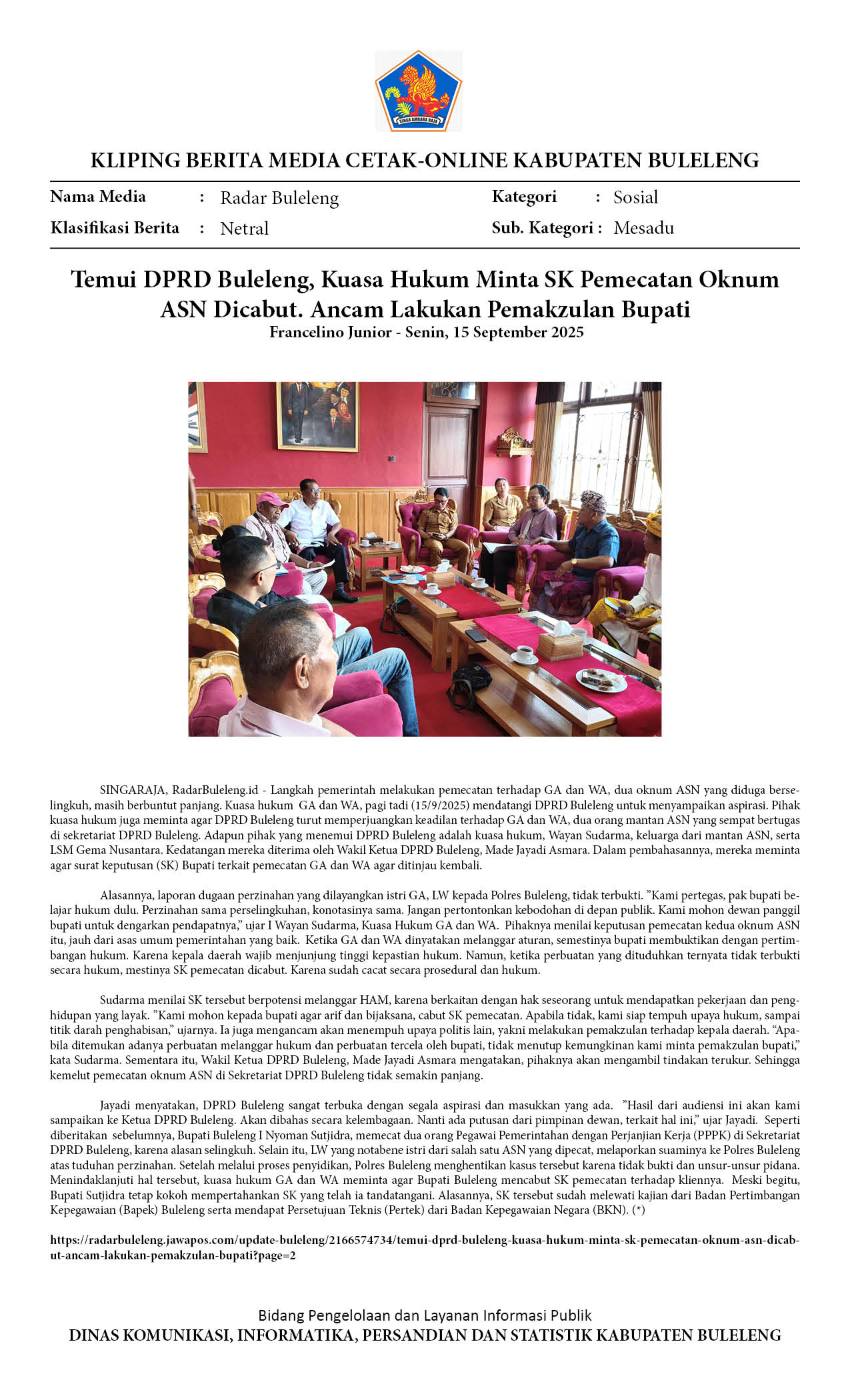 TEMUI DPRD BULELENG, KUASA HUKUM MINTA SK PEMECATAN OKNUM ASN DICABUT. ANCAM LAKUKAN PEMAKZULAN BUPATI