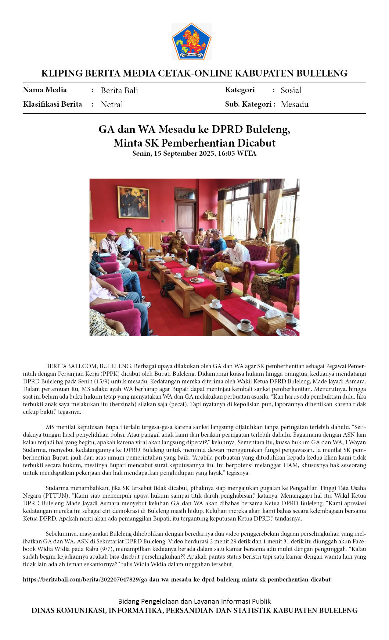 BUPATI BULELENG DIDESAK TINJAU ULANG SK PEMECATAN ASN YANG DILAPORKAN SELINGKUH