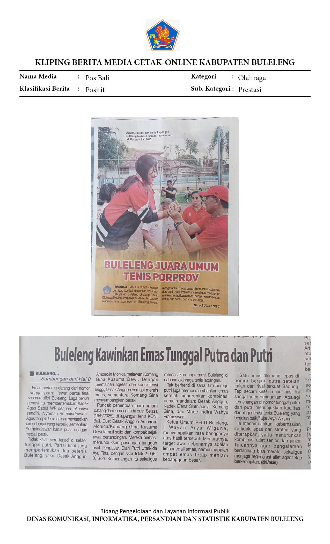 BULELENG JUARA UMUM CABANG TENIS LAPANGAN PORPROV. BALI XVI, KAWINKAN EMAS TUNGGAL PUTRA DAN PUTRI