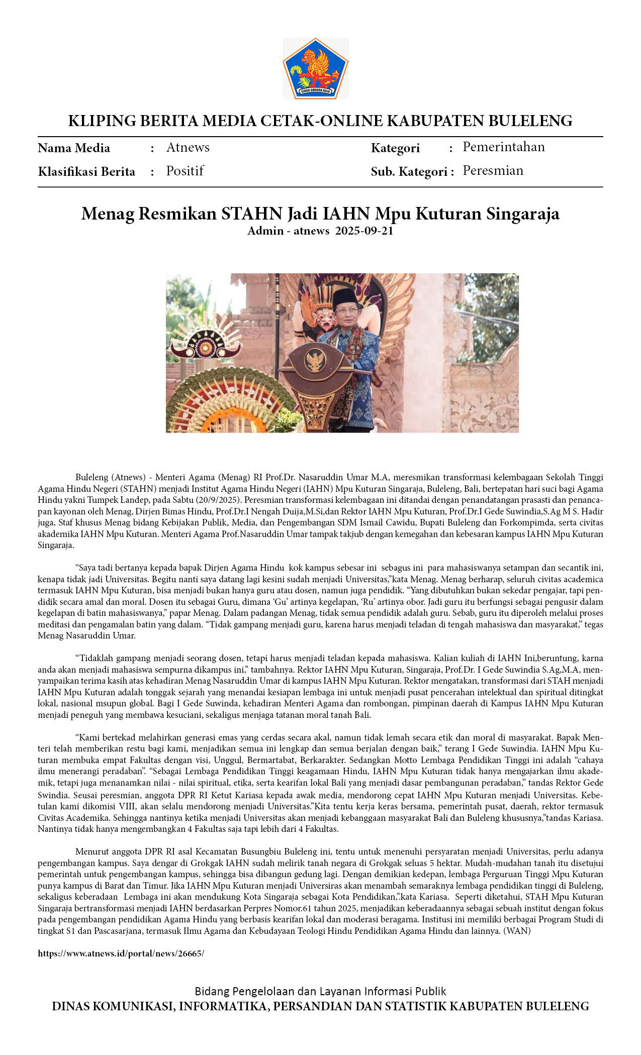 MENAG RESMIKAN STAHN JADI IAHN MPU KUTURAN SINGARAJA
