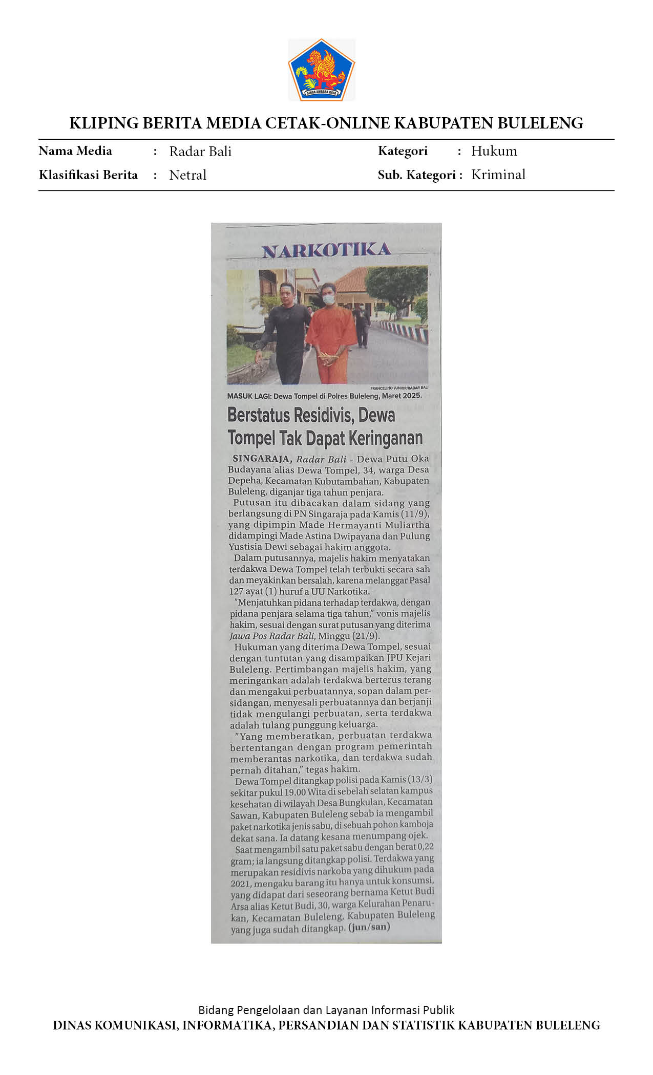 BERSTATUS RESIDIVIS, DEWA TEMPEL TAK DAPAT KERINGANAN