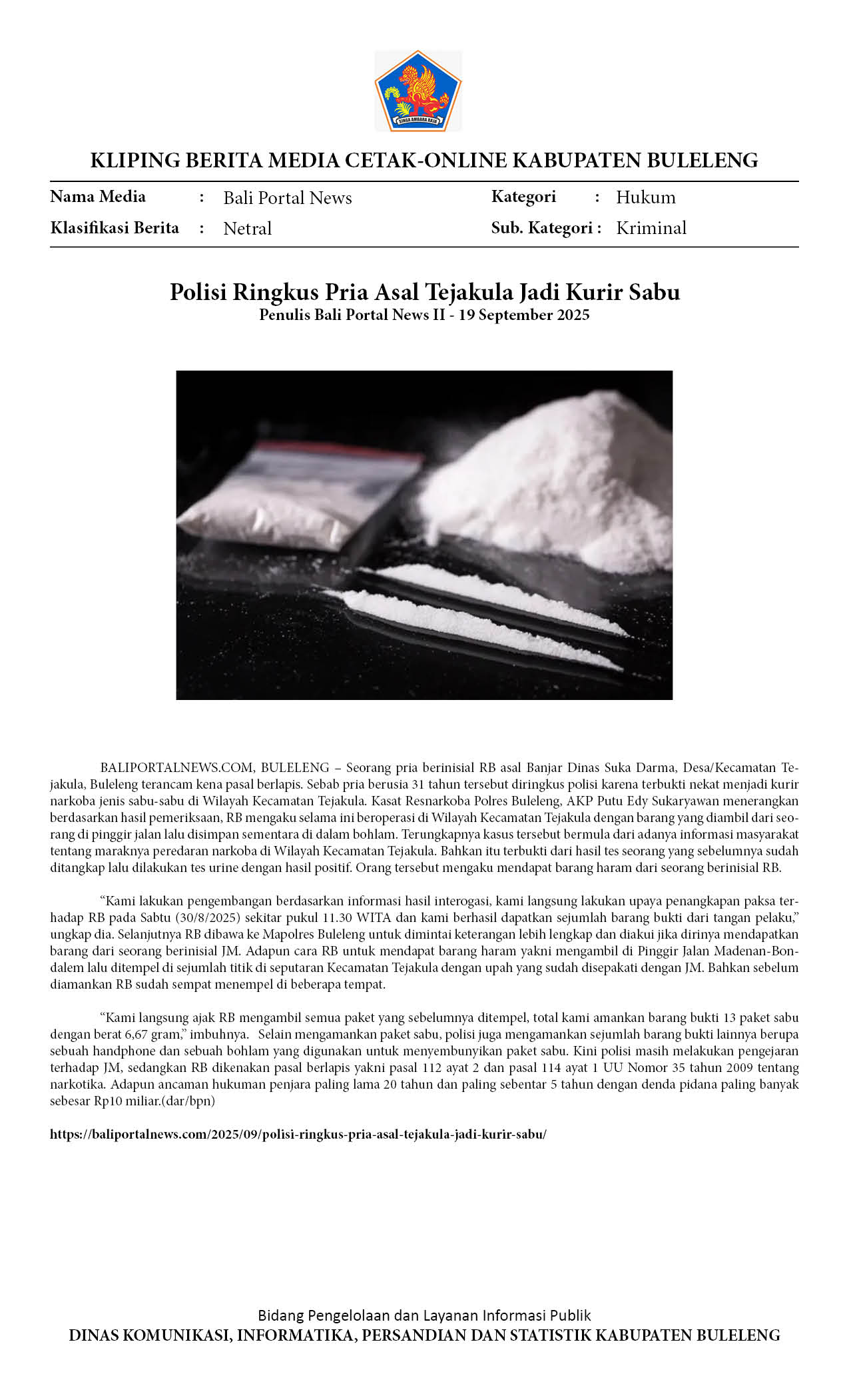 POLISI RINGKUS PRIA ASAL TEJAKULA JADI KURIR SABU
