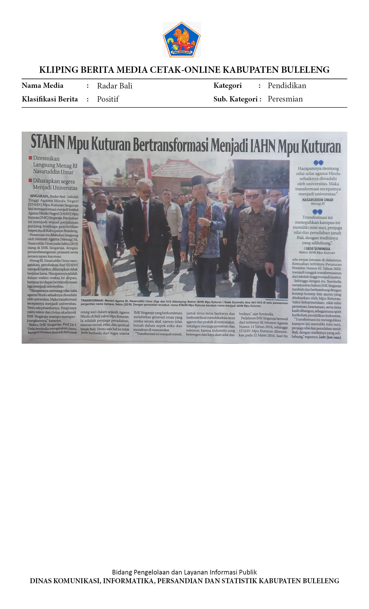 RESMIKAN PERUBAHAN IAHN MPU KUTURAN, MENAG BERHARAP MENJADI UNIVERSITAS HINDU