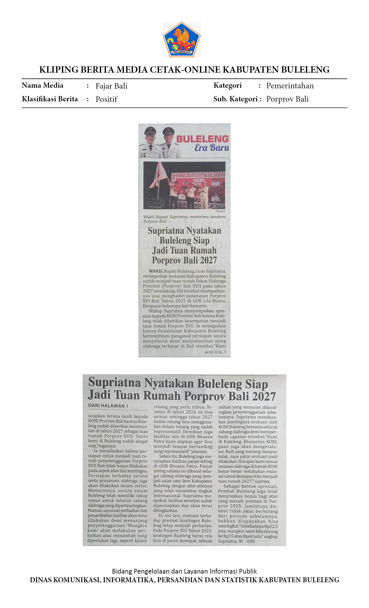 SUPRIATNA NYATAKAN BULELENG SIAP JADI TUAN RUMAH PORPROV 2027