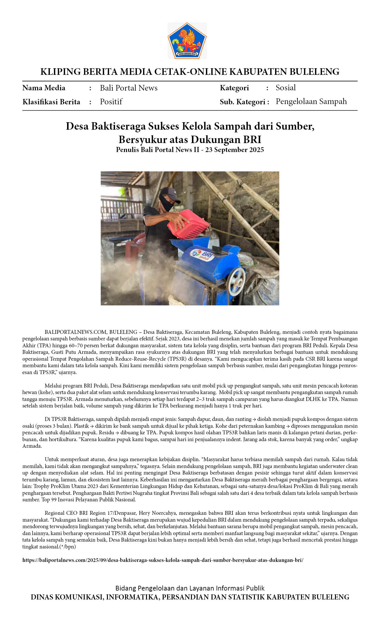 DESA BAKTISERAGA SUKSES KELOLA SAMPAH DARI SUMBER, BERSYUKUR ATAS DUKUNGAN BRI