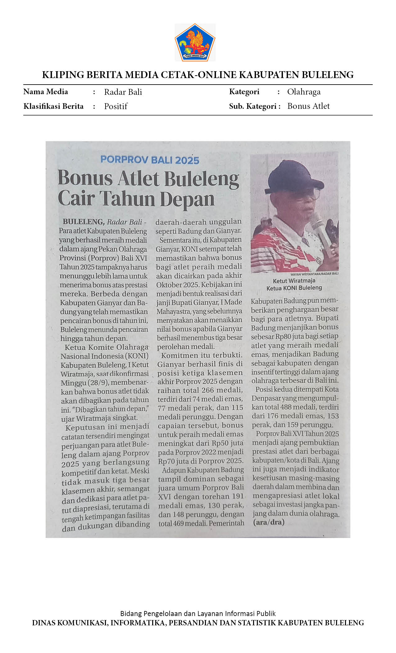 BONUS ATLET BULELENG CAIR TAHUN DEPAN