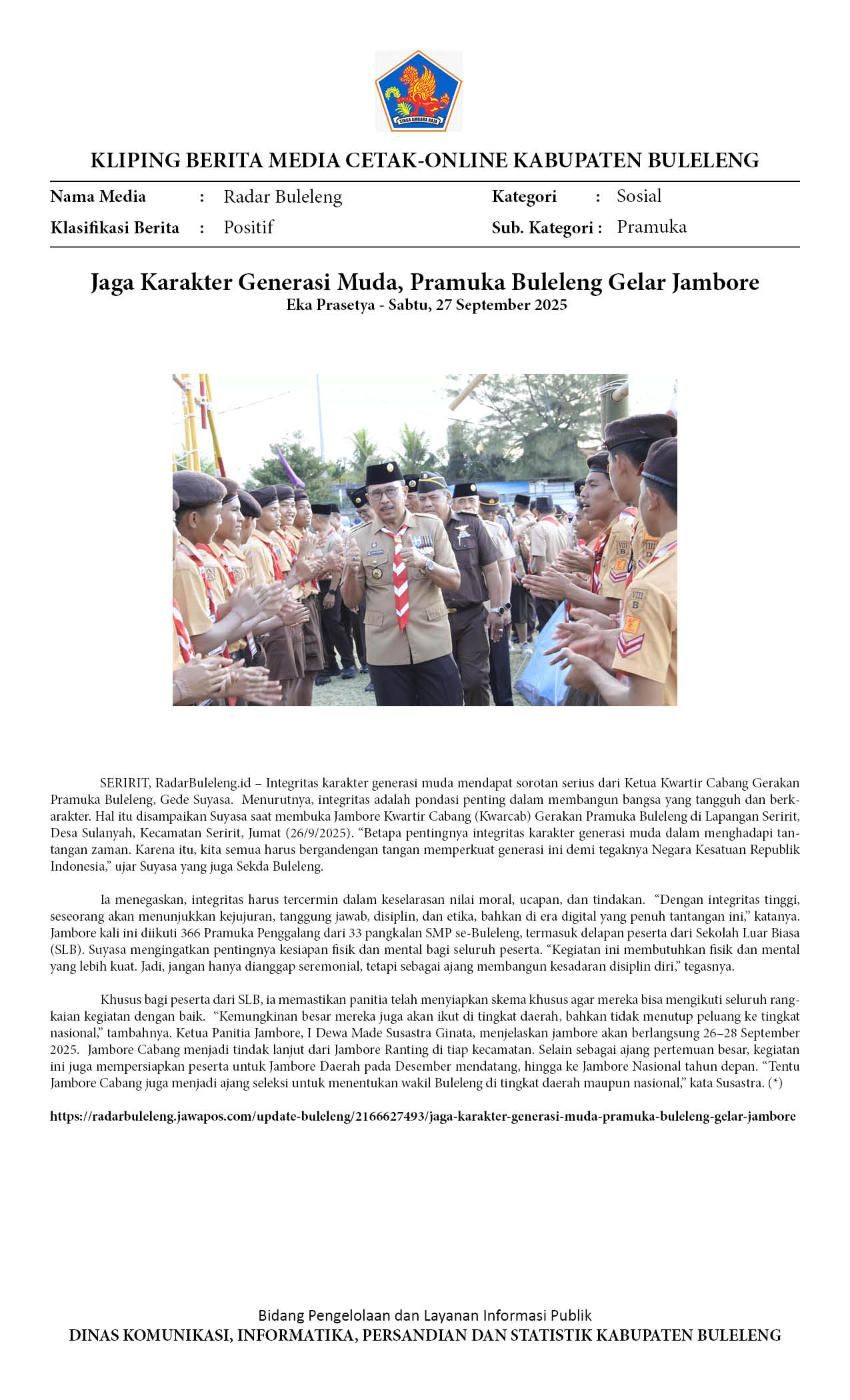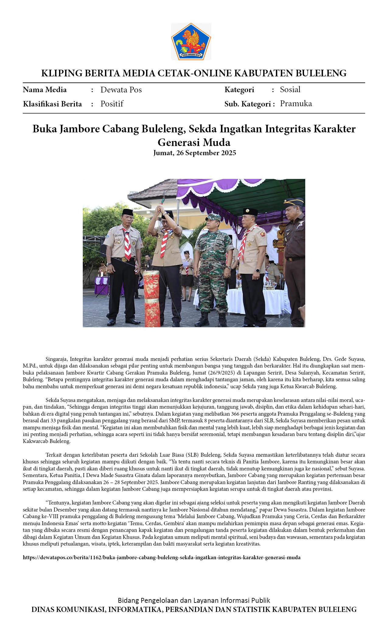 BUKA JAMBORE CABANG BULELENG, SEKDA INGATKAN INTEGRITAS KARAKTER GENERASI MUDA