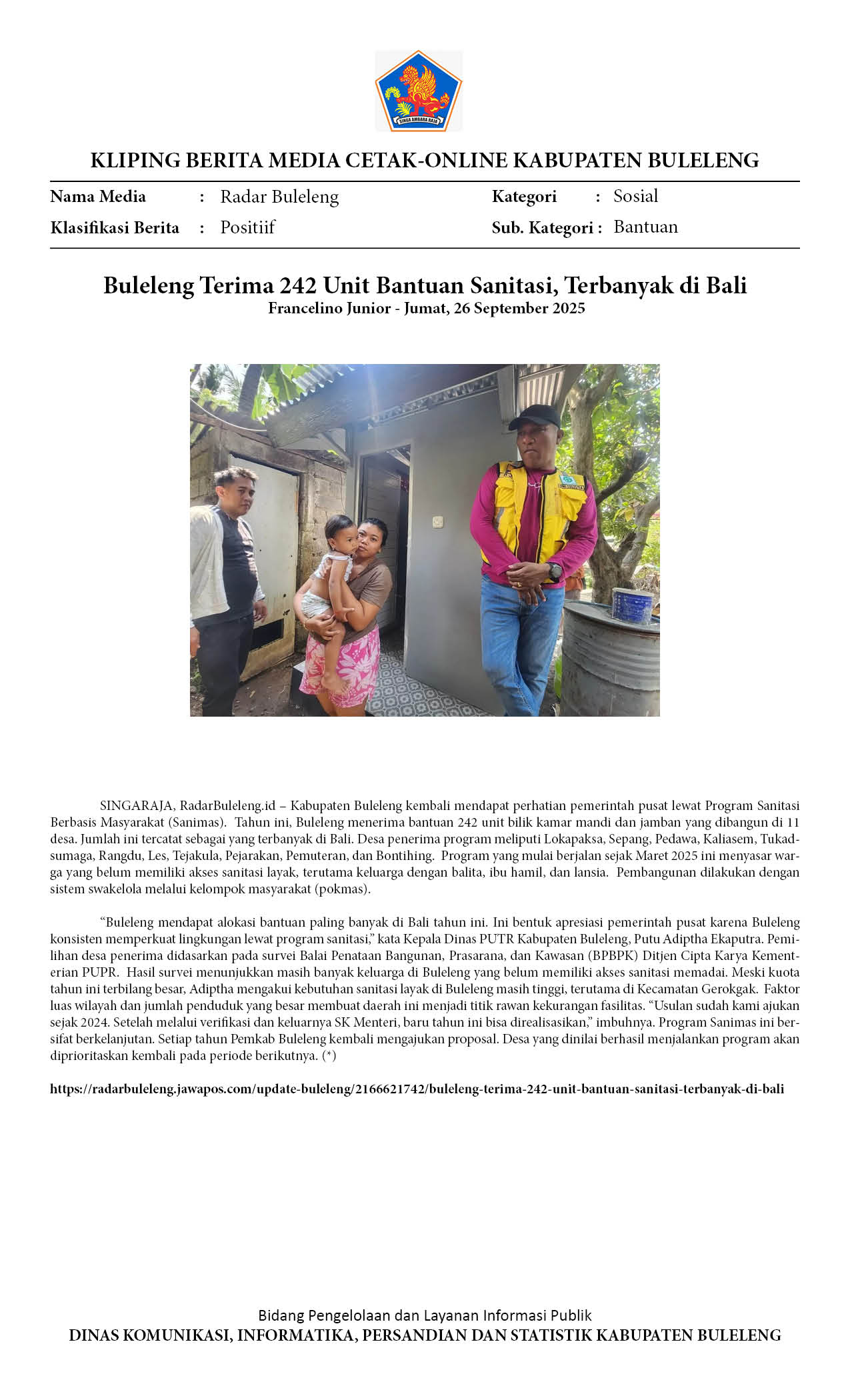 BULELENG TERIMA 242 UNIT BANTUAN SANITASI, TERBANYAK DI BALI