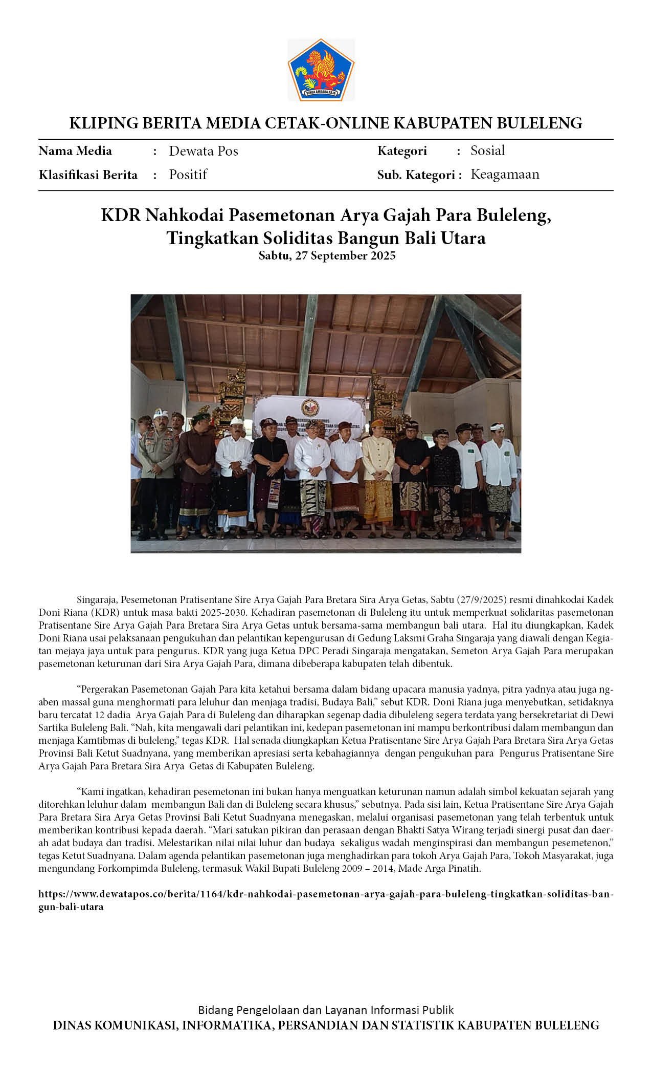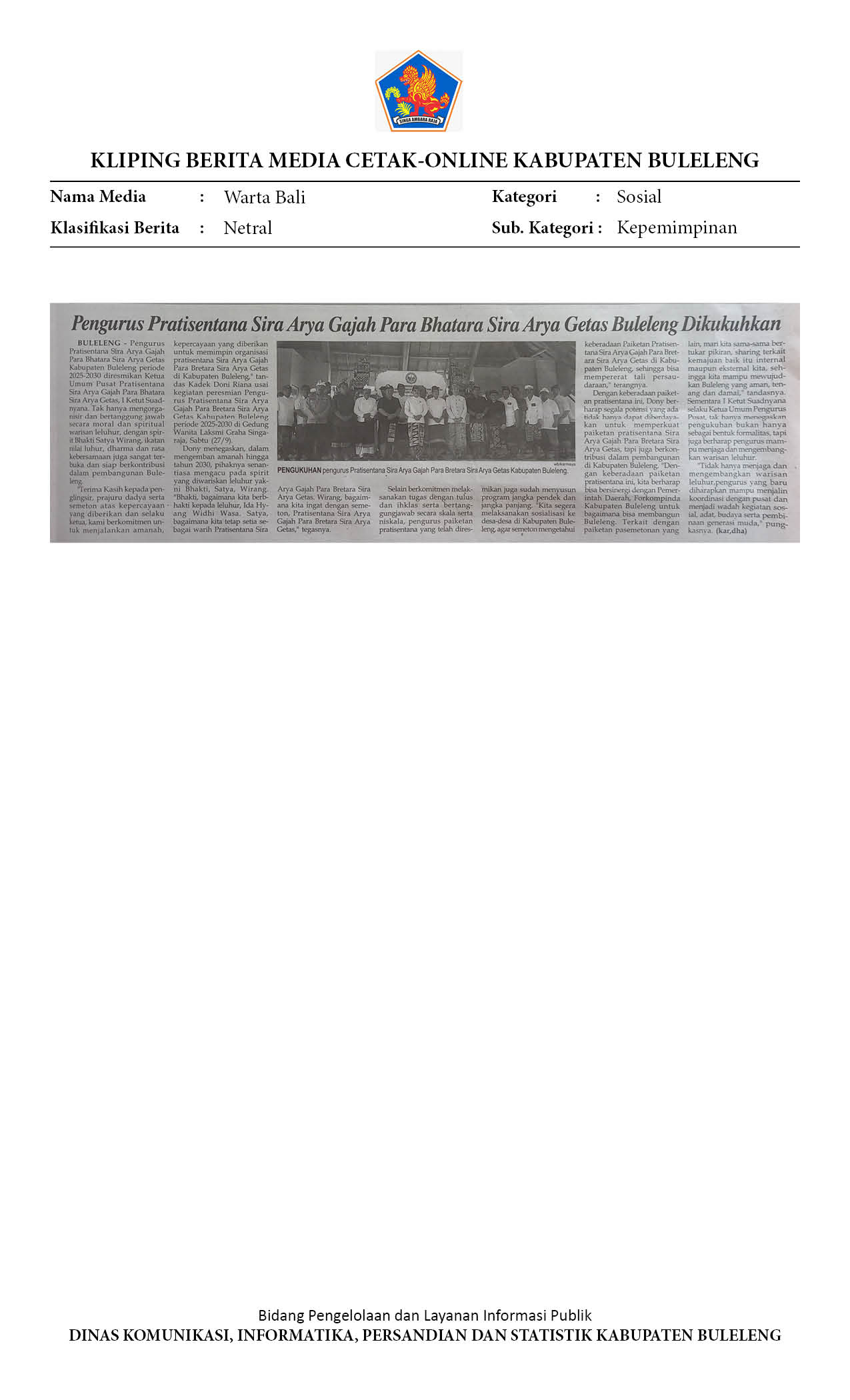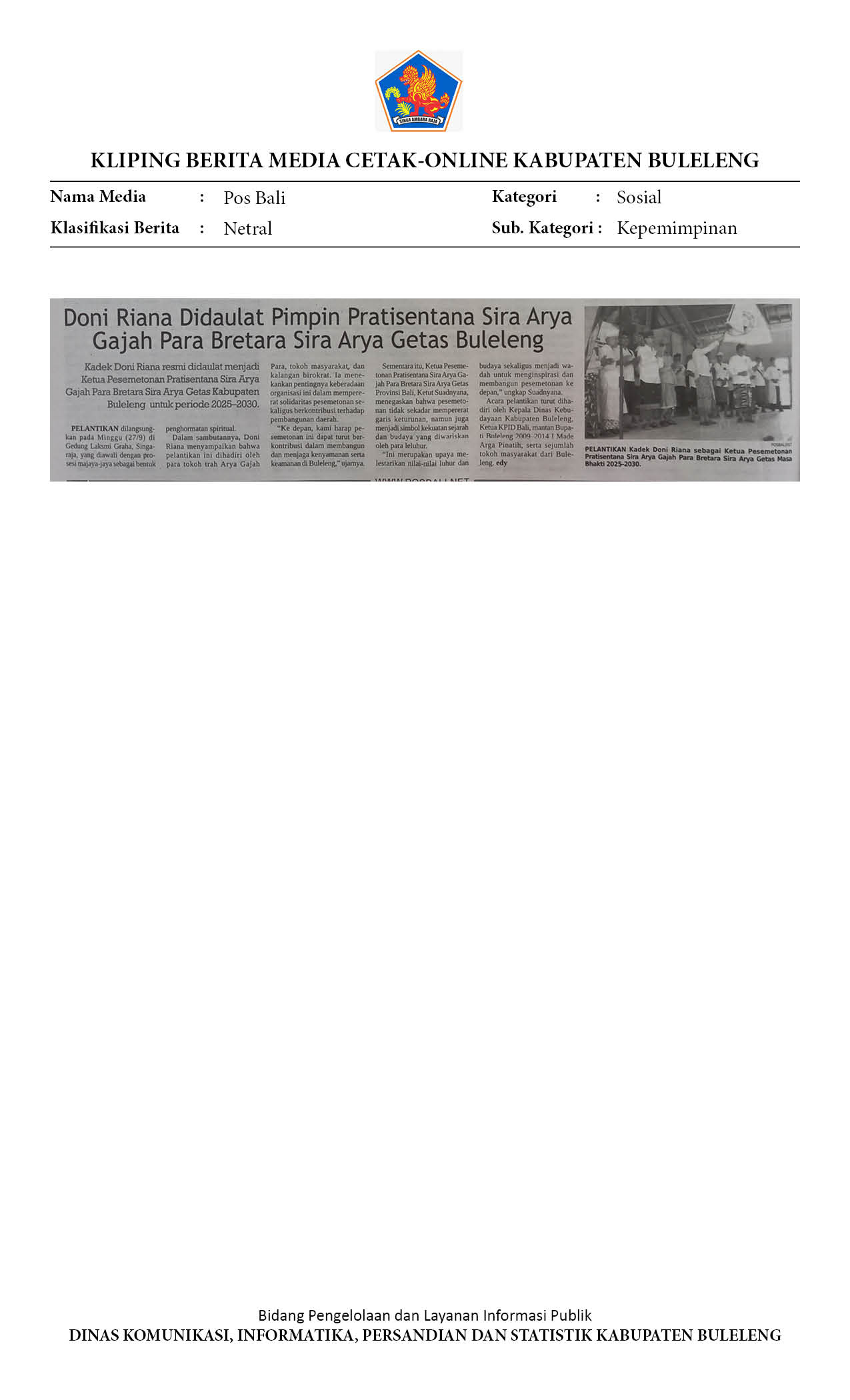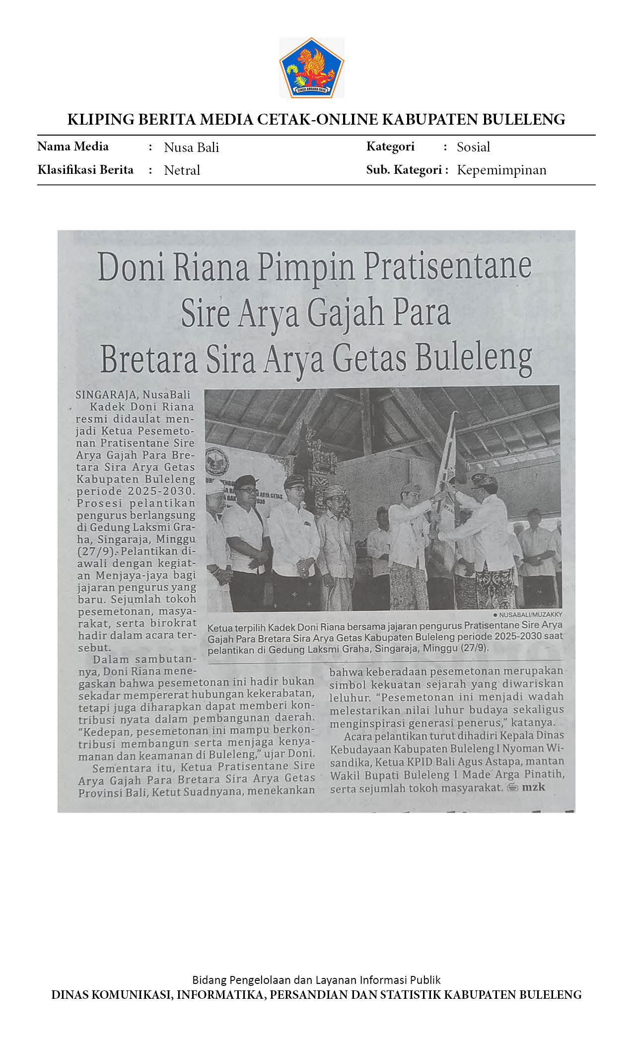 DONI RIANA DIDAULAT PIMPIN PRATISENTANA SIRA ARYA GAJAH PARA BRETARA SIRA ARYA GETAS BULELENG