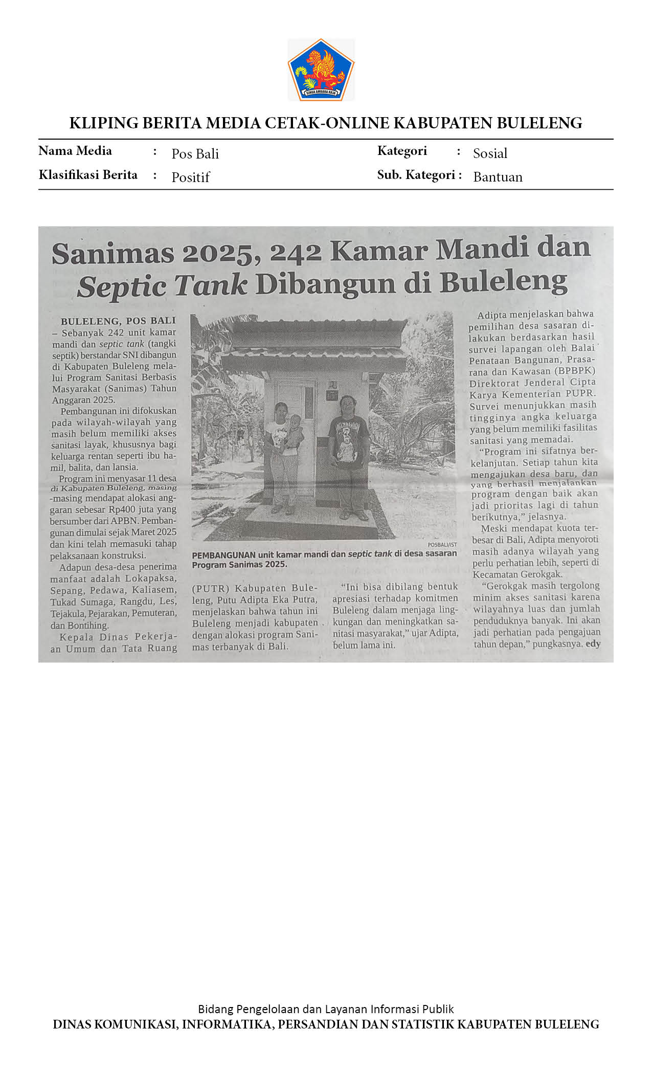 SANIMAS 2025, 242 KAMAR MANDI DAN SEPTIC TANK DIBANGUN DI BULELENG
