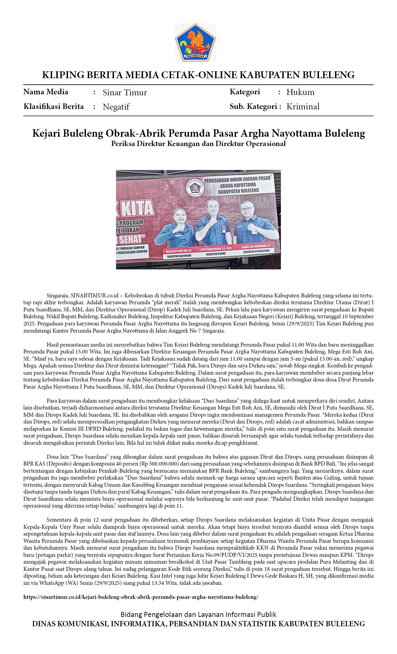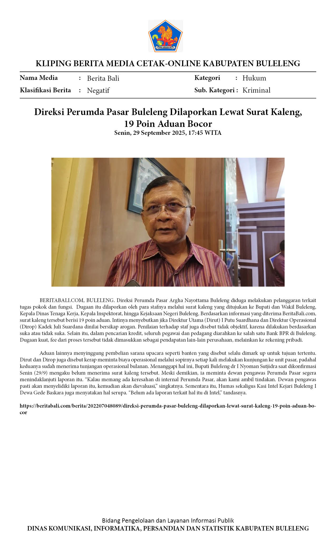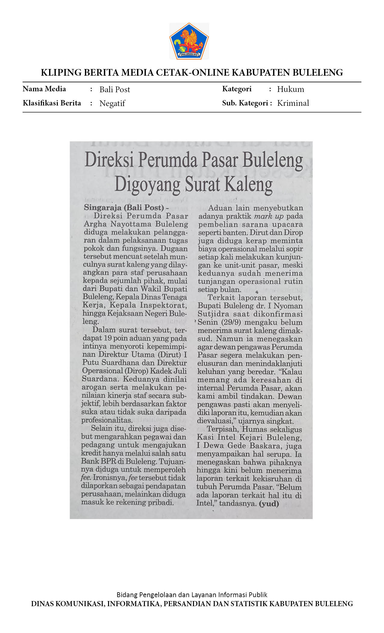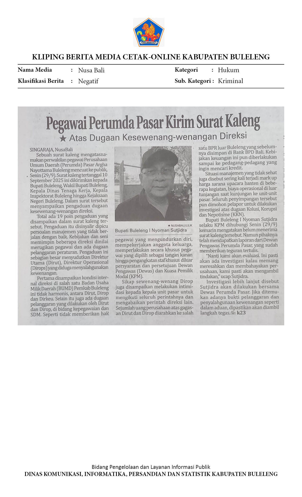 DIREKSI PERUMDA PASAR BULELENG DILAPORKAN LEWAT SURAT KALENG, 19 POIN ADUAN BOCOR