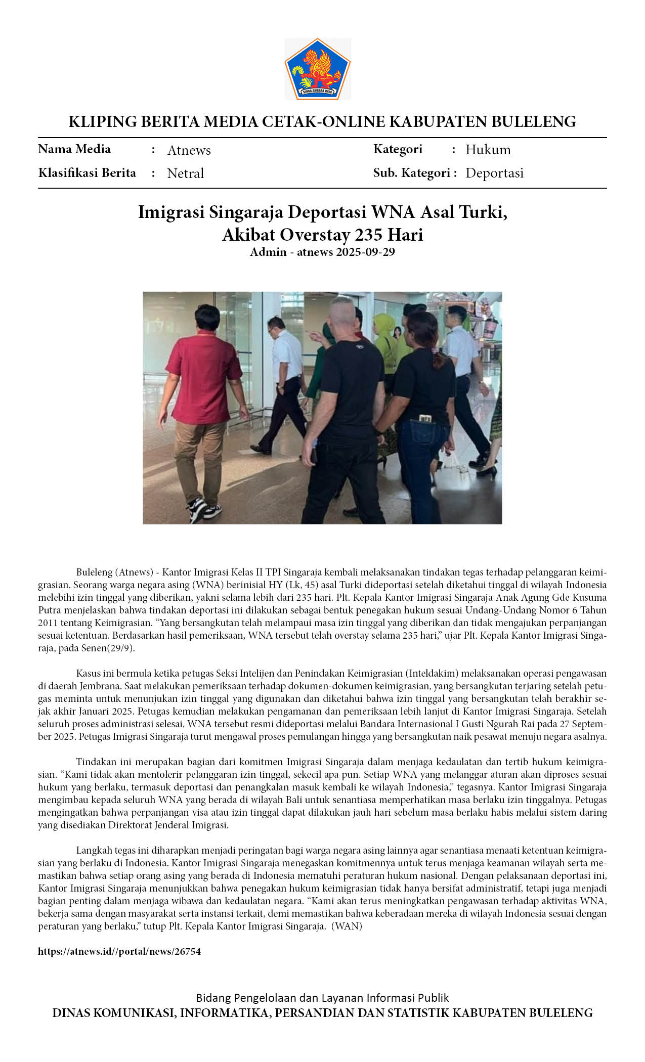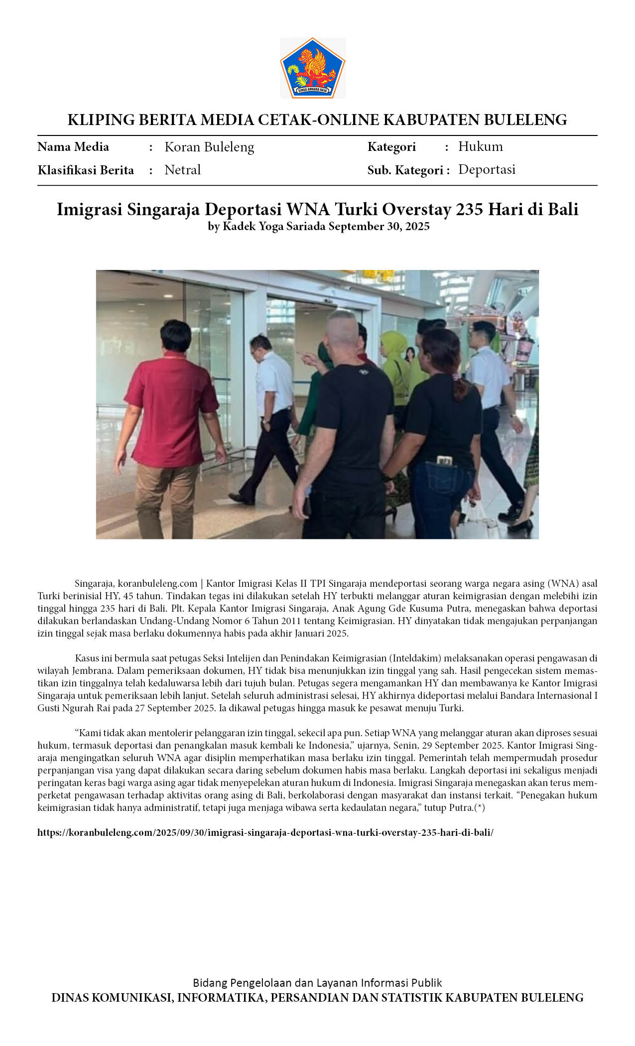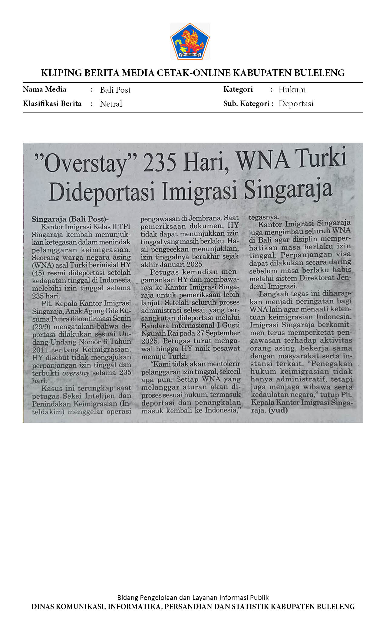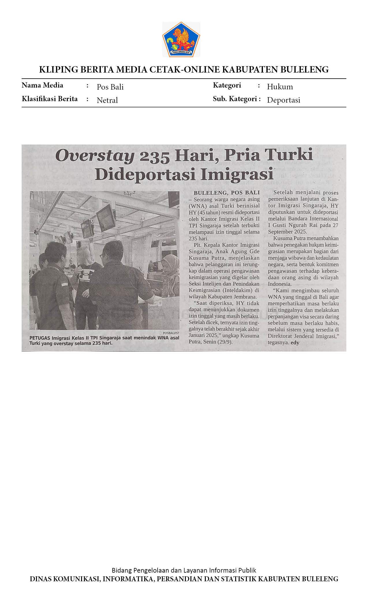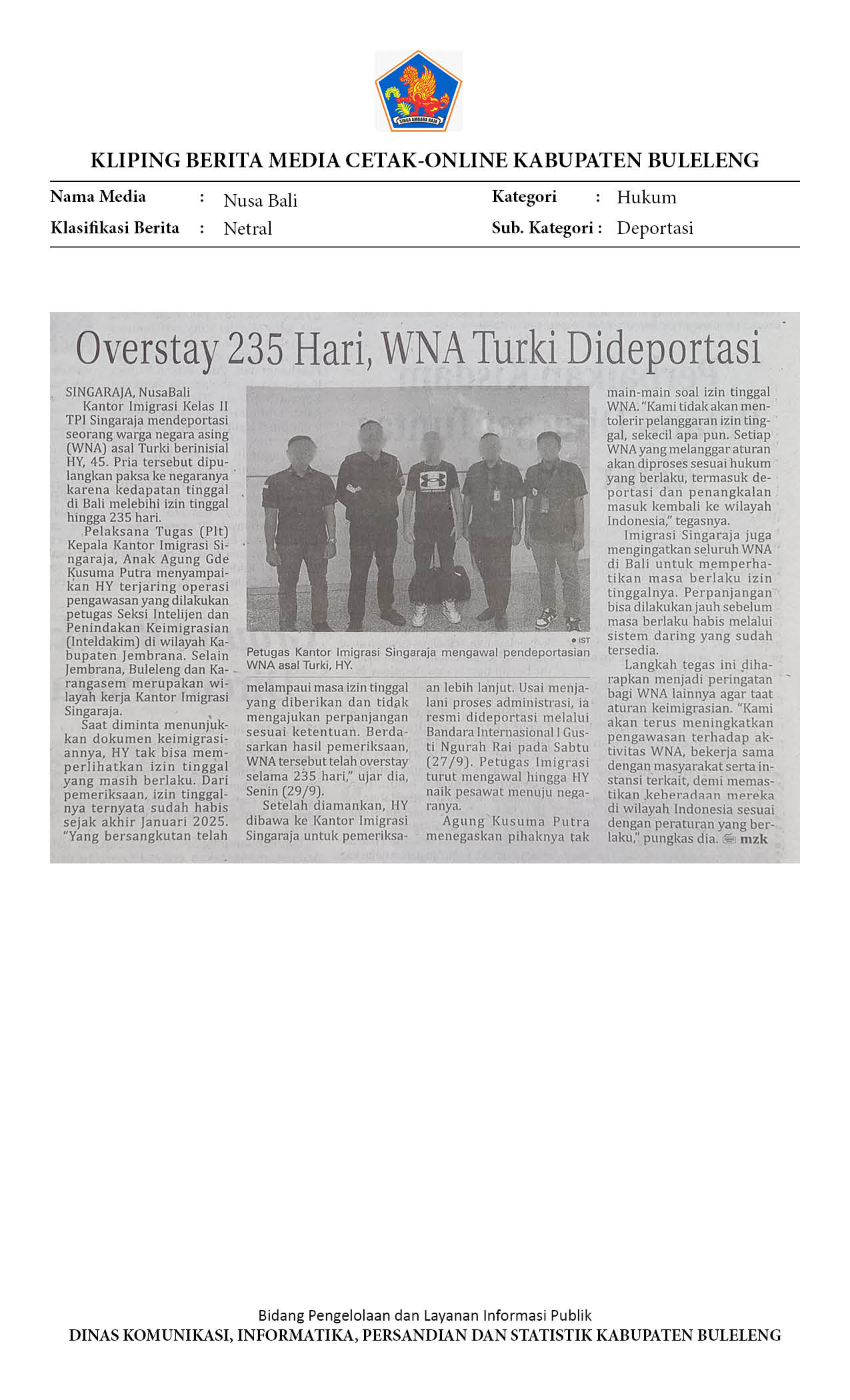 IMIGRASI SINGARAJA DEPORTASI WNA ASAL TURKI, AKIBAT OVERSTAY 235 HARI