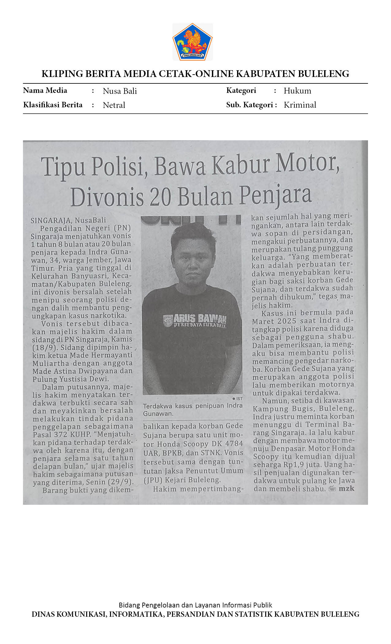 TIPU POLISI, BAWA KABUR MOTOR, DIVONIS 20 BULAN PENJARA