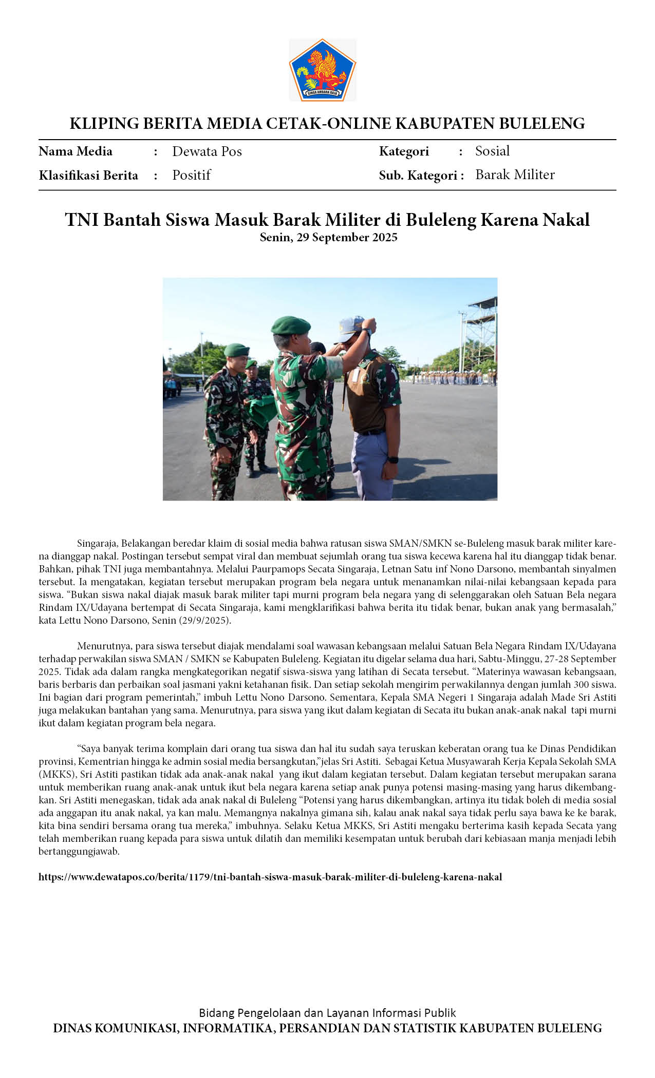 TNI BANTAH SISWA MASUK BARAK MILITER DI BULELENG KARENA NAKAL